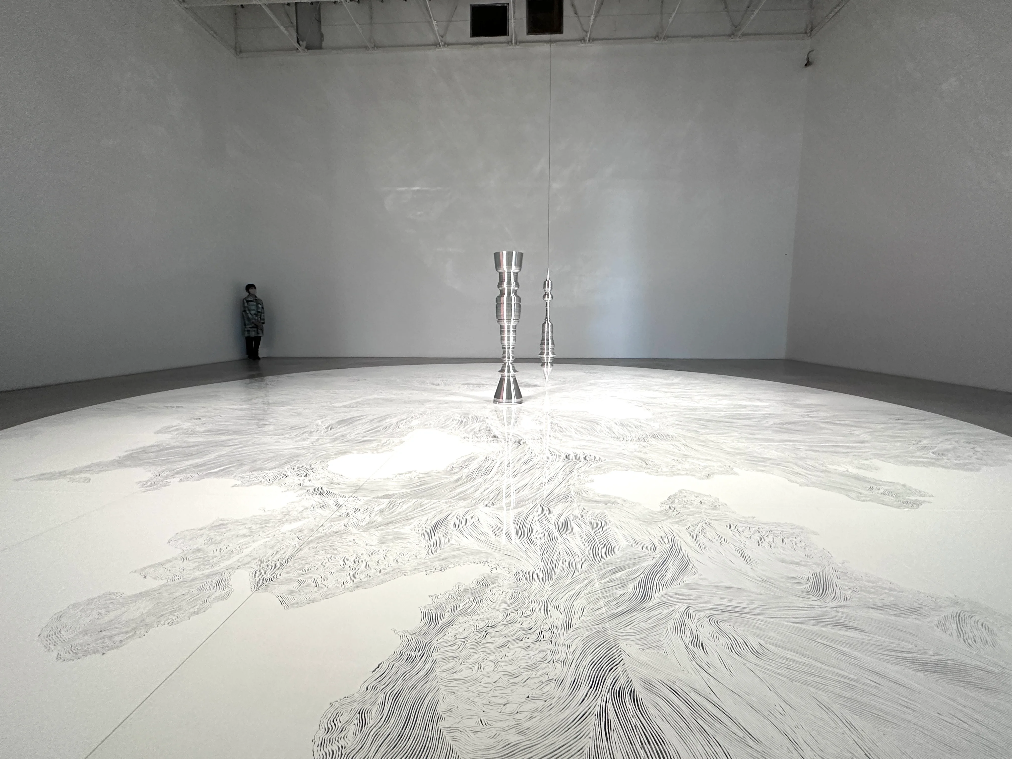「存在」とは何かをテーマに制作活動を展開し、近年では国立新美術館での個展も話題となった大巻伸嗣は、大陸を表す床の円盤とオブジェ、静かに動く振子からなる《Plateau 2024》(2024)を発表。中央に直立するオブジェは大和堆の上の空と海を、盤上を静かに動く振子には大和堆の大地(地形)を表した様々なデータにもとづく溝が刻まれており、大巻は「不確定な未来についての線の引き方を想像してほしい」と話す。作家が考える時間、空間、記憶などが折り重なる本作は、じっと眺めていると瞑想的な気分に誘われる。