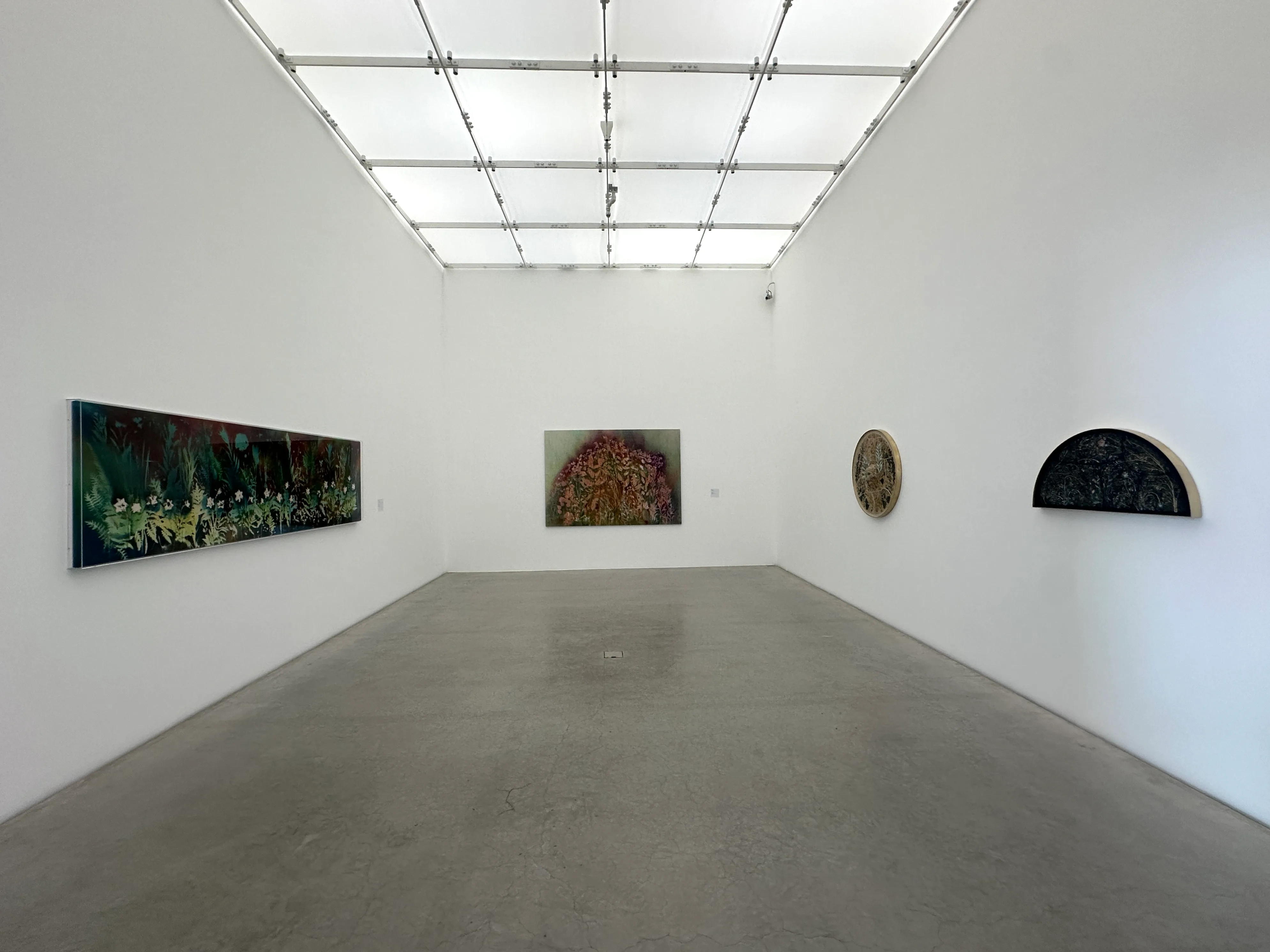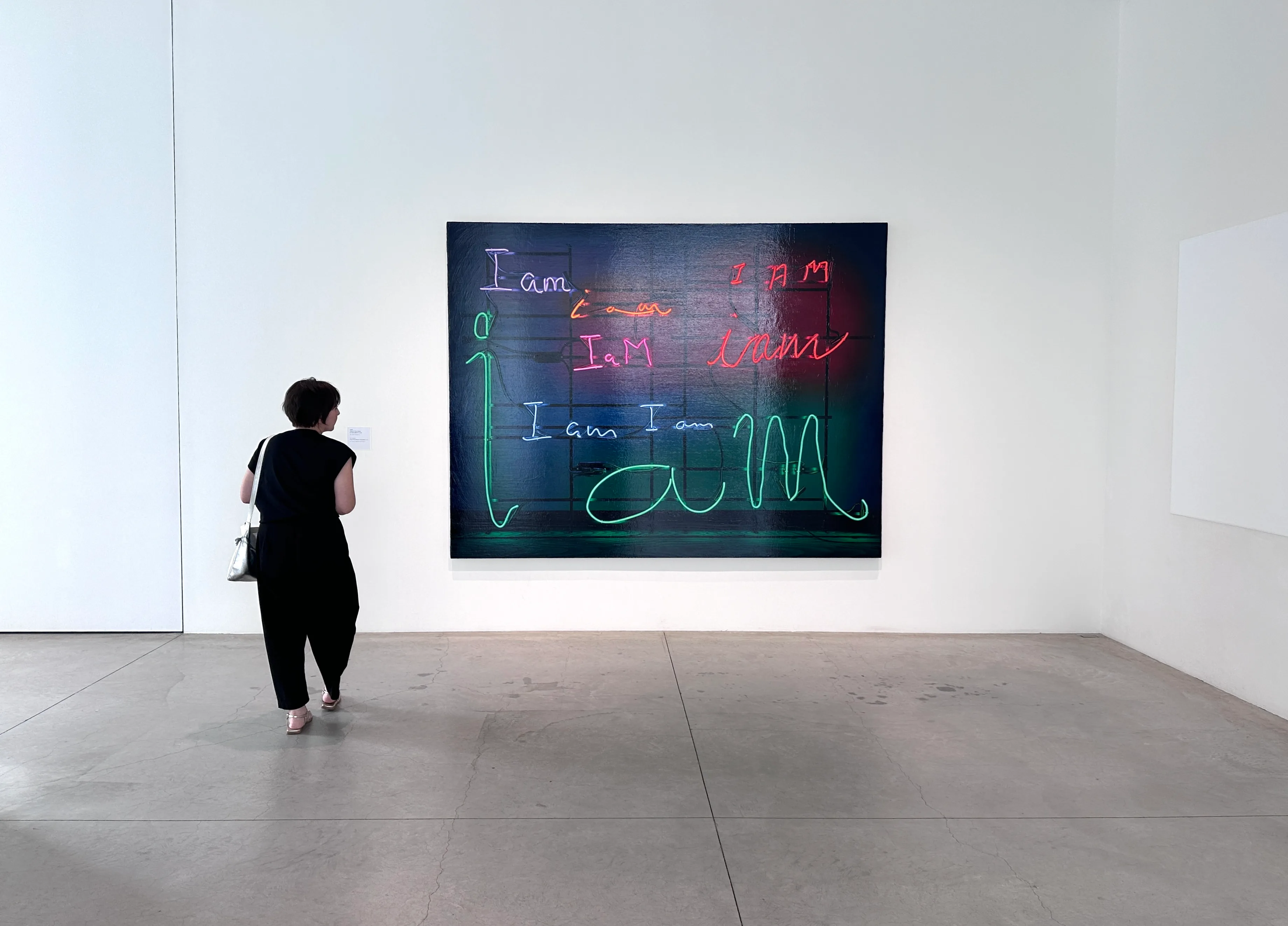 画家の横山奈美は、作家の代表スタイルのひとつでもあるネオンをモチーフとした絵画《Shape of Your Words[In India 2023/ 8.1-8.19]》(2024)を出品。関わる人々に寄せ書きのように書いてもらった文字を業者がネオン制作し、横山が絵画として描くことで、人々の新たなポートレイトとなる。本作では、横山がインドで出会った人々が描いた「I am」の文字を作品化。「ネオンと言葉の構造が似ていると思ったのをきっかけにネオンを描き始めました。言葉は形があって意味が存在するがそれだけではなく、人の数だけ言葉の解釈は広がっていく、1本の線から枝分かれして無限に広がっているイメージ。そんなふうに私の作品を見てもらえると嬉しいです」(横山)。