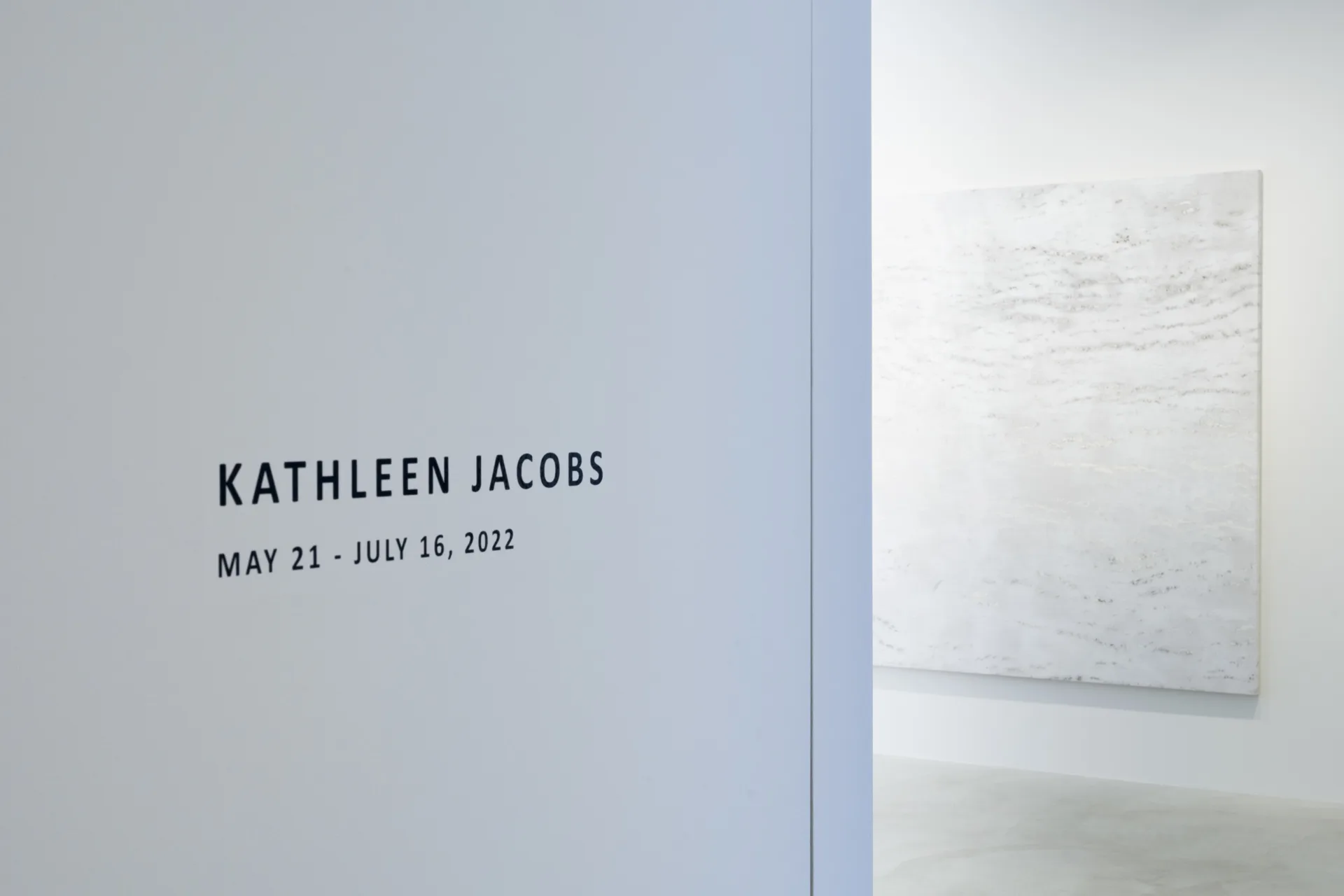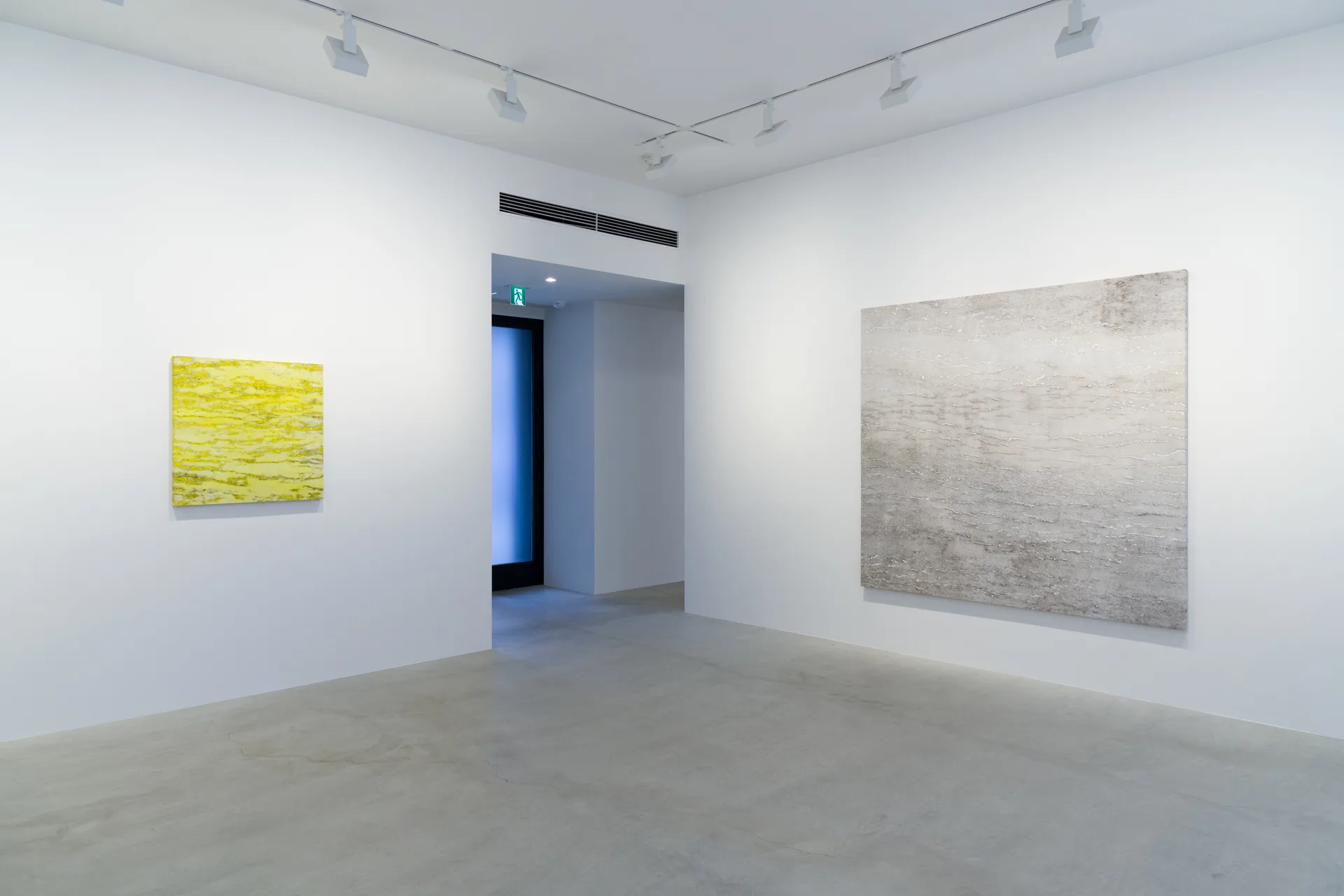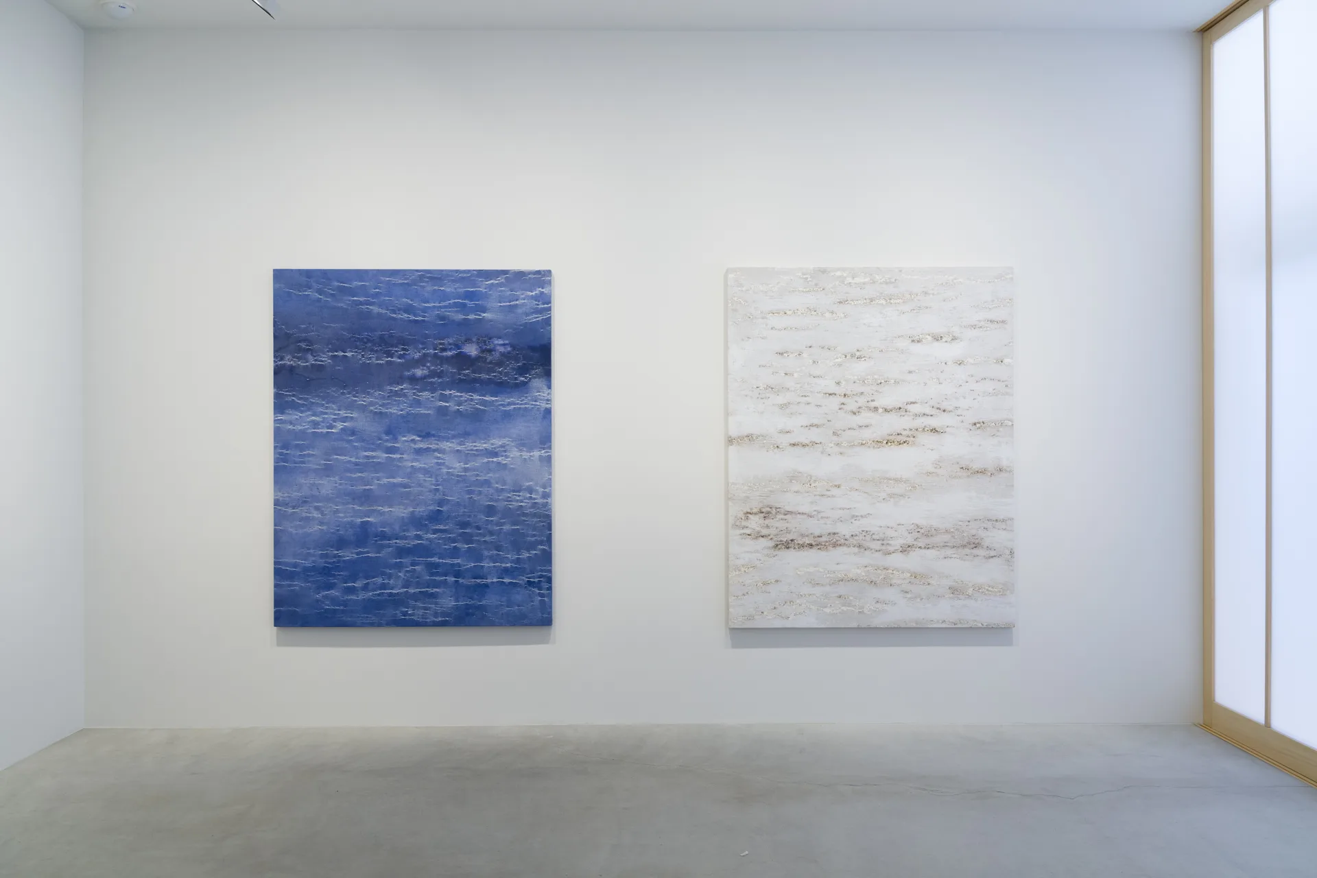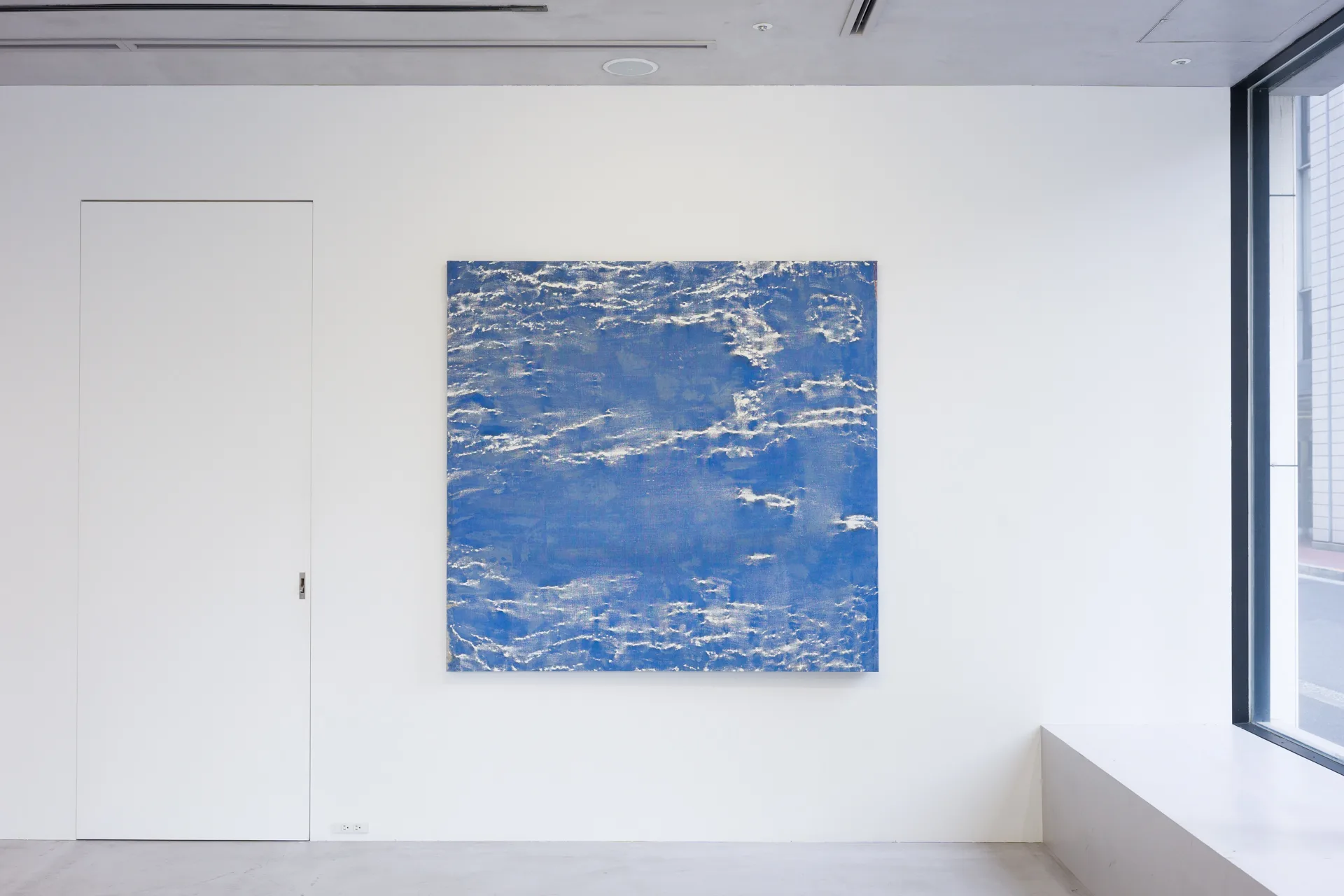 ──今回初めてジェイコブスさんの作品を拝見しました。わずかな色彩と線だけで構成されたミニマルな抽象絵画ですが、山水画のような空間性を感じさせ、作品によっては青色にきらめく海景やモノトーンの雪景色のようにも見えます。野外に画布を置くことで生じた絵具の滲みや染み、褪色といった複雑なテクスチャーも魅力的で、炎に焼かれ偶発的にできる陶器の「景色」を思い出しました。アジアでの初個展をどのように感じていますか。