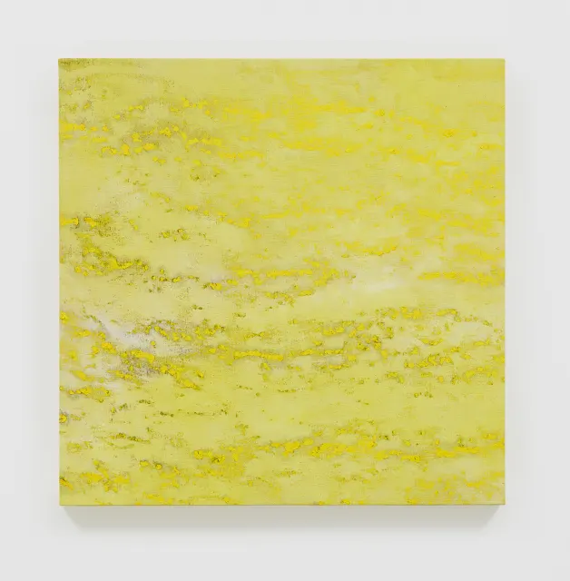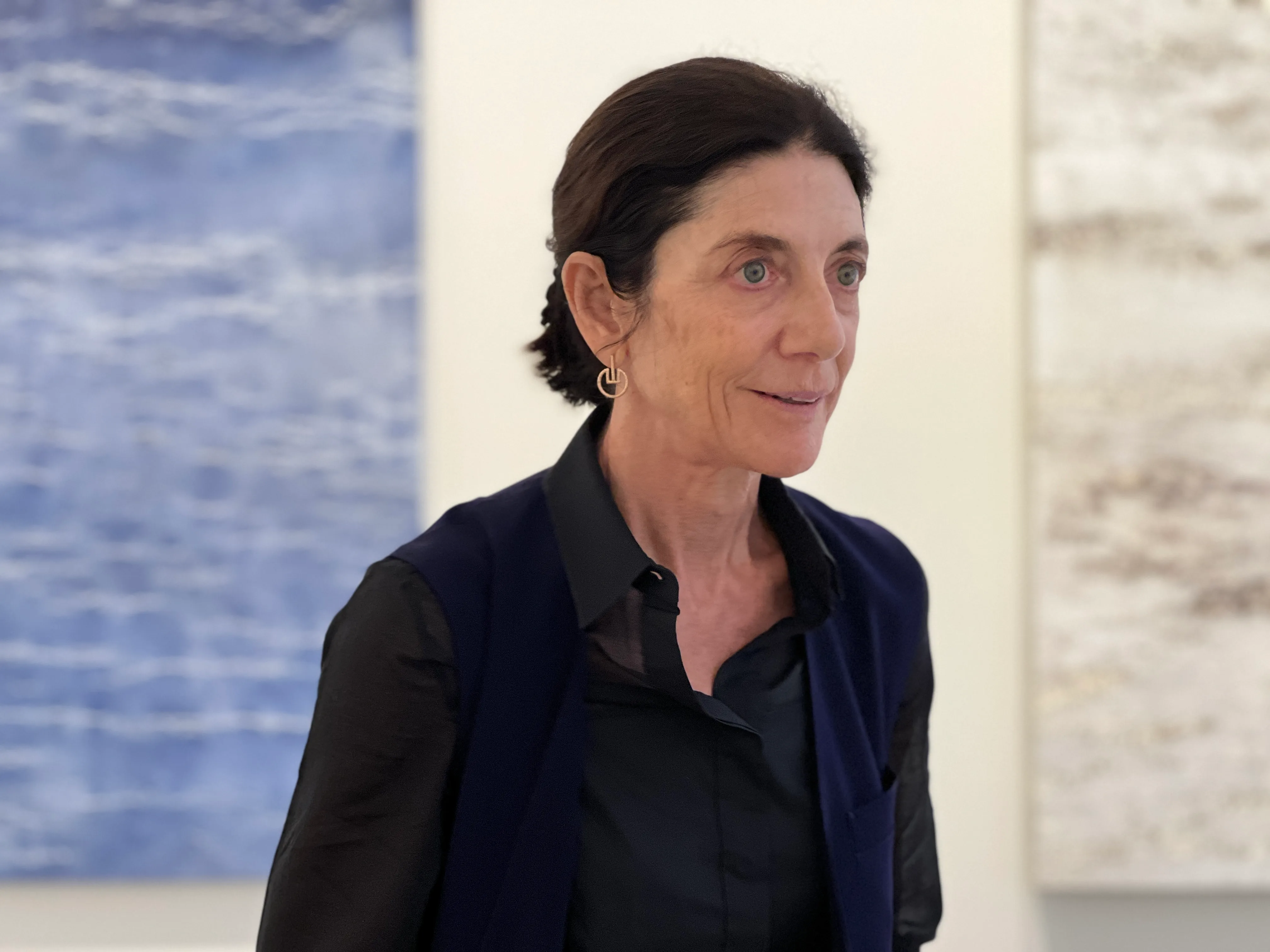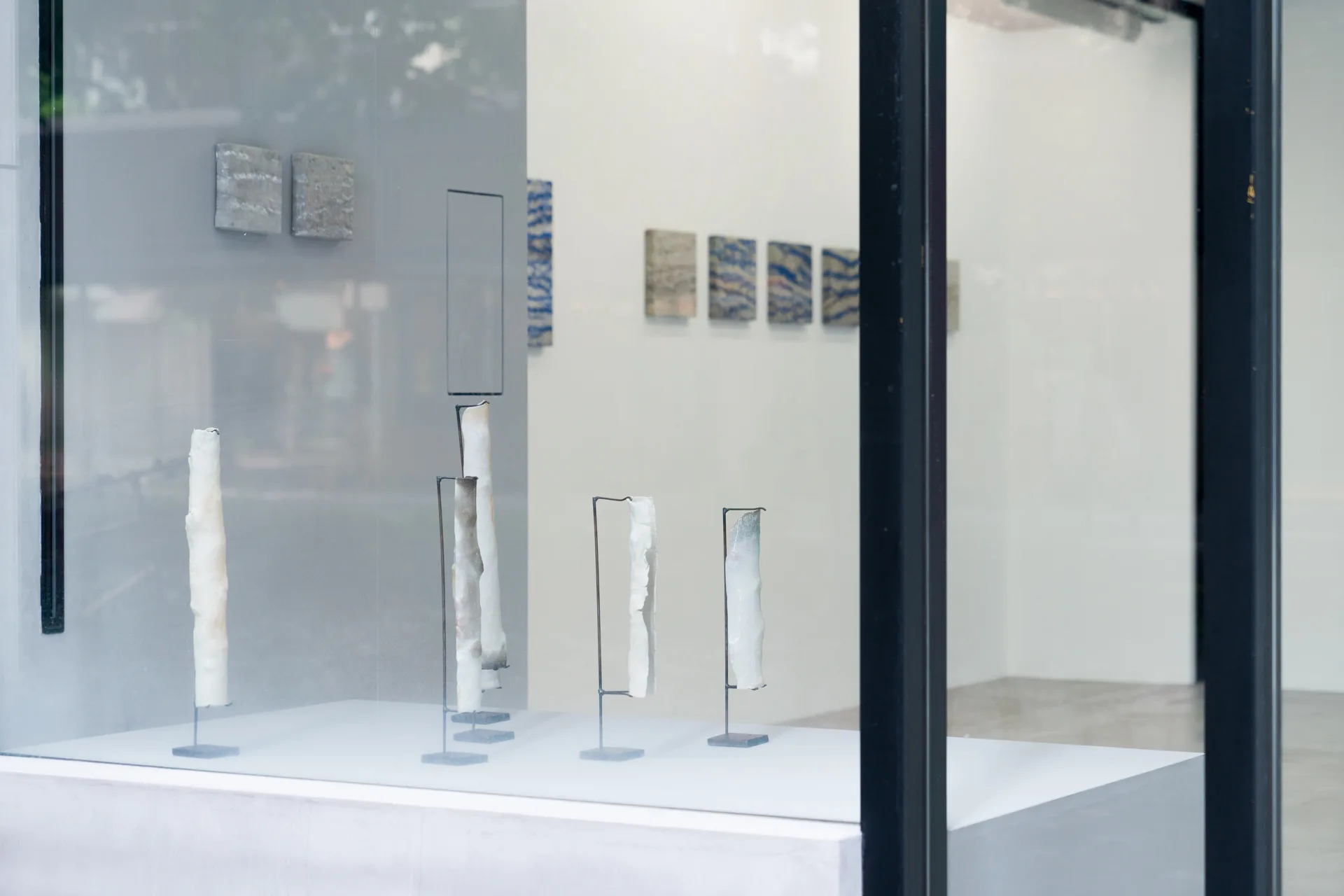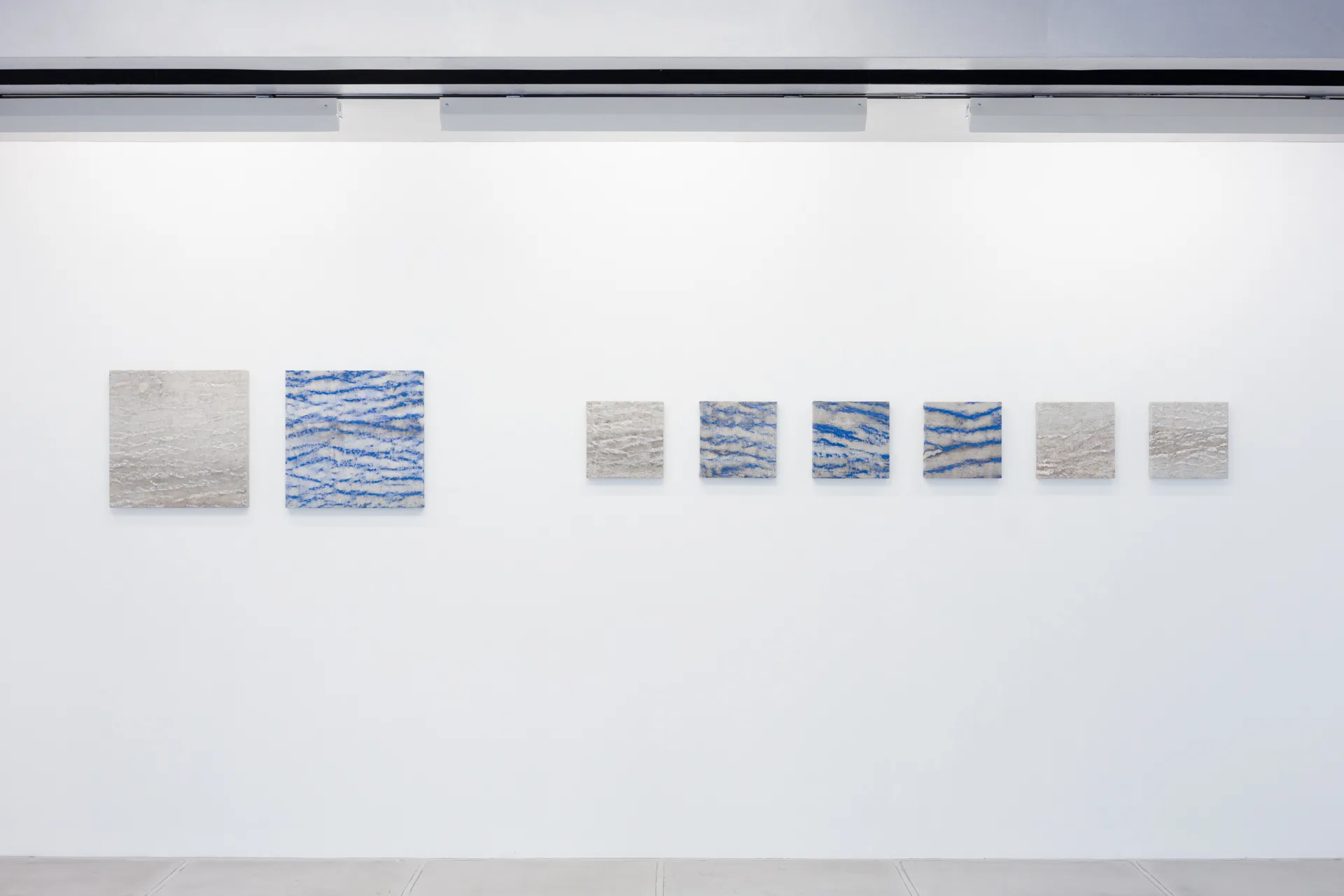 ──今回初めてジェイコブスさんの作品を拝見しました。わずかな色彩と線だけで構成されたミニマルな抽象絵画ですが、山水画のような空間性を感じさせ、作品によっては青色にきらめく海景やモノトーンの雪景色のようにも見えます。野外に画布を置くことで生じた絵具の滲みや染み、褪色といった複雑なテクスチャーも魅力的で、炎に焼かれ偶発的にできる陶器の「景色」を思い出しました。アジアでの初個展をどのように感じていますか。