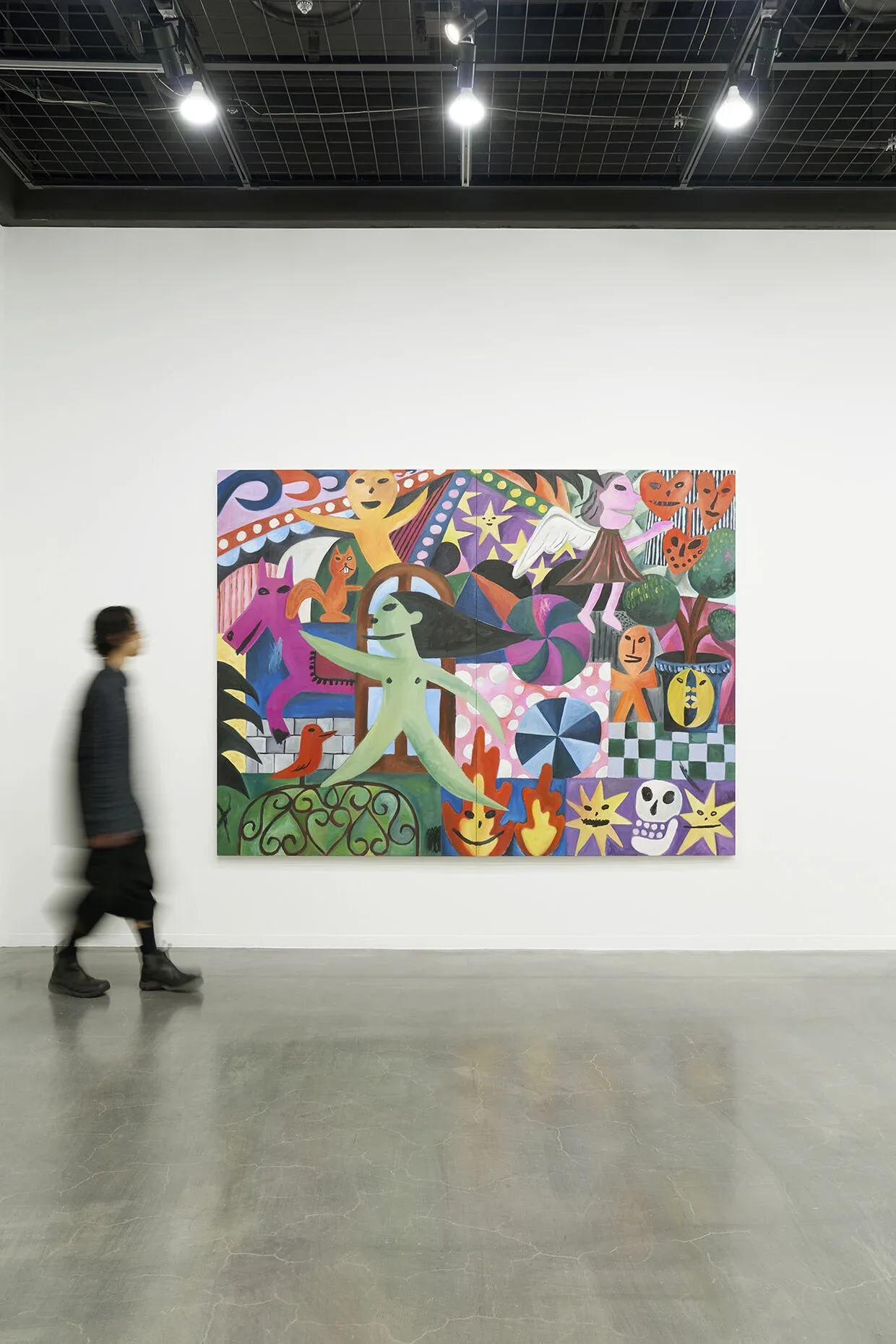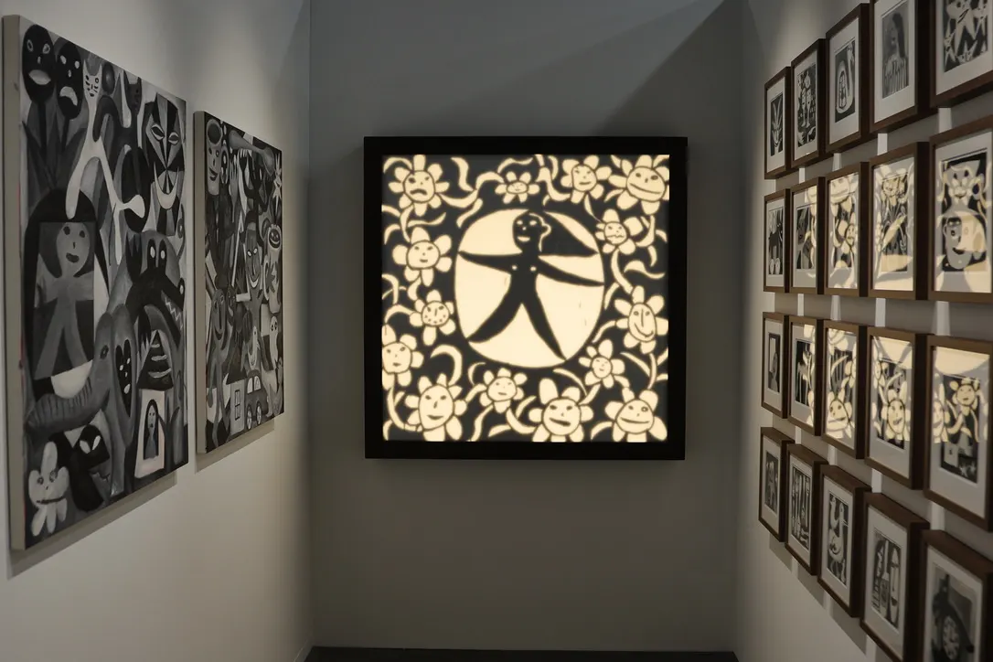 会場のDIESEL ART GALLERYに入ると、左手に大型の作品が、正面の壁には正方形の中型の作品がグリッド状に配置されている。その右手にはまた大型の作品が並べられており、少し見回せばその先にもモノトーンの作品が飾ってあるのが視界に入ってくる。でも、なによりもまずは足を踏み入れたその時点で、様々に描かれている彼の妻であるミューズへの簡単ではない想いが、観る側の気持ちを大きく動かすだろう。それは、目の前のキャンバスに躍動する色と形を通してこちらに伝わり、愛といいたくなる価値を感じる、極めて美術的な体感である。