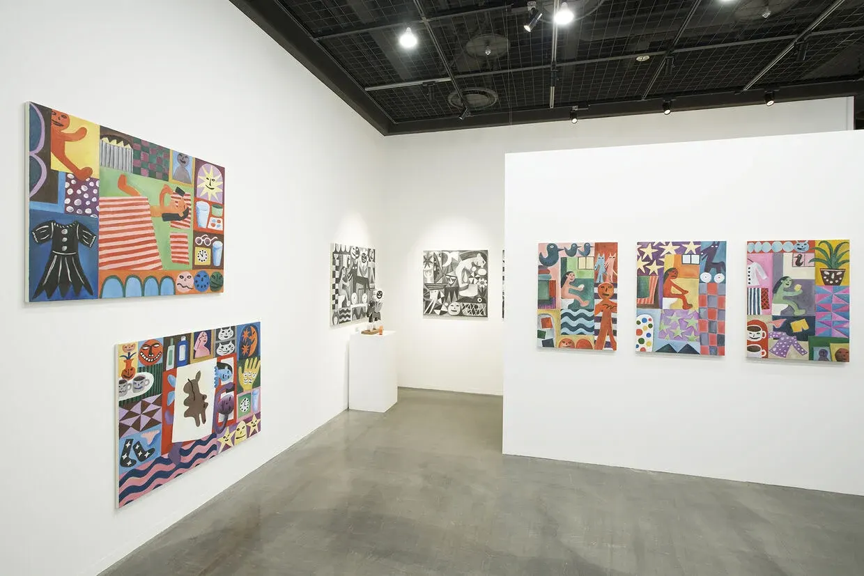 彼の作品が後ろを向いているのではないと、誤解にはここで異をとなえておく。ライヴ・ペインティング、グラフィック・デザイン、絵本など幅広い表現の領域での経験を経た大河原による「MUSE TAKING A SHIT」では、各作品の"ミューズ"と展示空間が、いわゆる大文字の「美術」だけではない、都市に溢れるほかの視覚表現、すなわち2020年代の色と形のリズムと共にダンスするように戯れる。