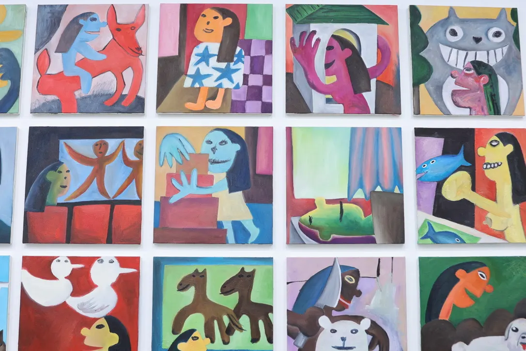 大河原の「MUSE TAKING A SHIT」に並べられる作品では、そのような切り替えを経ながら「自分のなかでは普通のこと」として、ミューズだけではなく彼が経験した光景に存在するもの——生き物でも無機物でも——に対して、等しく視線という名の愛が注がれる。その姿勢は、たとえば「ホウキがあったらホウキに顔描いたりとか、子供がやってるようなことの延長線上にある」と彼が語るようなナイーブさの肯定にも通じる。ここでは大河原の視線がとらえた色と形を通して、愛が偏在し、等しく空間を満たしている。