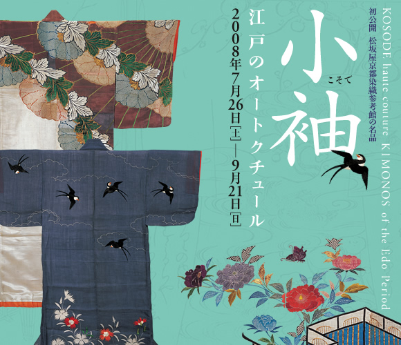 本展では、当時の小袖700点あまりが集められ、意匠の別に展示されている。意匠は大きく3つの分野に分かれ、その3つとは、松竹梅や葵、紅葉、菊、桜などの植物模様(季節感を感じさせる)、日用品を表した模様(雅な王朝文化を思わせる)、詩歌や物語を表した模様(源氏物語、伊勢物語の1場面や、文字そのものを描いたもの)であるが、なかでも日用品を表した模様は、例えば洗濯物が干された縁側や、飼い犬が駆け回る様子や、琴などの楽器が描かれ、それを身にまとう人の趣味だとか、人となりのイメージが膨らんでくるから面白い。