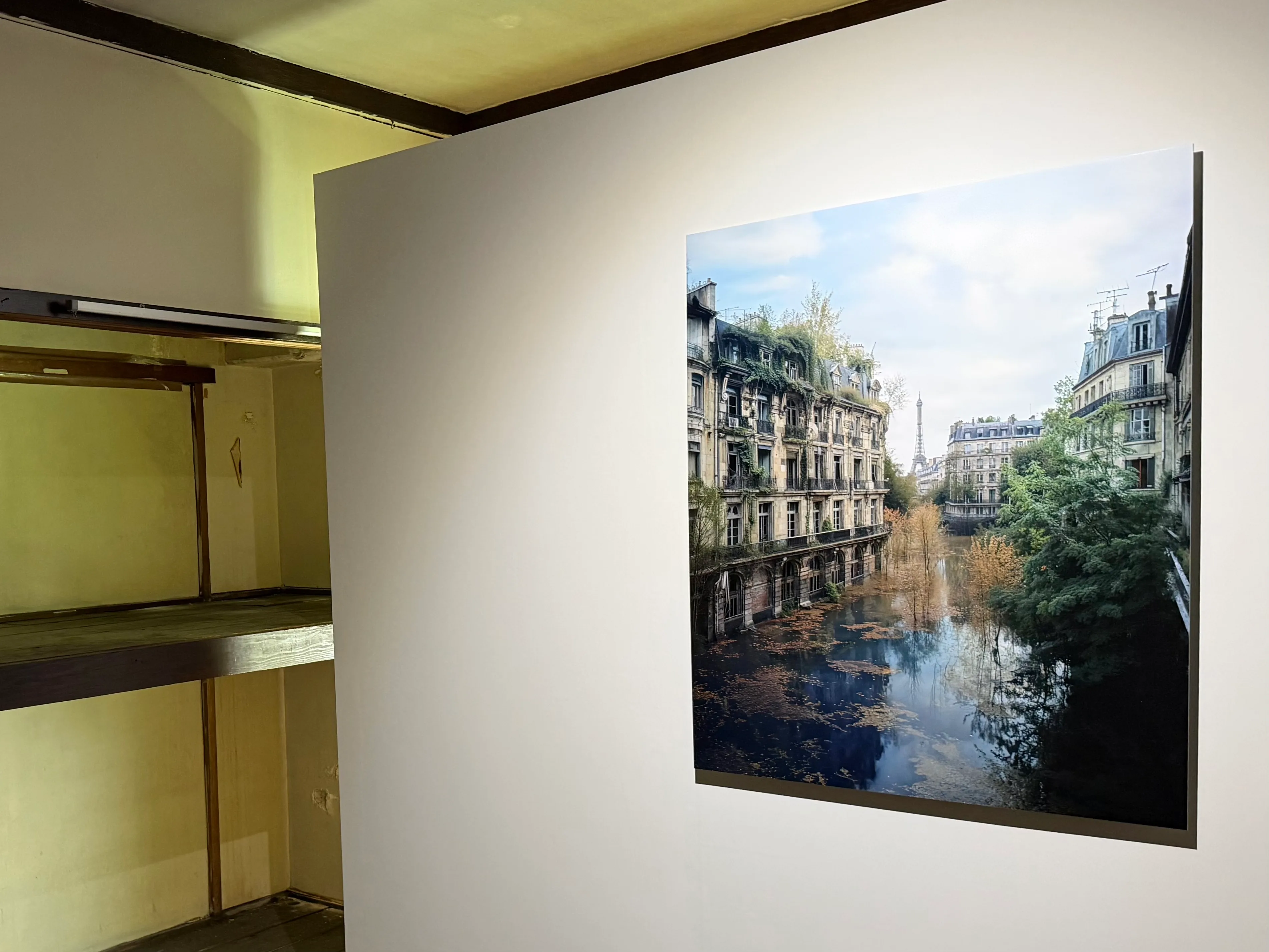 「写真は長いあいだ、そこに存在した現実を映すものとされてきました。しかし生成AIの登場が、その前提を大きく揺るがしています」とふたりは語る。今回の新作《Les Ruines de Kyoto》(2025)では、生成AIを用いて京都を荒廃した風景へと変貌させた。1871年のパリ・コミューン後、当時の写真家たちは焼け跡の首都を記録した写真アルバム『Les Ruines de Paris』を残している。ふたりはその題名を受け継ぎ、パリと京都を「終末後」の景色として作り出した。