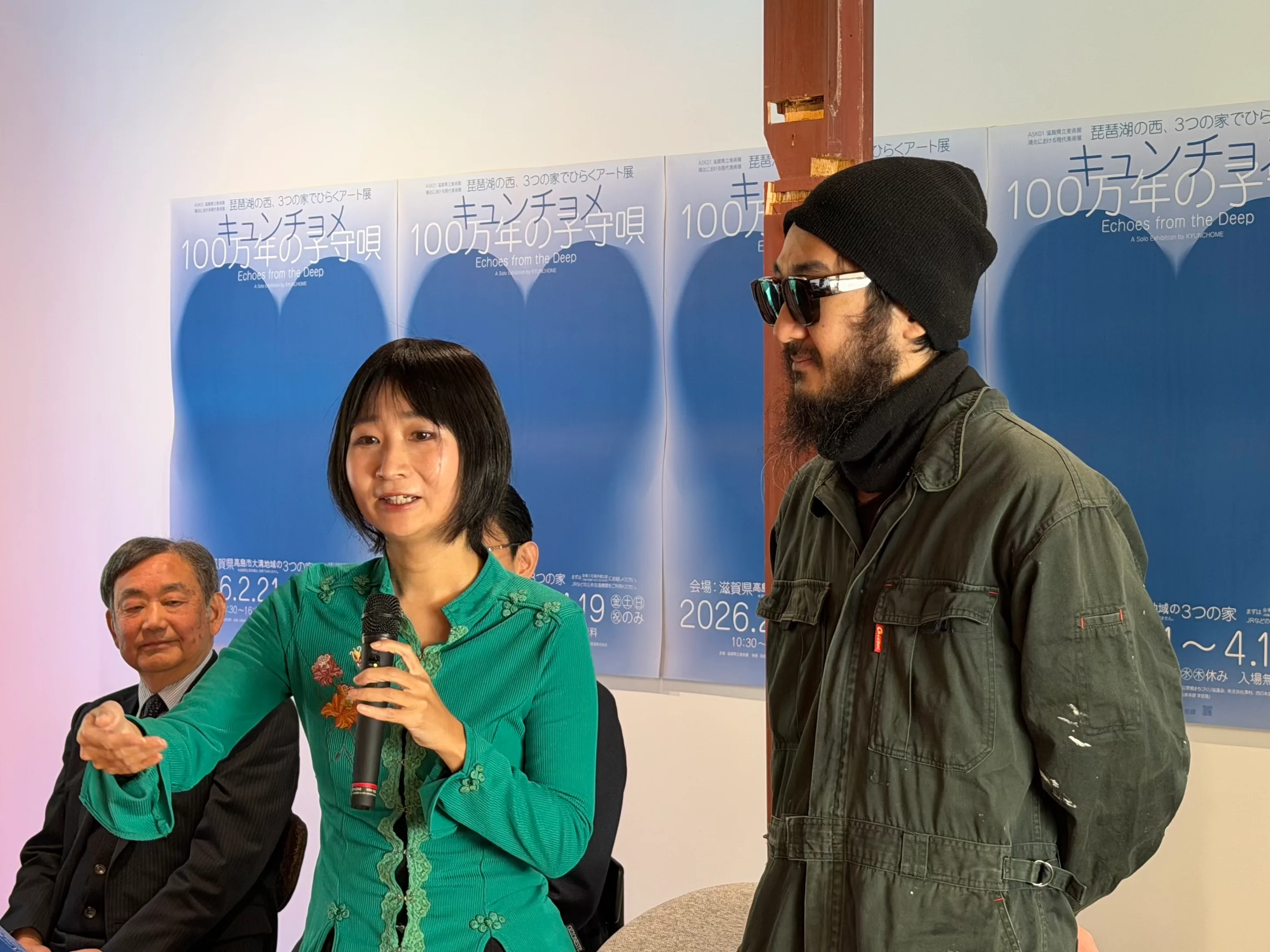 展覧会タイトルである「100万年の子守唄」は、古代湖・琵琶湖の悠久の時間と、水とともに暮らしてきた大溝の環境から着想を得ている。キュンチョメは初めてこの地を訪れた際、「町全体に張り巡らされた溝がすべて水路だとわかって、ここは水に抱擁される場所だと思った」と語る。さらに山から流れてきた水が琵琶湖へ集まる様子を見つめながら、「いろんなところからやってきたものが最終的にここに集まるように感じた」とこの町の特性について話した。