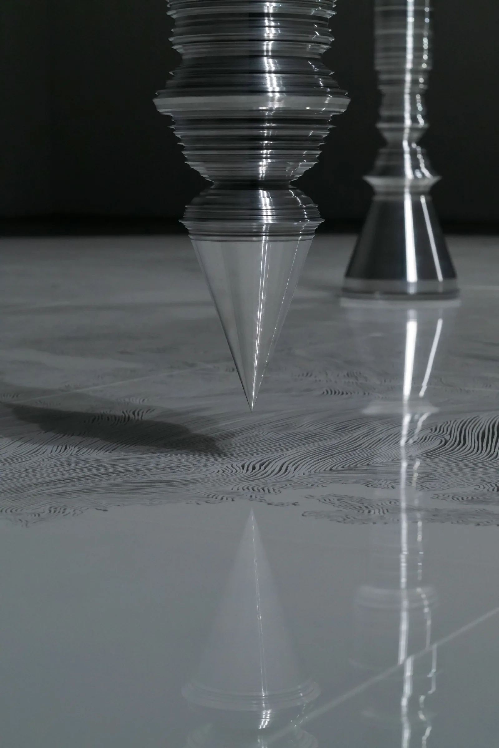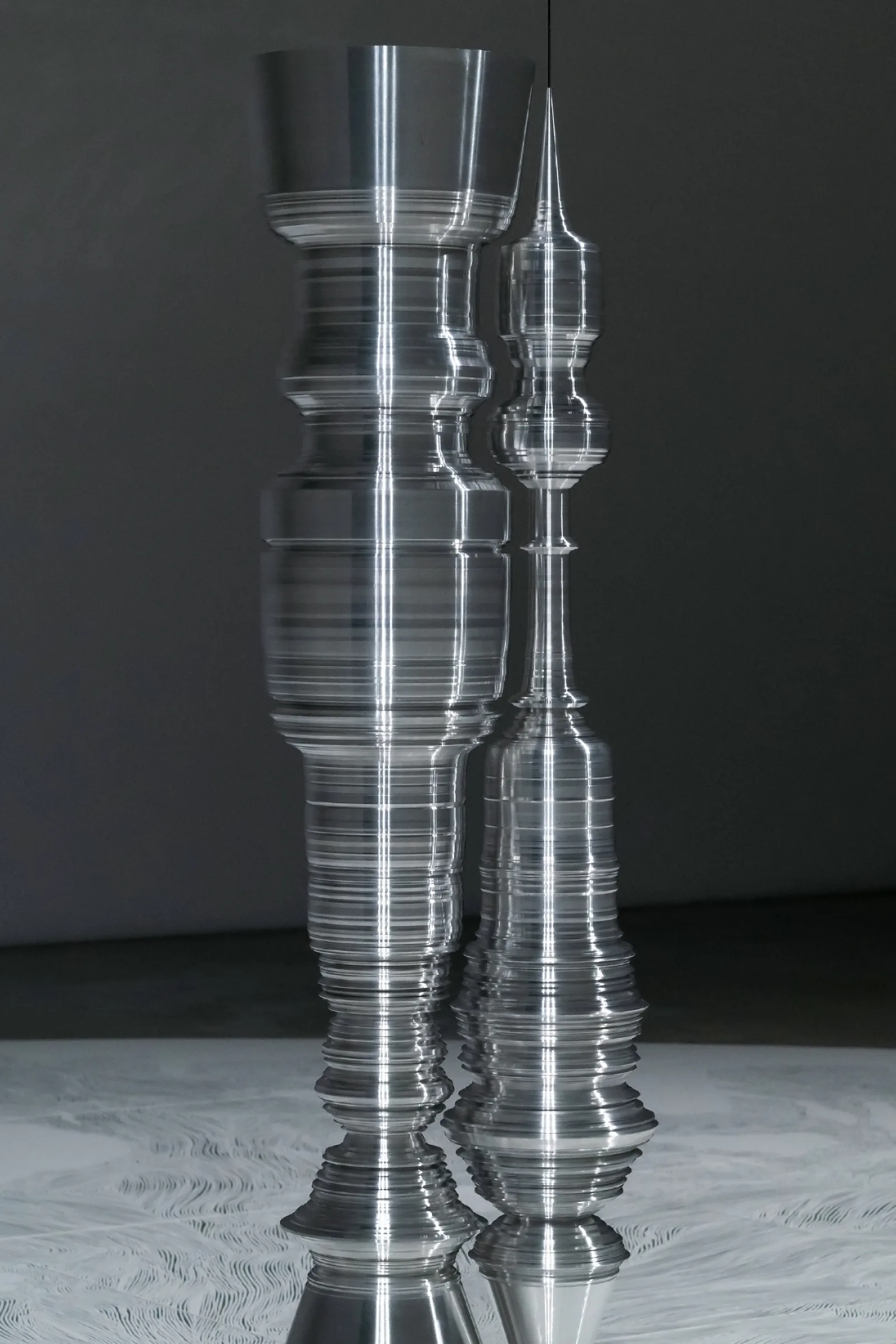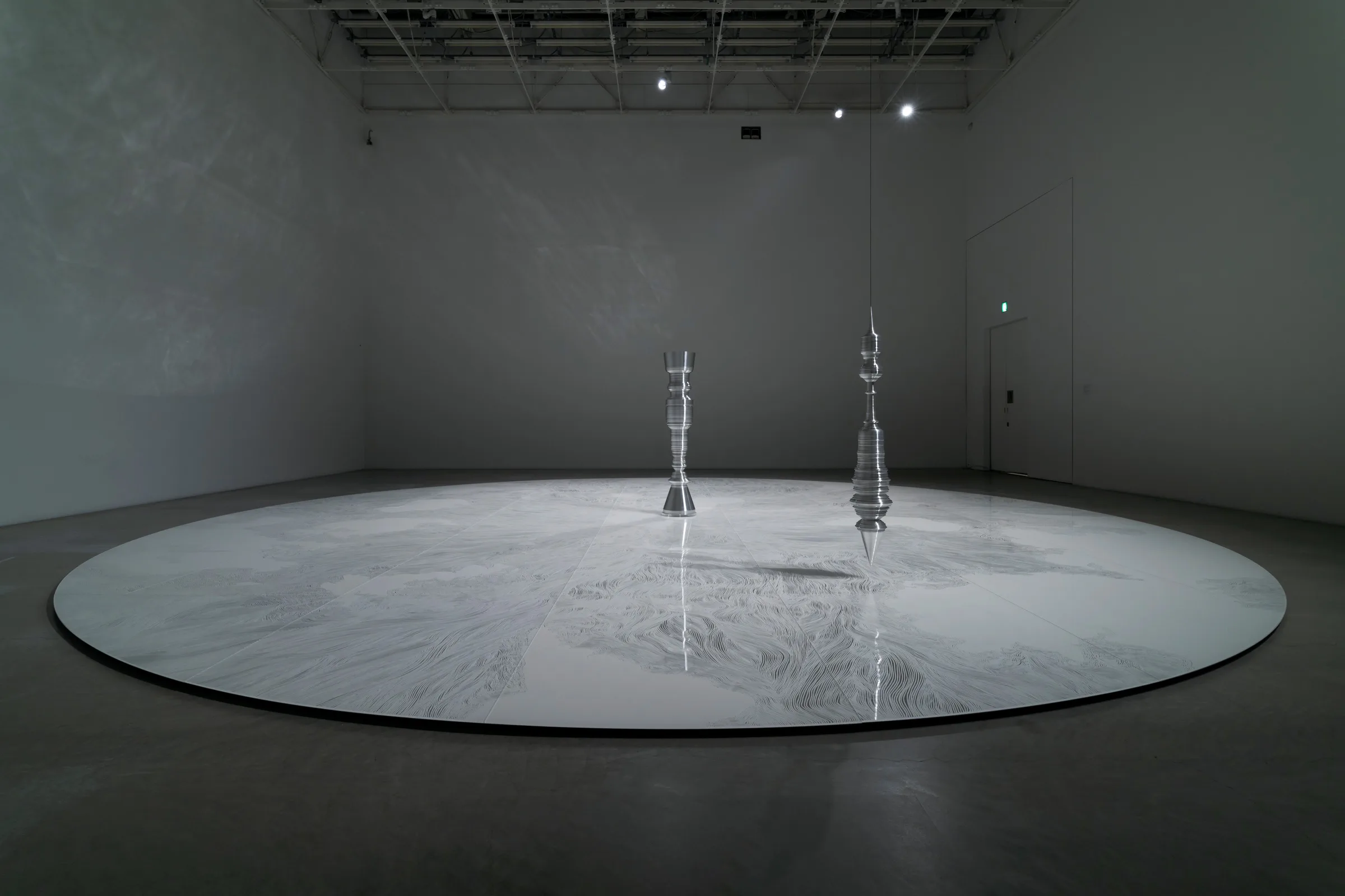 ──《Plateau 2024》は大陸を表す床の円盤とオブジェ、静かに動く振子で構成されています。中央に直立するオブジェは大和堆の上の空と海を、盤上を静かに動く振子には大和堆の大地(地形)を表した様々なデータにもとづく溝が刻まれており、プレス会見で大巻さんは「不確定な未来についての線の引き方を想像してほしい」とおっしゃっていました。本作の制作に取り組まれるなかで、苦労したことはありますか?