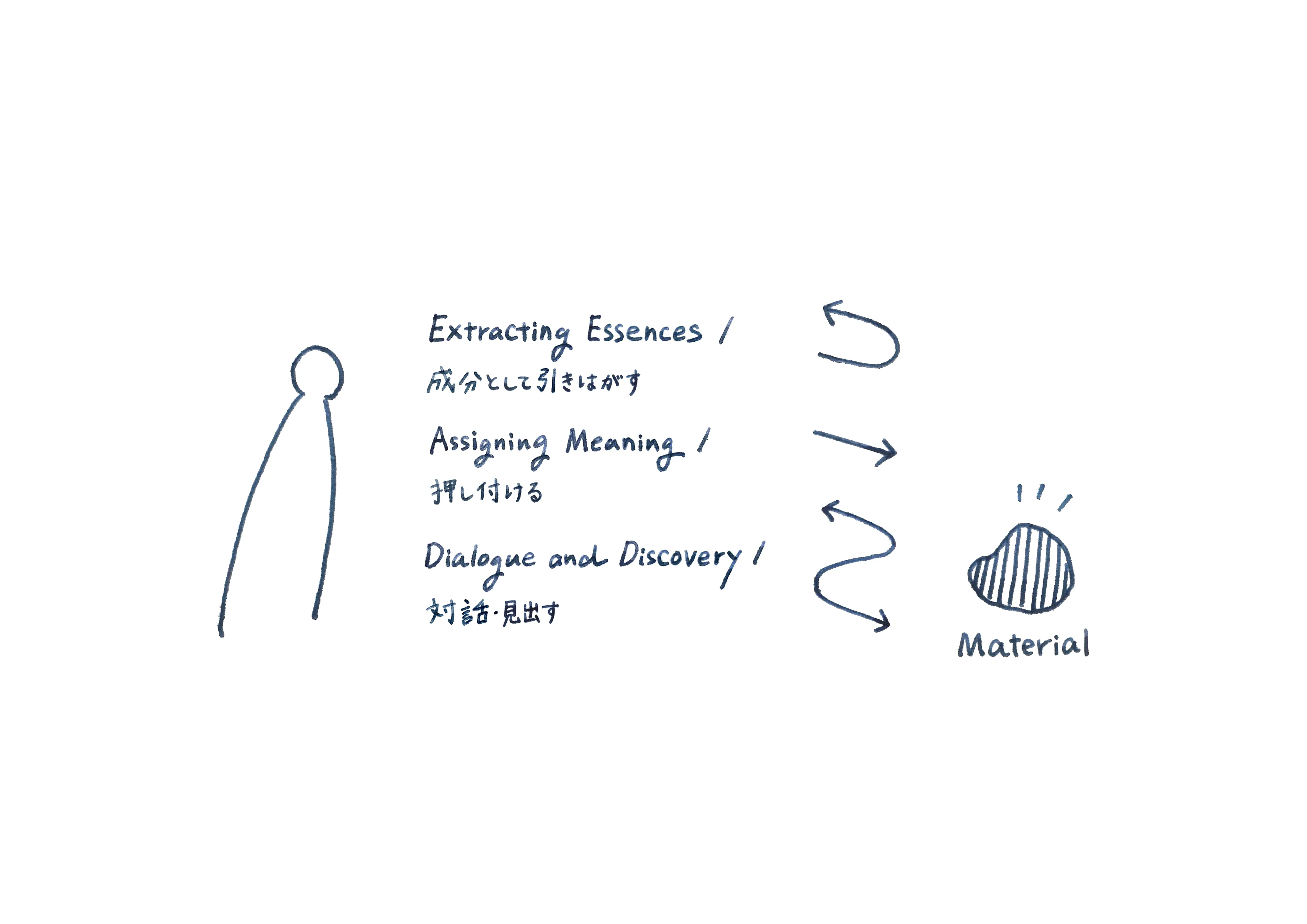 本展では、特定の意味を持たない「マテリアル」が、「もの」がつくられる過程で「素材」として意味づけされるプロセスに注目。この考えに則って、本来「素材」と「マテリアル」は同義だが、ここでは別の概念として扱われるという。