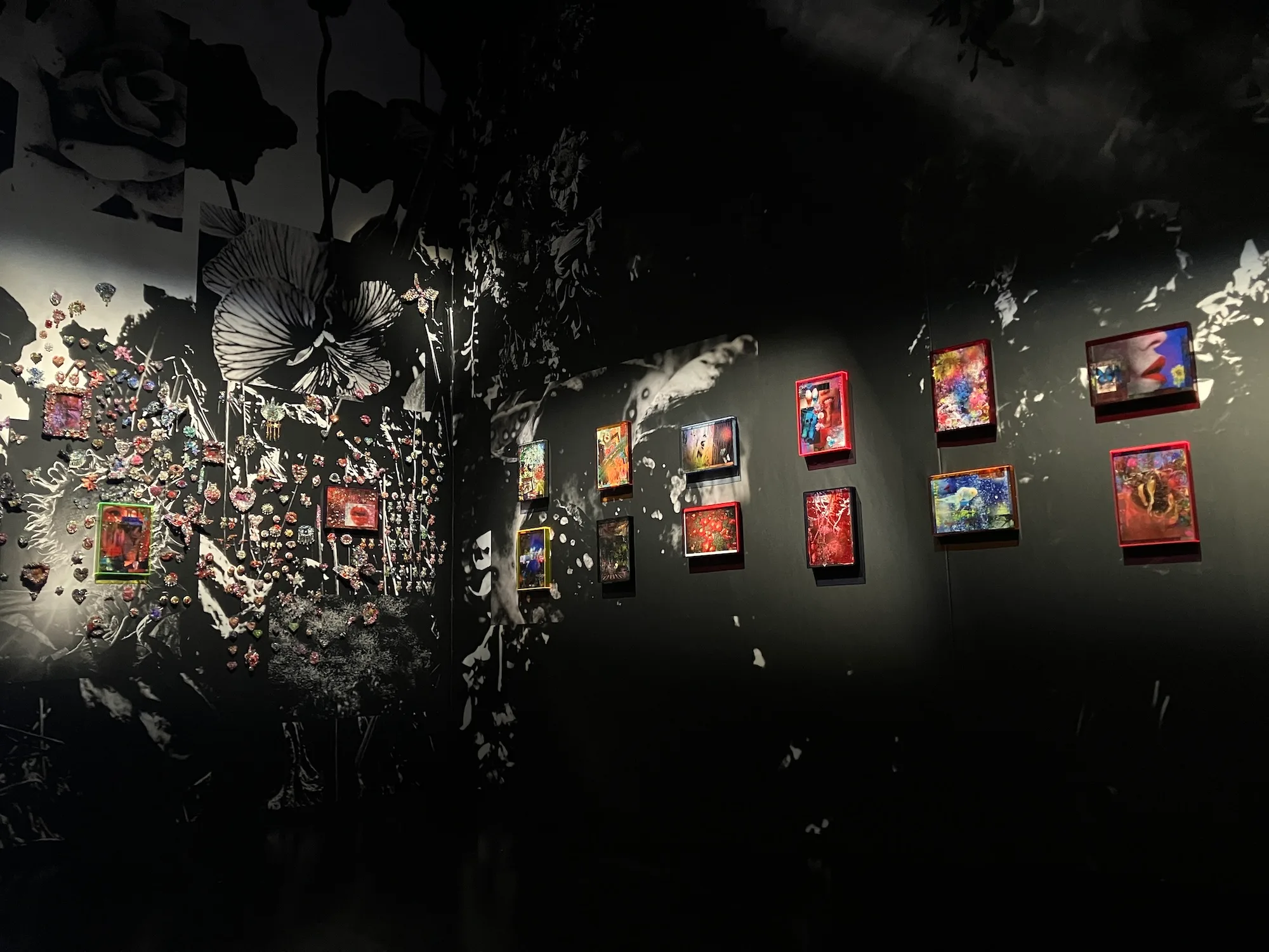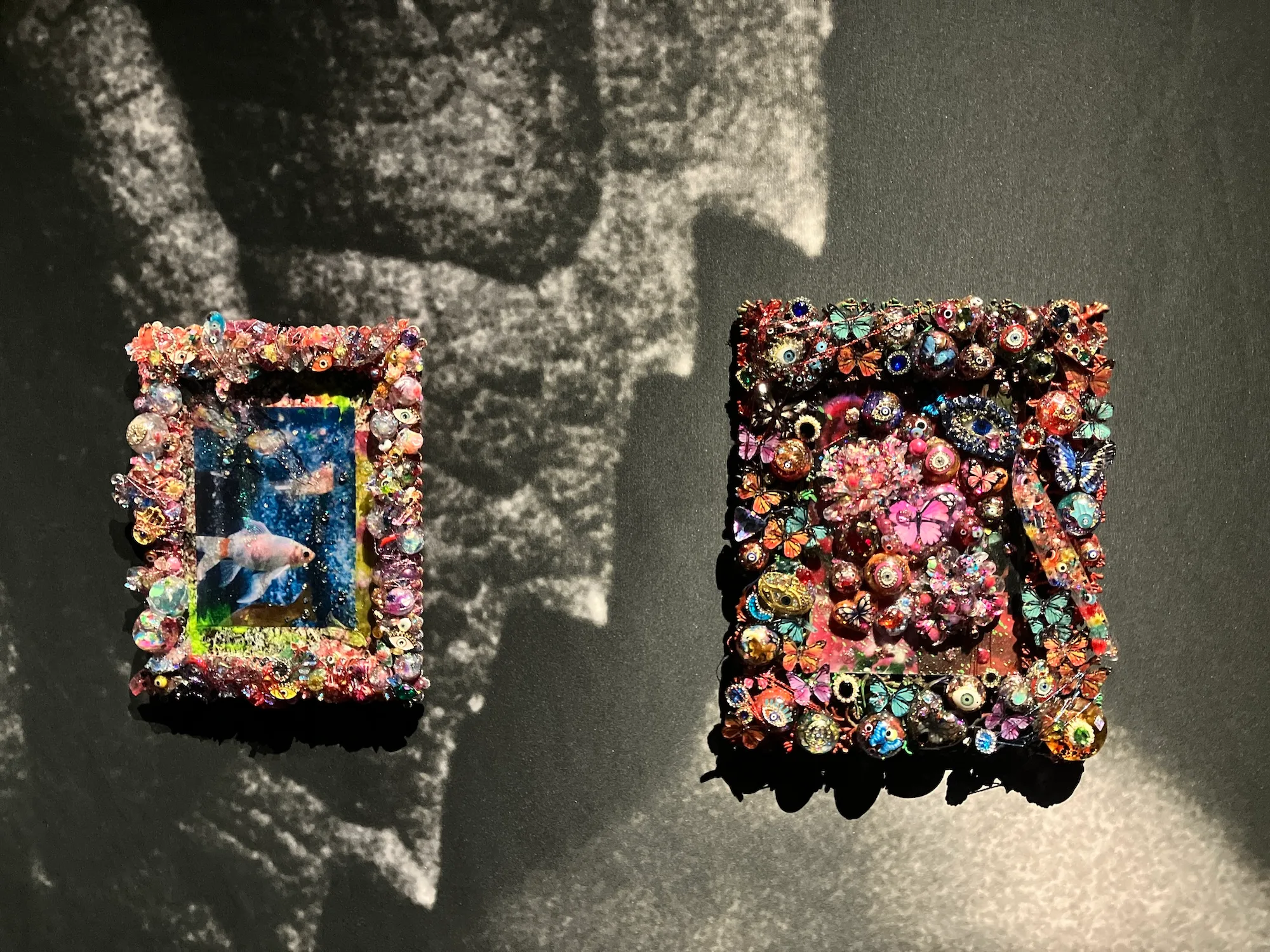 「解放と執着」と題された《Liberation and Obsession》は、蜷川自身の内面から滲み出る感情の痕跡から成る作品。金魚や色鮮やかな花、蝶々、赤い口紅を塗った唇といった蜷川作品で繰り返し用いられるイメージの上に絵の具や装飾が大胆に重ねられている。無数のビーズや装飾で過剰なまでに埋めつくされた額縁に入れられた作品群は、作家の執着とそれによる自己の解放の両面を感じさせる。本展は作品体験を通して自己と向き合う時間に鑑賞者を誘うことをコンセプトのひとつとしているが、ここには作家自身の内省も反映されている。