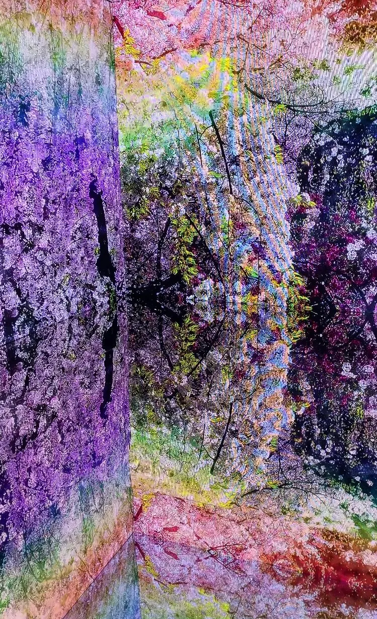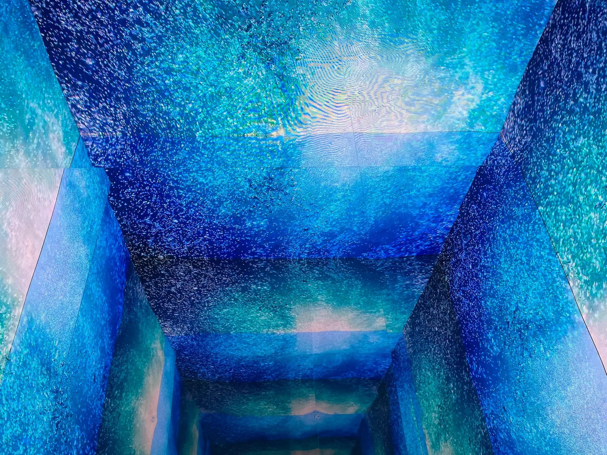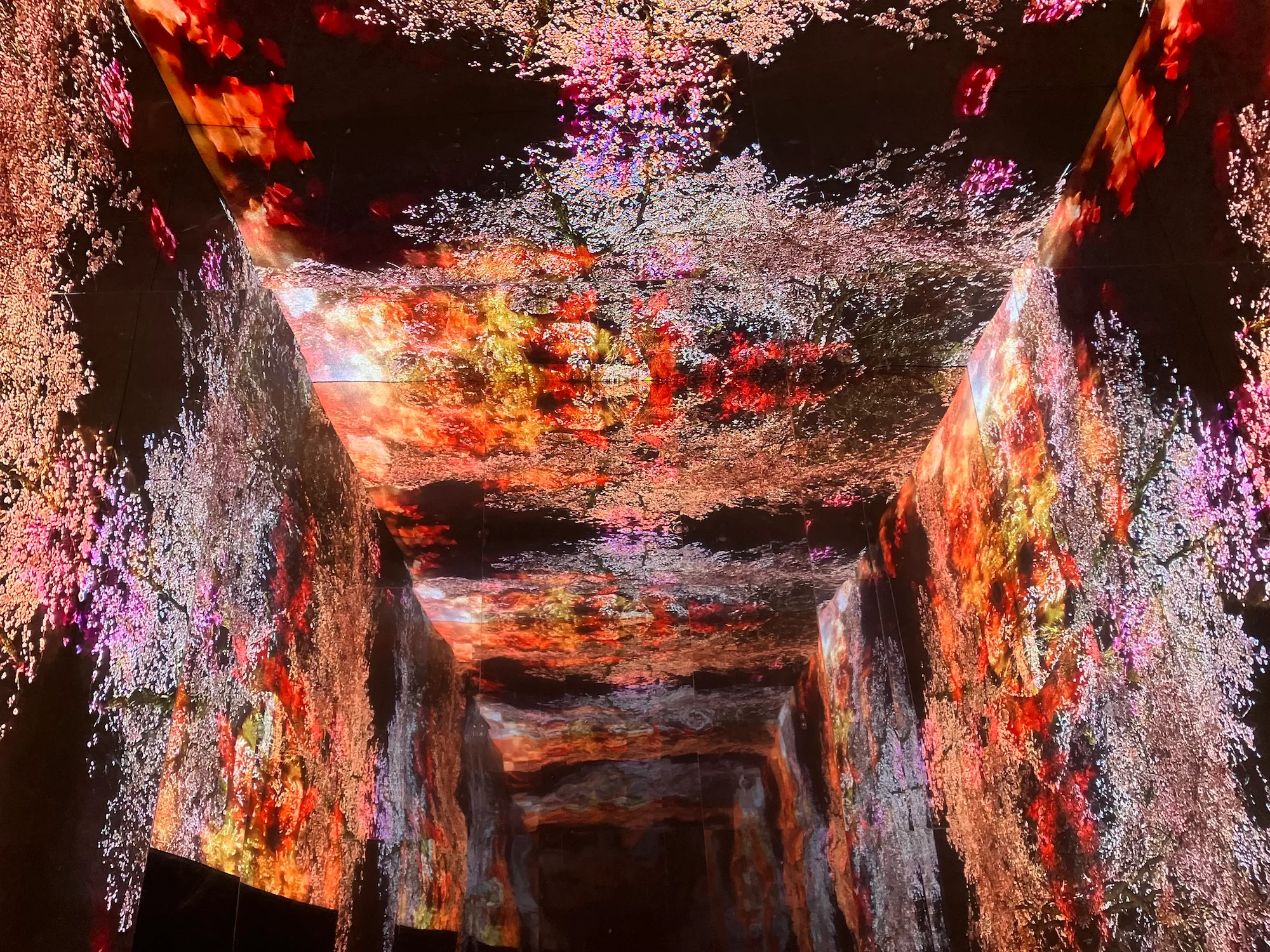 奥の空間は壁の4面にLEDディスプレイ、上下に鏡が配置され、ディスプレイに映し出された水や炎、花々や草木などの映像が上下に無限に広がる。下を見ると奈落の底まで地面が抜けているような感覚を覚え、上を見上げるとこちらも天に向かって続いていくような途方もなさを感じさせられる。空間を満たす重低音から身体に伝わる振動とともに、異界の深淵へと落ちていくとも昇っていくともとれる体験を生み出している。