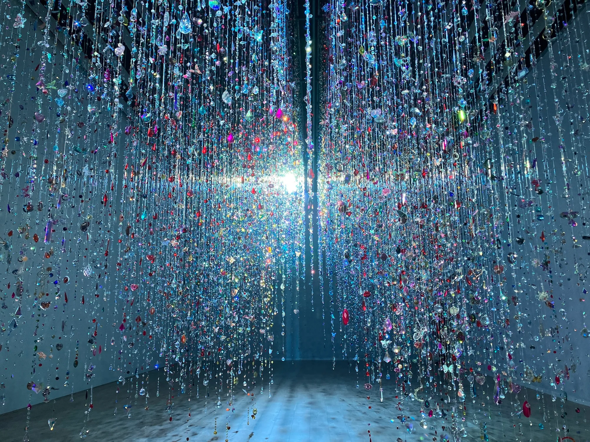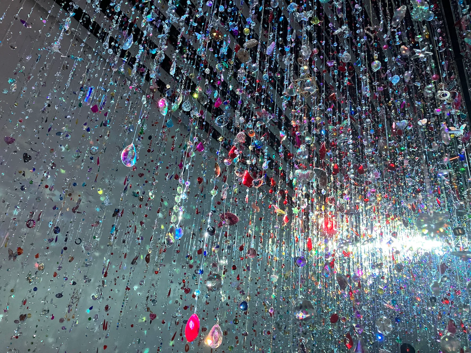 展示室の奥の空間を埋め尽くしているのは、無数のクリスタルのパーツが吊り下げられたインスタレーション《Whispers of Light, Dreams of Color》。約1500本のガーランドには、10万個ものパーツが付けられている。遠目には一筋の光が全体を照らし、近づいてみると赤やピンク、紫、透明などのハートや蝶々、星、宝石などのかたちをしたパーツが一つひとつキラキラと固有の光を放つ。これらのパーツはすべて手仕事でつなげられており、蜷川自身が作ったパーツも1万個におよぶそうだ。手仕事に宿る作り手の思いや記憶、そしてそれぞれのパーツから呼び起こされる鑑賞者の記憶や感情が光の中で混じり合う空間となる。