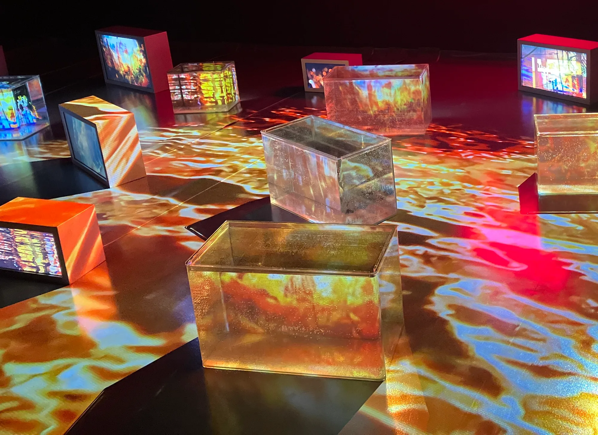 奥から聞こえる電子音に誘われるように暗い展示室の中へ足を踏み入れると、都市のなかで感じられる「いのちの息づかい」をテーマに制作されたインスタレーション《Breathing of Lives》が広がる。床に置かれた水槽とモニター群に映像が投影され、ゆらめく都市風景が幻想的な光景を生み出している。
