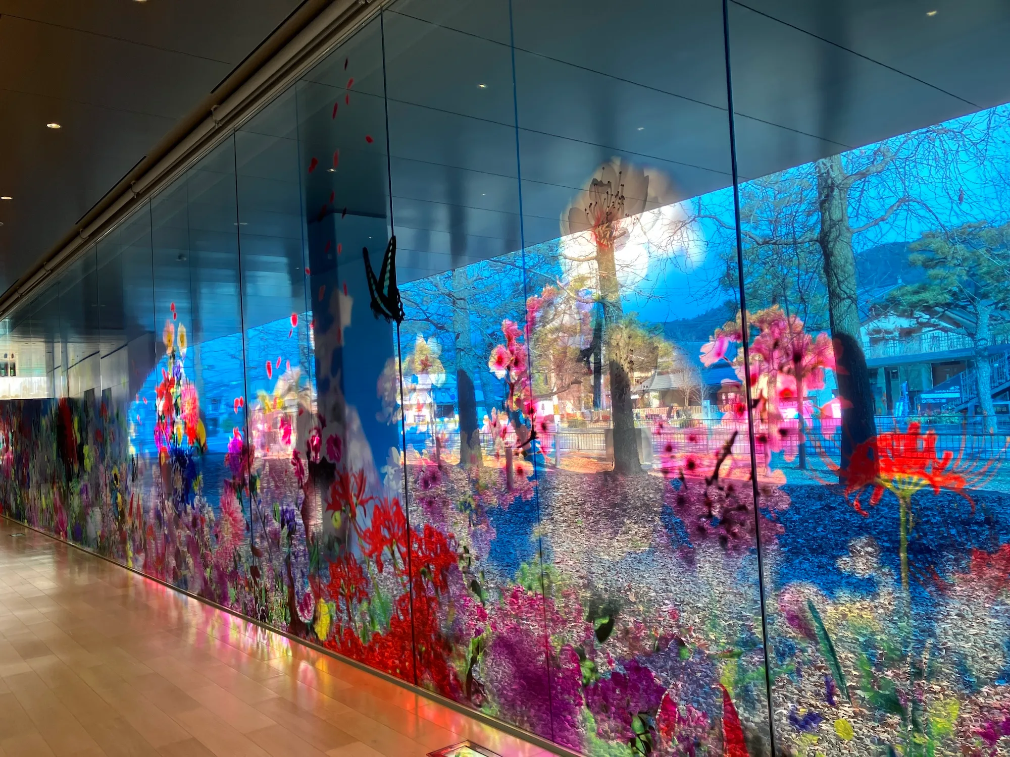 本展の序章となるのは、ガラス窓に面した廊下に展開されている《Liminal Pathway》。窓は花や植物、蝶々などの写真を印刷したフィルムに覆われ、写真の風景越しに外の京都の街並みが見える。展覧会の最後にもこの場所に戻ってくるため、展示が生み出す“異界”と現実世界をつなぐような役割を果たしている。