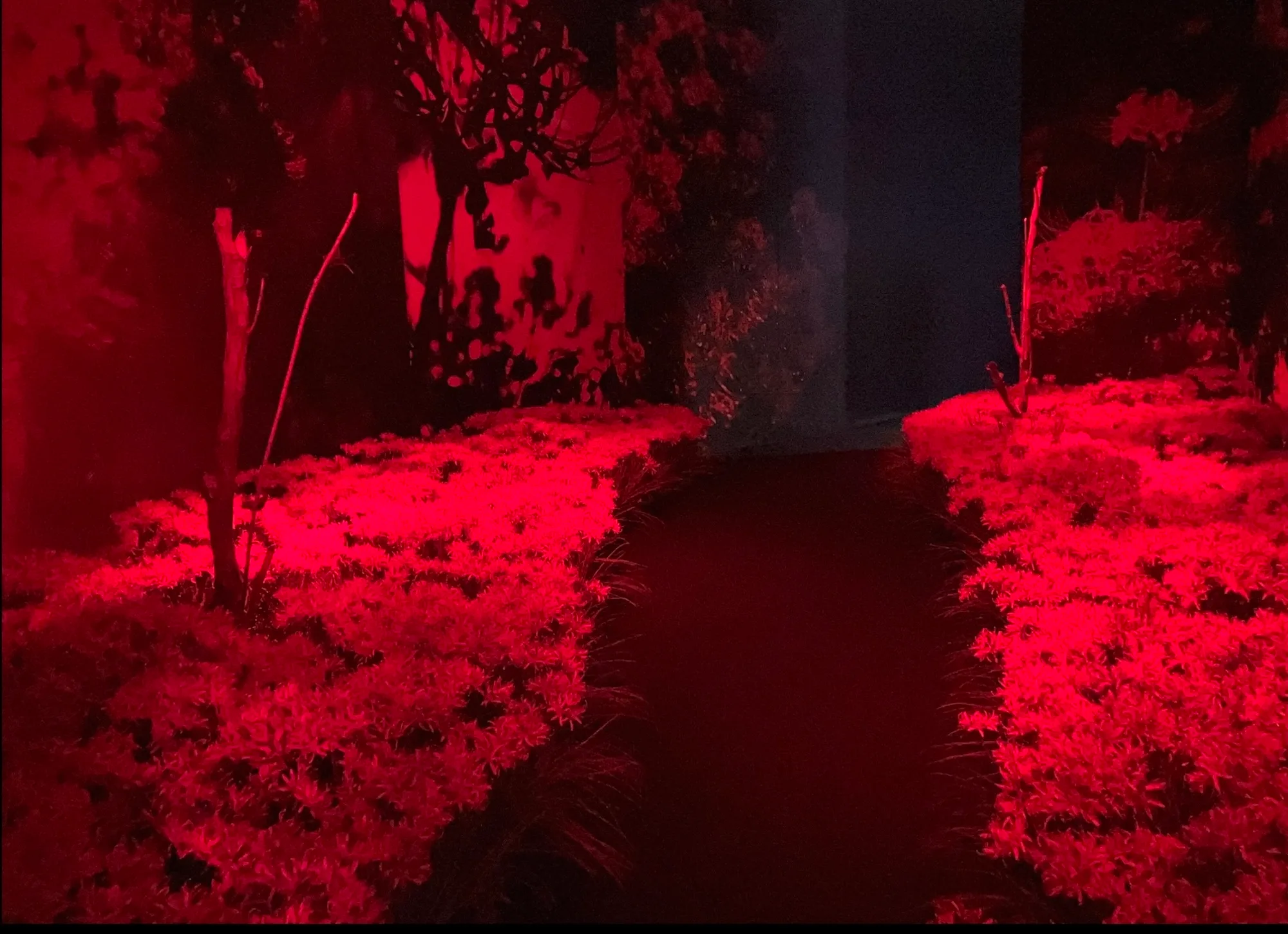 続いて4000本以上の彼岸花の造花が織りなす真紅の空間《Flowers of the Beyond》へ。彼岸花は、日本では古くから「彼岸」という言葉と結びつき、生と死、彼岸と此岸のあいだを漂う象徴的な存在とされている。壁一面にも彼岸花の写真がコラージュされ、赤いライティングに包まれた空間を時折りフラッシュのような強い光が明滅して照らし出す。鑑賞者は花畑の中に入っていくようにして、次の部屋へと向かう。