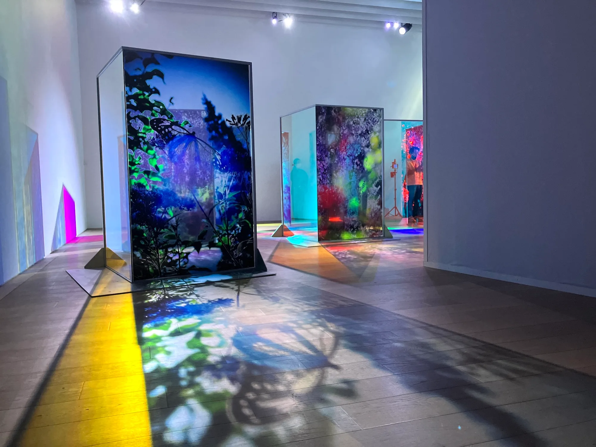 《Blooming Emotions》は、スクリーンの裏表から投影される映像が重なり合って浮遊感のある情景を生み出すインスタレーション。映し出される花の多くは人々の手で育てられたものだという。イメージが重なり合うことで非現実的な情景にも見えるいっぽうで、人間との共生によって生まれた自然の美しさが生命力や命の儚さを思わせ、見る者に様々な感情を呼び起こす。