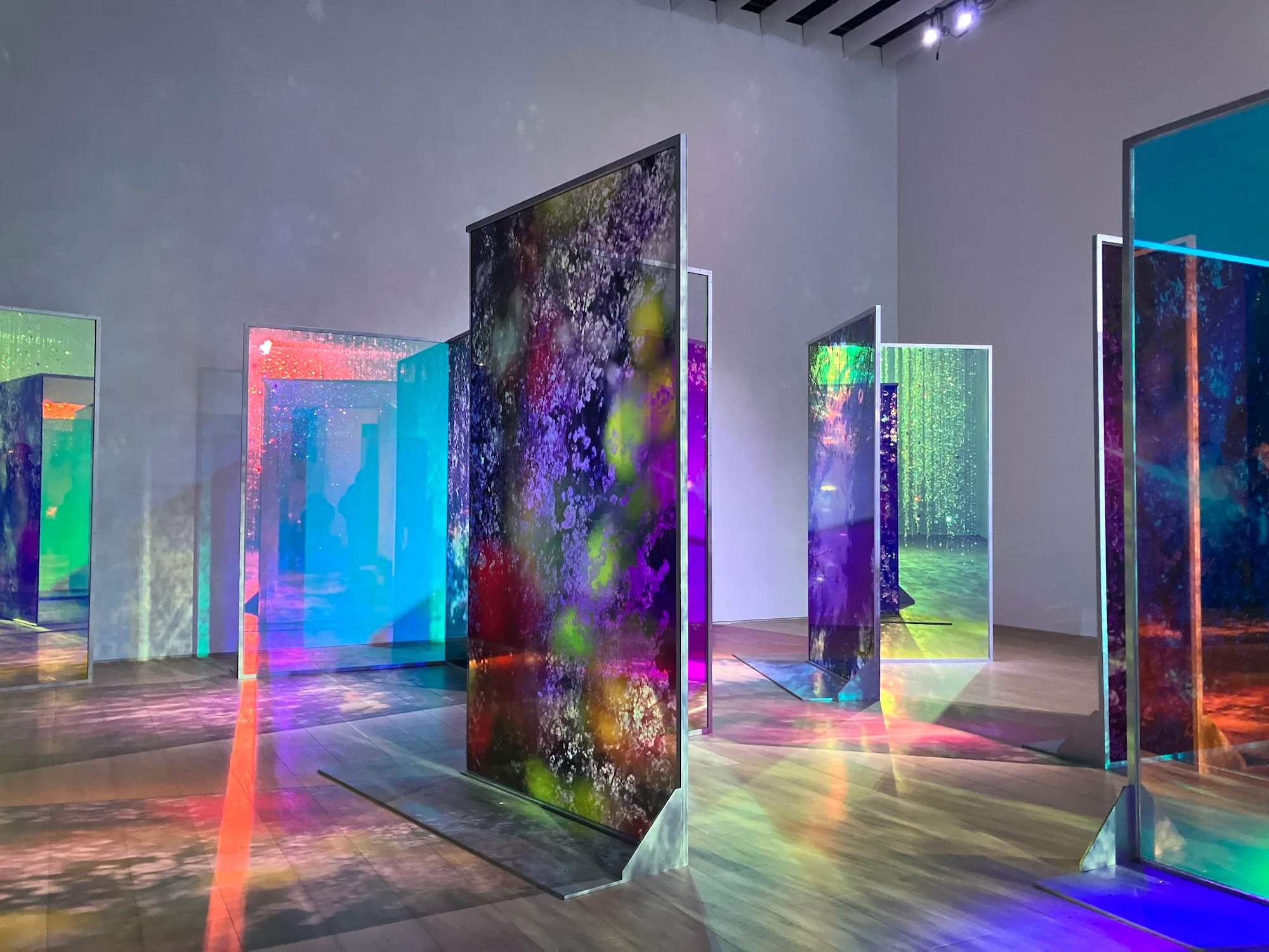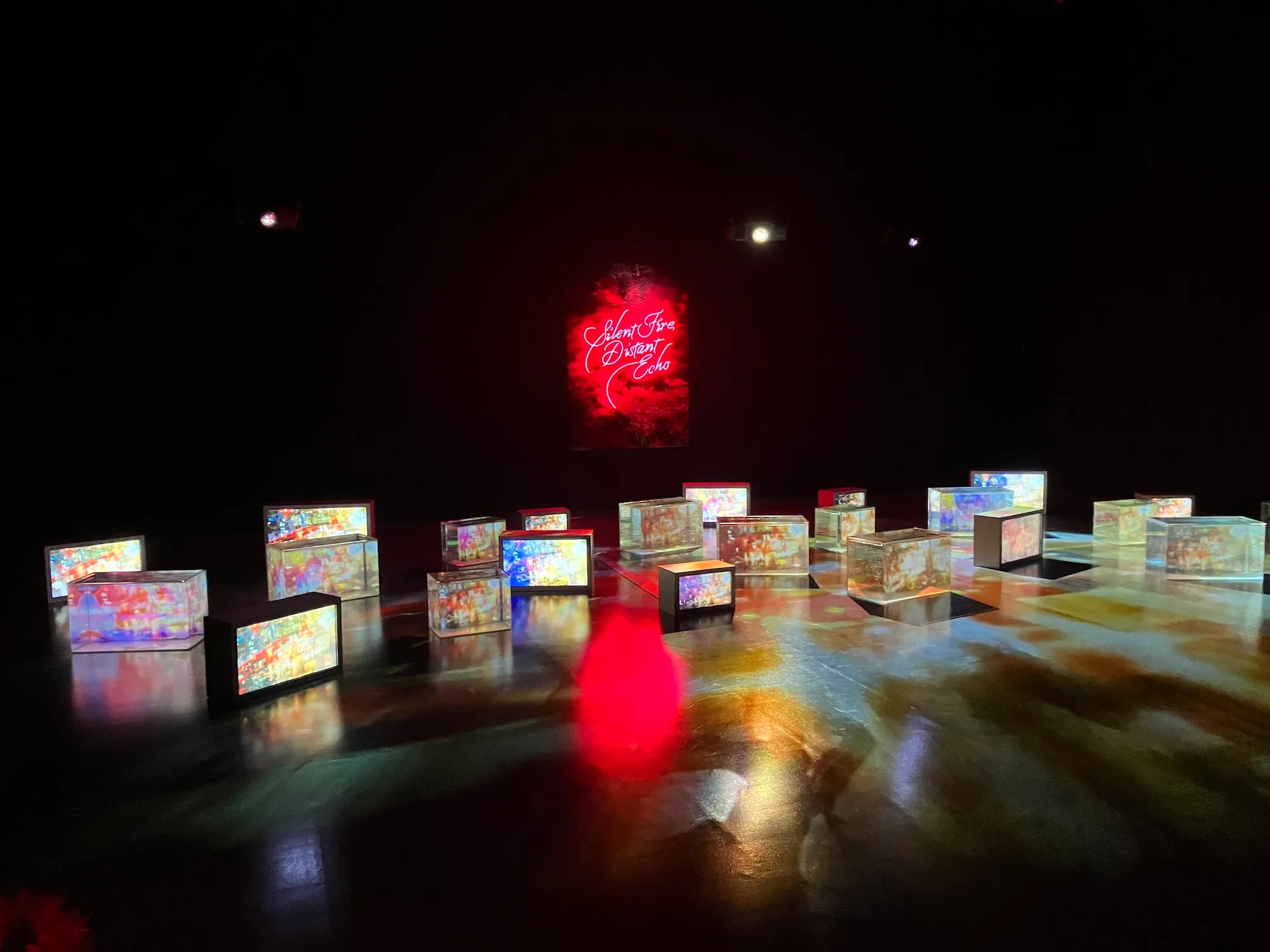 《Silence Between Glimmers》は、写真を配した6枚のガラスパネルとオーロラフィルターが対になり、コの字型に設置された作品。ガラスパネルには、花畑、蝶、藤の花、桜、海中の光景などをとらえた写真が配置されており、観客自身や他の観客の姿を反射する。作品のあいだを歩いていくことで、オーロラフィルターが多様な光の交差を浮かび上がらせる。