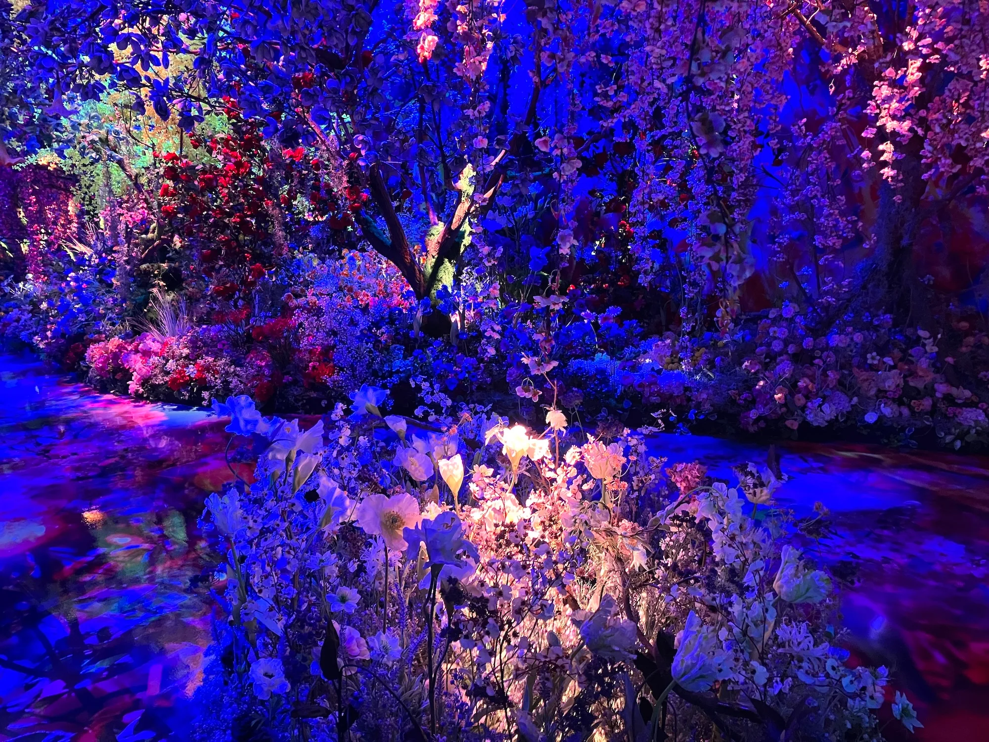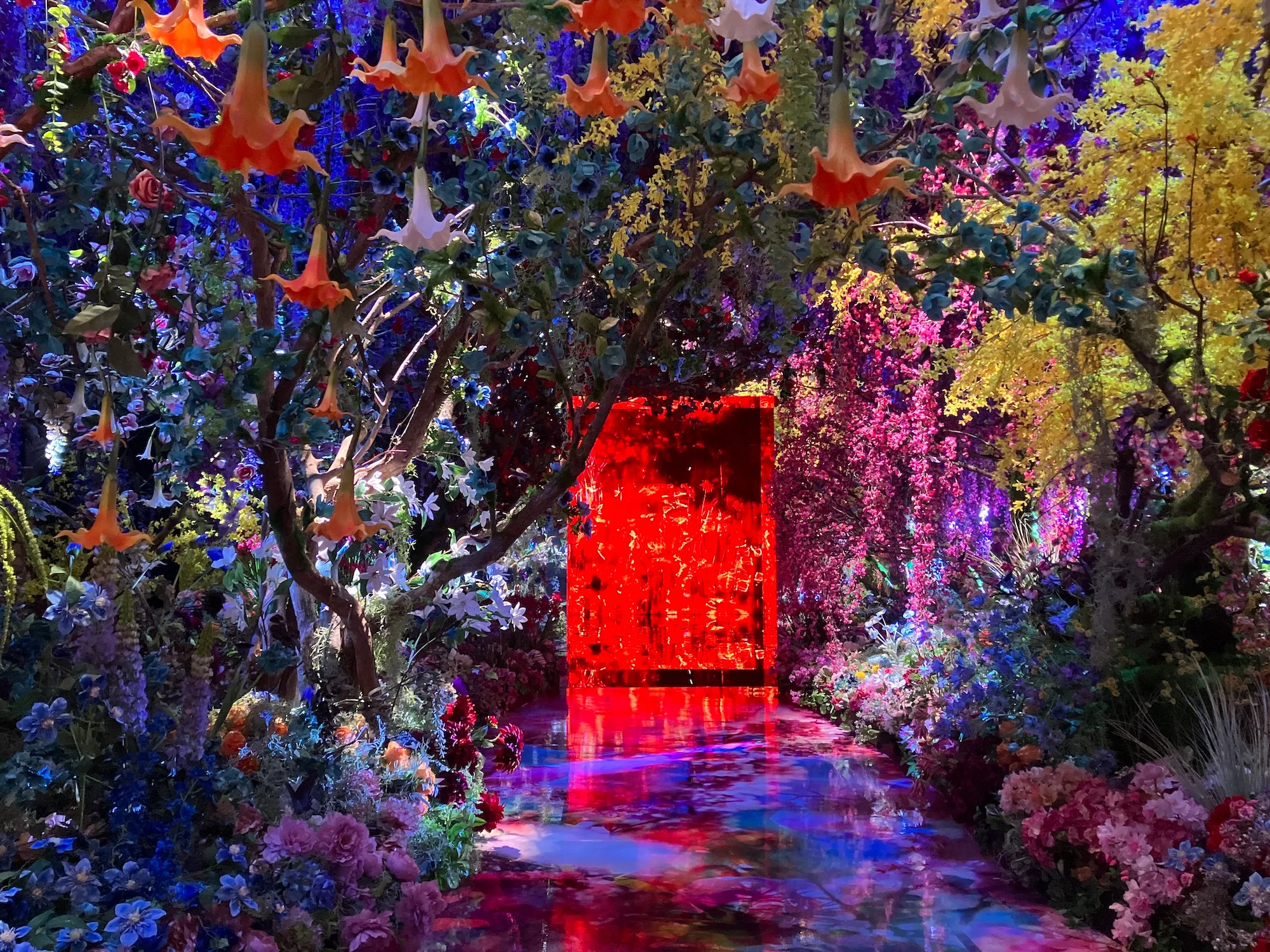 そして蜷川や宮田が「奈落」と呼んで本体のハイライトと位置付けている《Dreams of the beyond in the abyss》へ。この作品は、手前に色とりどりの造花が咲き乱れる空間が広がり、その中を抜けるとLEDディスプレイと鏡で構成された空間につながる。