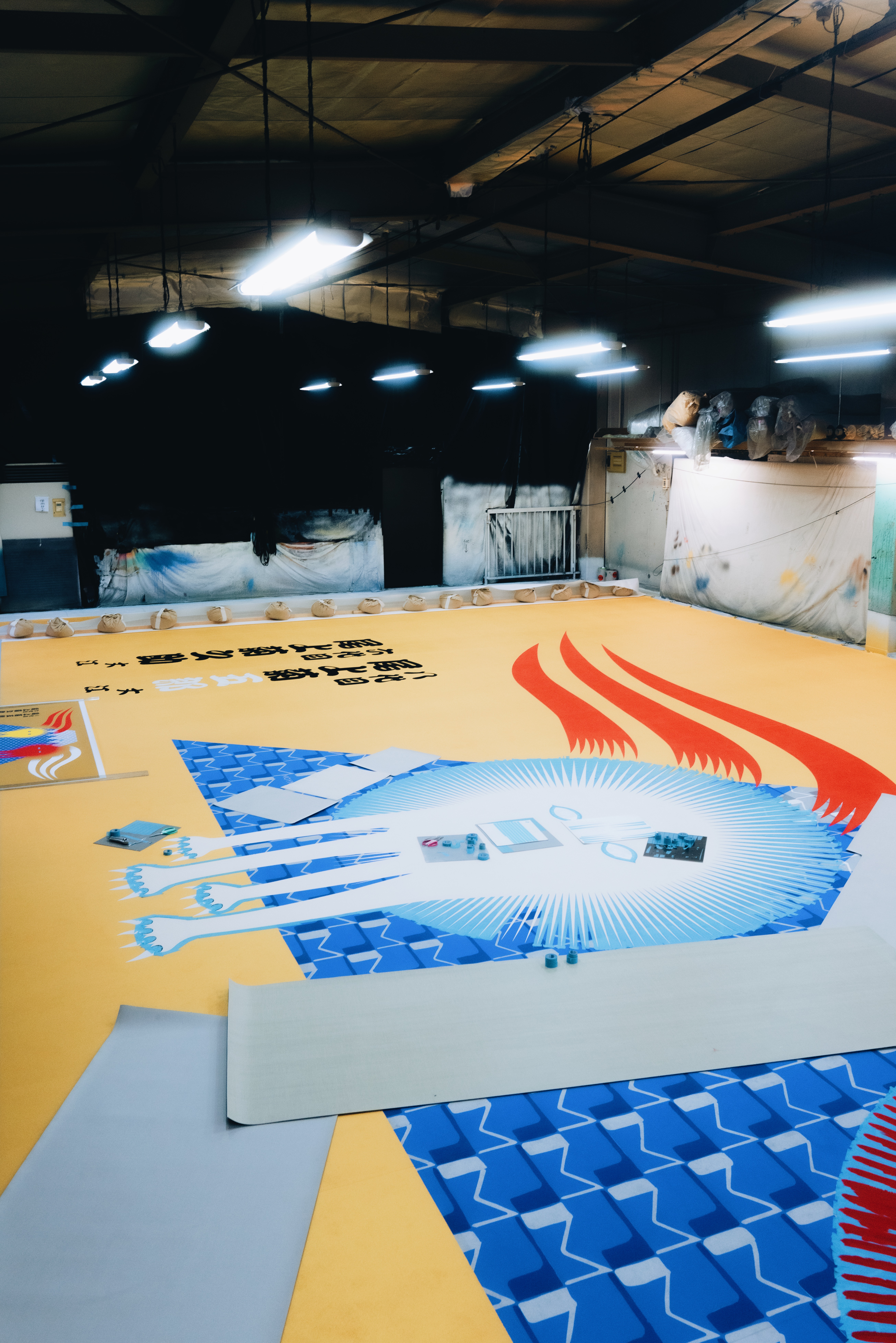 この祝幕は、連獅子をモチーフにした力強い構図と、モワナの“M”モノグラムを用いて表現された富士山が印象的なオリジナルアートワーク。永井氏の卓越したビジュアル言語と、日本文化の象徴である歌舞伎の精神、そして170年以上の歴史を誇るモワナの職人技が融合した作品に仕上がった。