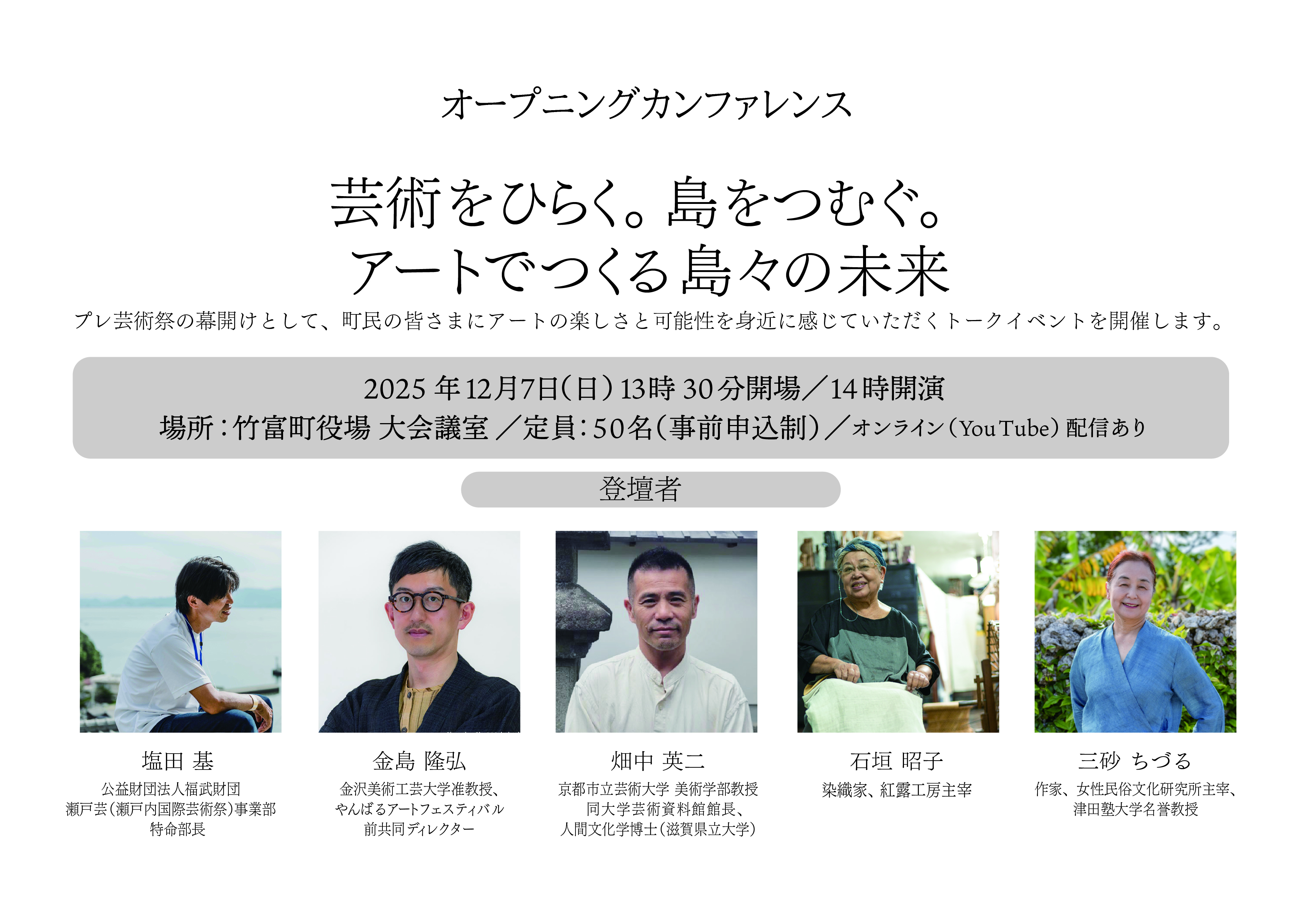 また、12月7日に開催されるカンファレンスでは、識者による地域芸術祭の先進例の紹介や、町内在住アーティストによるトークなども実施される。登壇者は、塩田基(公益財団法人 福武財団 瀬戸芸事業部 特命部長)、金島隆弘(金沢美術工芸大学 准教授)、畑中英二(京都市立芸術大学 教授)、石垣昭子(染織家、紅露工房主宰)、三砂ちづる(作家)の5名。こちらは、オンライン(YouTube)での配信も予定されている。