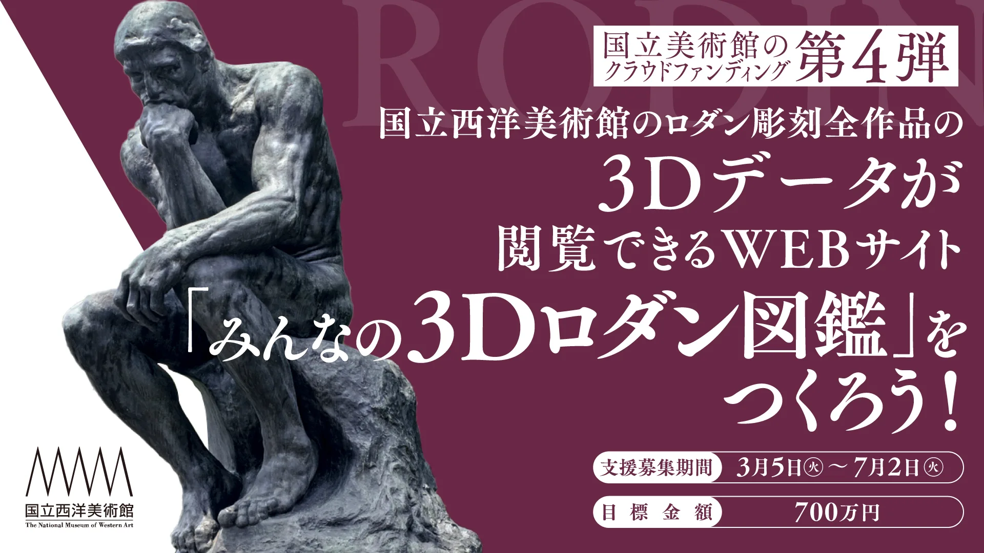 独立行政法人国立美術館が、国立西洋美術館の所蔵するオーギュスト・ロダンの彫刻作品、全60点の3Dデータが閲覧できるウェブサイト「みんなの3Dロダン図鑑」制作のためのクラウドファンディングを開始。同館所蔵のロダン作品コレクションを3Dデータ化・公開することを目指し、3月5日~7月2日まで、700万円を目標に支援金を募集している。