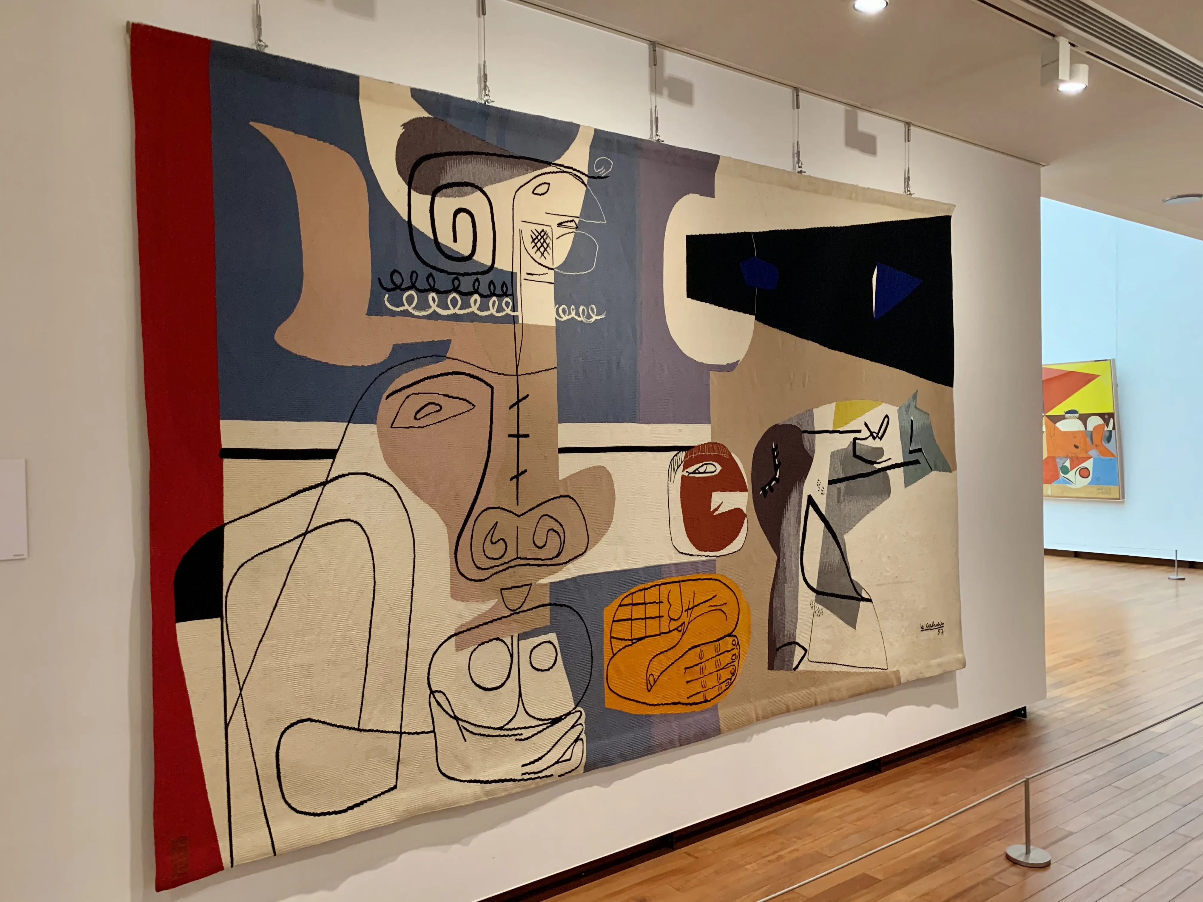 《奇妙な鳥と牡牛》(1957)は晩年のコルビュジエがモチーフとして多用した牡牛が描かれたタピスリー。その画風もさることながら、同じく牡牛を主題とした作品群としては最後に制作された《牡牛ⅩⅧ》(1959)とは異なり描線と色面がほとんど一致しないなど、細部や技法も興味深い。