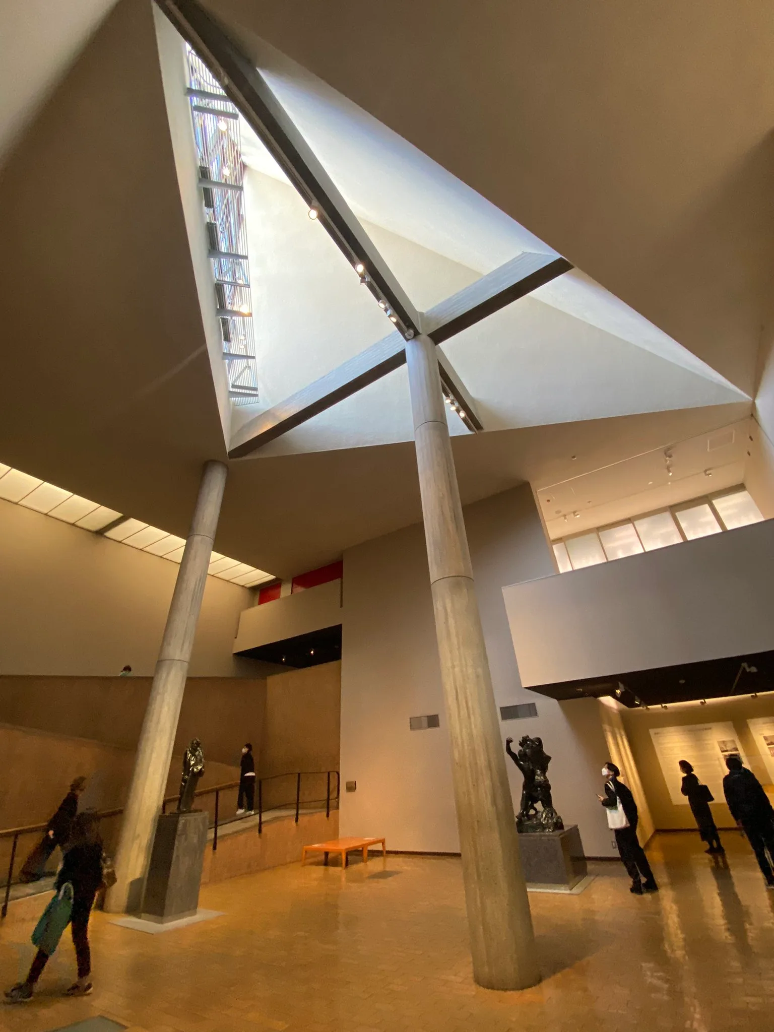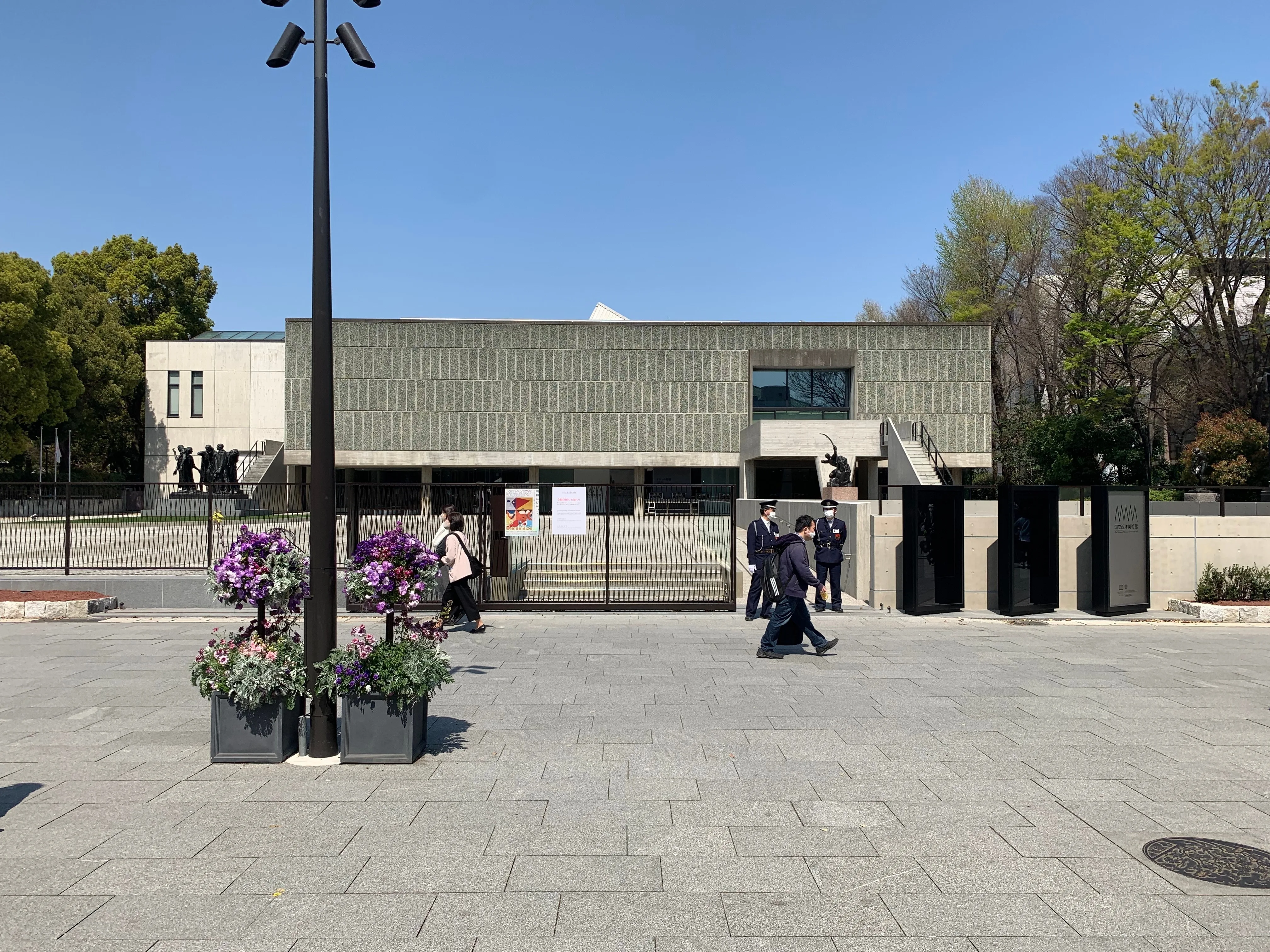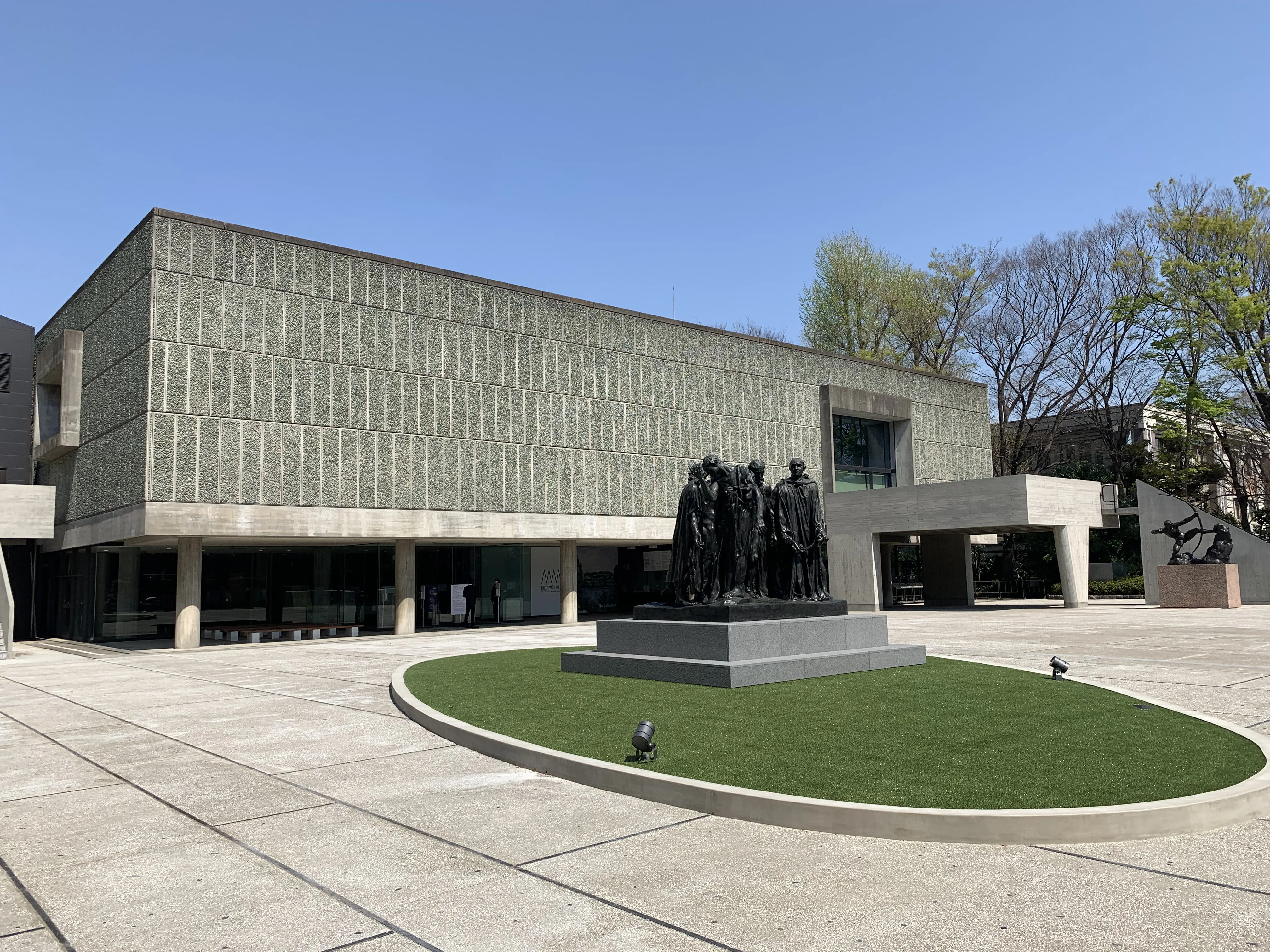 同館は2016年に「ル・コルビュジエの建築作品ー近代建築運動への顕著な貢献ー」の一部として世界遺産に登録されたが、その際にユネスコは「当初の前庭の設計意図が一部失われている」と指摘。休館に際して行われた前庭の改修工事では、植栽は最小限に、柵は透過性のあるものに変更された。床の目地や屋外に展示されたロダンの彫刻《考える人》と《カレーの市民》の配置を含め、どれも開館当時の設計の意図を組んだもの。作品の搬入や来場者の安全のための導線を確保するなど、時代に合わせたアップデートを行いつつ、開館当初の開放的な姿に近づいた。近隣の上野公園や東京文化会館との一体感が感じられるだろう。