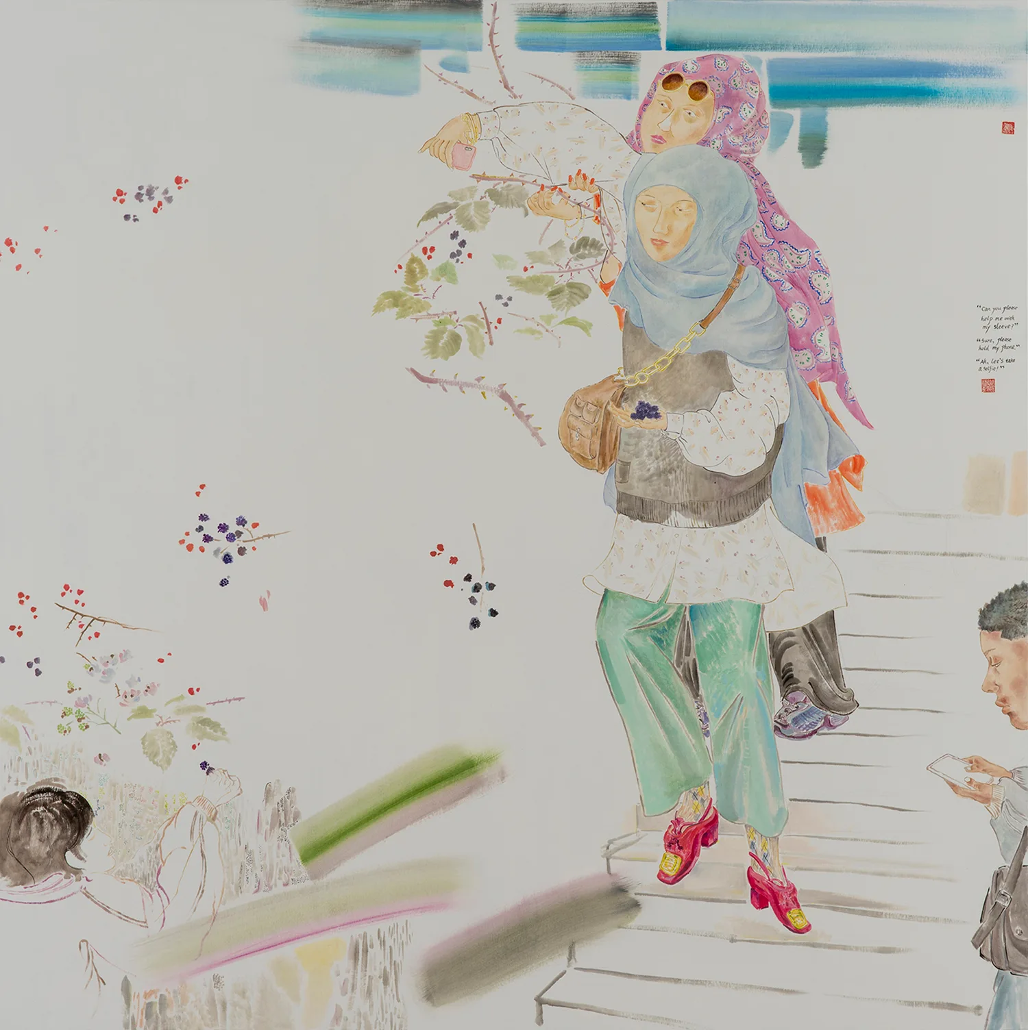 多岐にわたるメディアの表現で知られる中国・成都出身のエヴェリン・タオチェン・ワンによる油彩画《トルコ人女性たちのブラックベリー》(2023)は、伝統的な中国の書画と西洋絵画技法を融合させ、ジェンダー問題や植民地史をテーマに取り上げる。