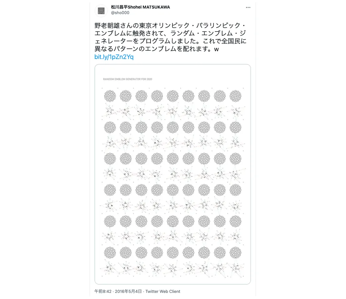 野老朝雄のエンブレムで印象的だったのは、市松模様を活かした展開力である。パロディ画像や解説動画、松川昌平によるジェネレーター(*32)など様々なバリエーションがネットユーザーによって公開され、野老はこうした「オープンデザイン」的な展開を喜んで受け入れた。