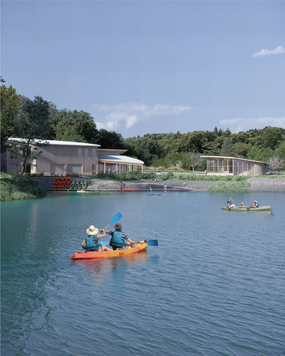 本瀬齋田建築設計事務所によるアクティビティセンターは、桜ヶ池に面した自然遊びのハブとなる。アウトドアショップやベーカリー、レンタルギアに加え、地元の自然を案内するガイドツアーも併設される。