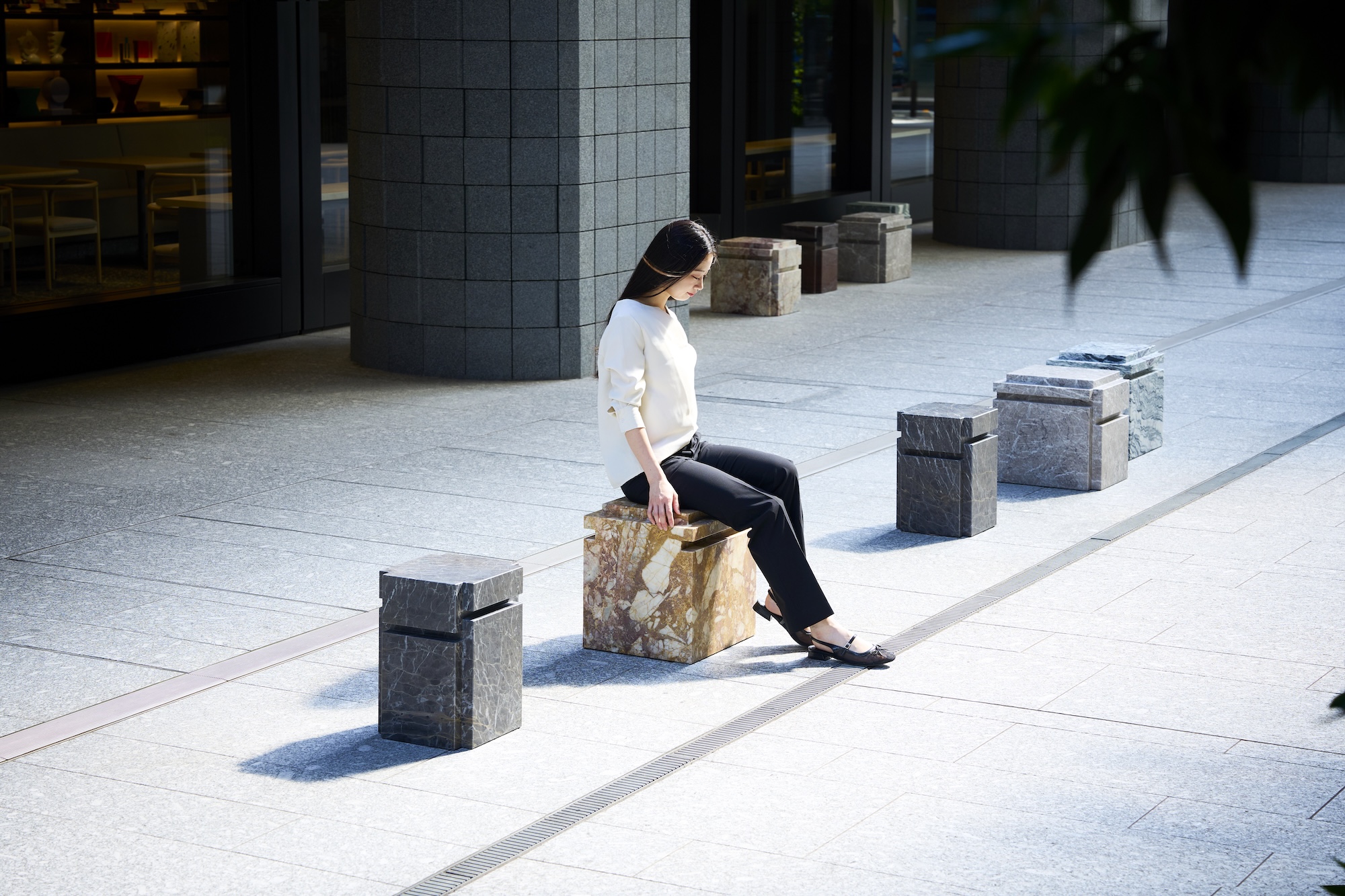 オフィスビルが立ち並ぶエリアに設置された大理石の椅子。美術館は、慌ただしい日常のなかで、美術を通して豊かな隙間が立ち現れ、街に新たな会話が生まれることを願ってホワイトリードに依頼をしたという。