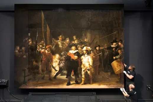 レンブラントの《夜警》は1715年に市庁舎に移された際に絵の上下左右を切り落とされたが、今回、17世紀ゲリット・ルンデンス(Gerrit Lundens)による約5分の1のサイズの模写とAIで全体を復元した。人の手で復元することもできたが、その人のくせが出るのを避けるためにAIを使うことにしたそう。アムステルダム国立美術館にて3ヶ月間展示される。