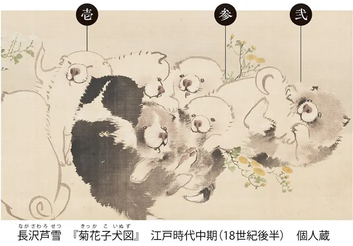 デザインは、「其ノ壱 おすわり」「其ノ弐 あおむけ」「其ノ参 ふせ」の個性あふれる3種類。芦雪の作品《菊花子犬図(きっかこいぬず)》(18世紀後半)に実際に登場する子犬たちがモチーフになっている。3匹すべてをそろえて、作品のように、芦雪犬がじゃれ合う様子を再現することもできる。