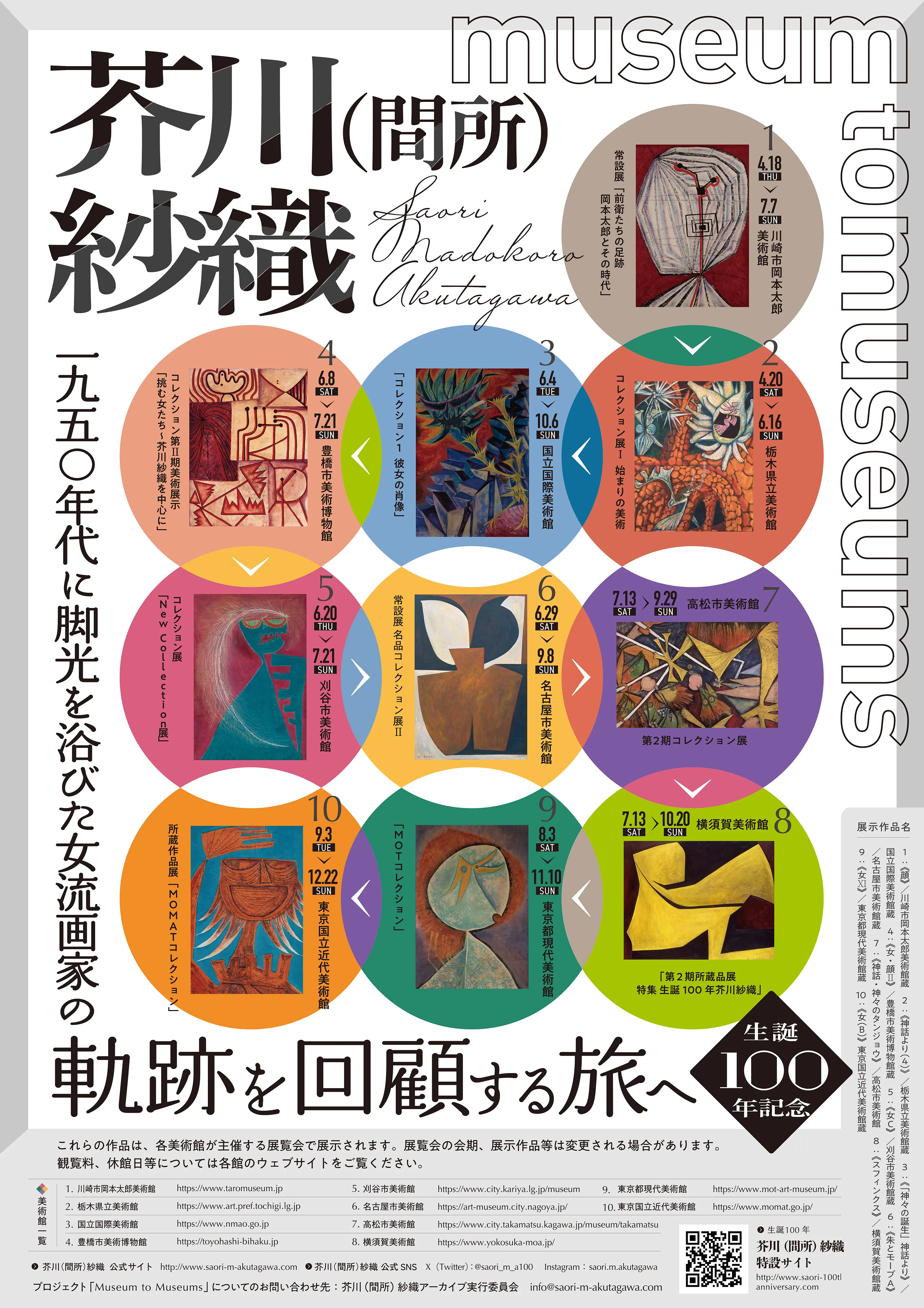 「生誕100年 芥川(間所)紗織 Museum to Museums『軌跡を回顧する旅へ』」は、生誕100年を迎える芥川(間所)紗織の所蔵作品を全国10ヶ所の美術館で期間限定で展示するプロジェクト。複数の場所で、芥川(間所)の作品を鑑賞することで彼女の生き様を俯瞰して捉えたり、現代美術史における独自性や時代性に気づくことができる。