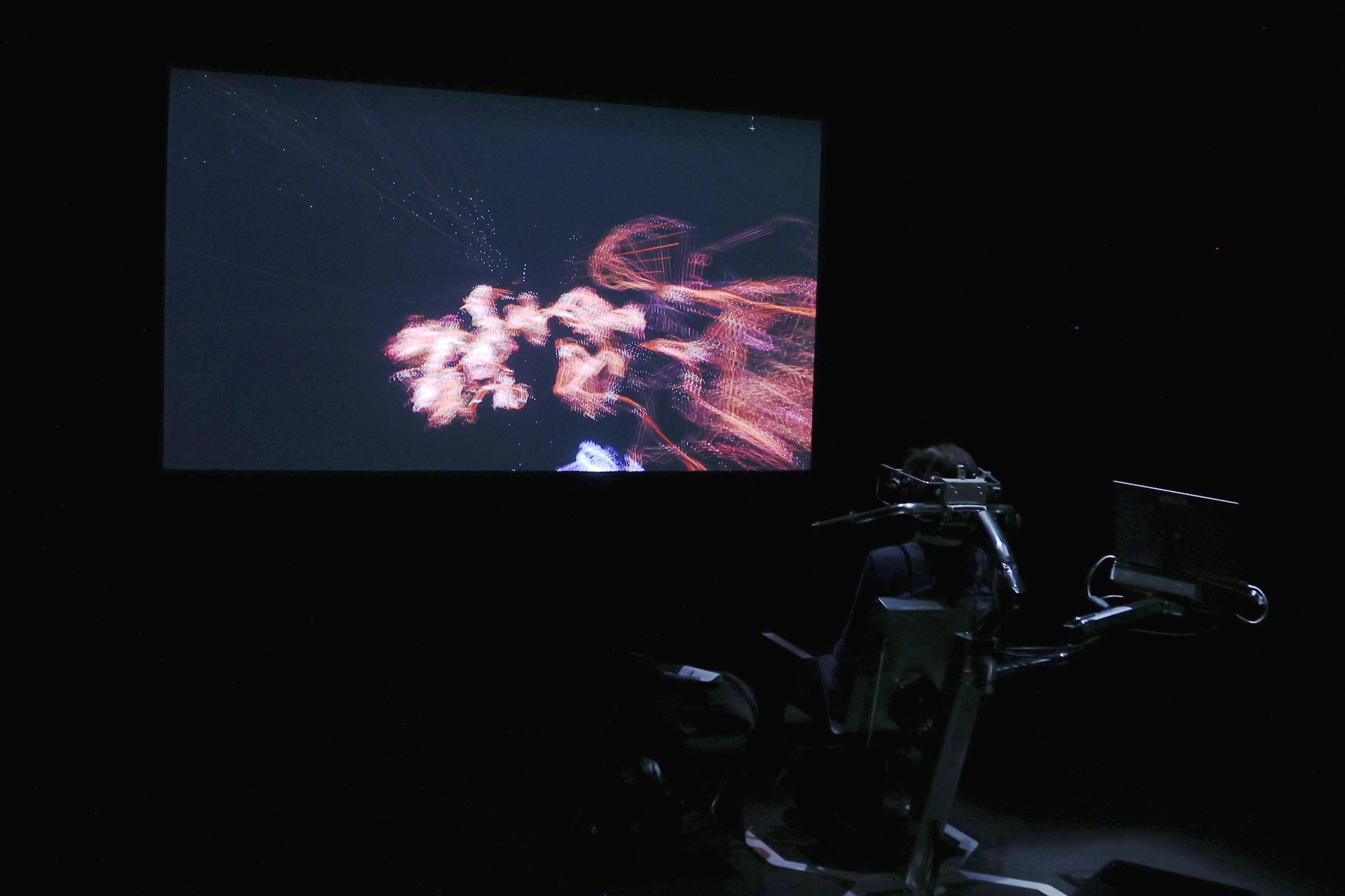 《Eye-Tracking Informatics》 (2011/19)は、知覚のなかでもとくに「視覚」にフォーカスした作品。体験者がウェアラブルデバイスを装着すると、その視線が視線入力装置によって感知され、その視線が仮想の3次元空間内に生成され可視化される。「視ることそのものを視る」というコンセプトの作品だ。