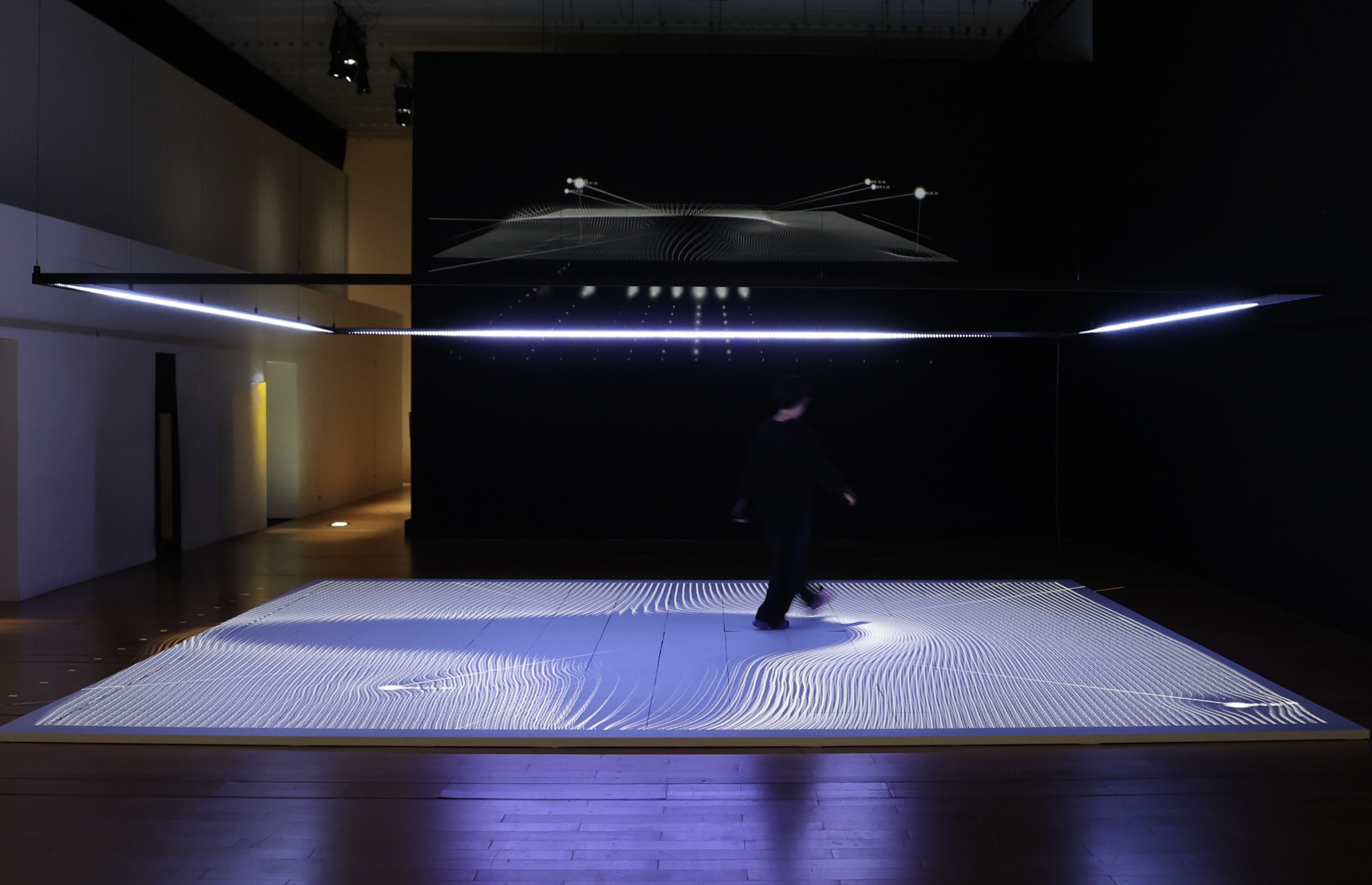 三上晴子+市川創太《gravicells—重力と抵抗》 (2004/10)は、6m四方のフロアに鑑賞者が足を踏み入れることができる体験型のインスタレーション。複数の人が自由に歩き回ることで起こる変化が、リアルタイムで画像・音・光へと変換され、互いに関係しながら空間全体を変えていく。普段はあまり気にしていない重力の存在を感じることで、自らの身体や知覚をとらえなおす機会になるだろう。