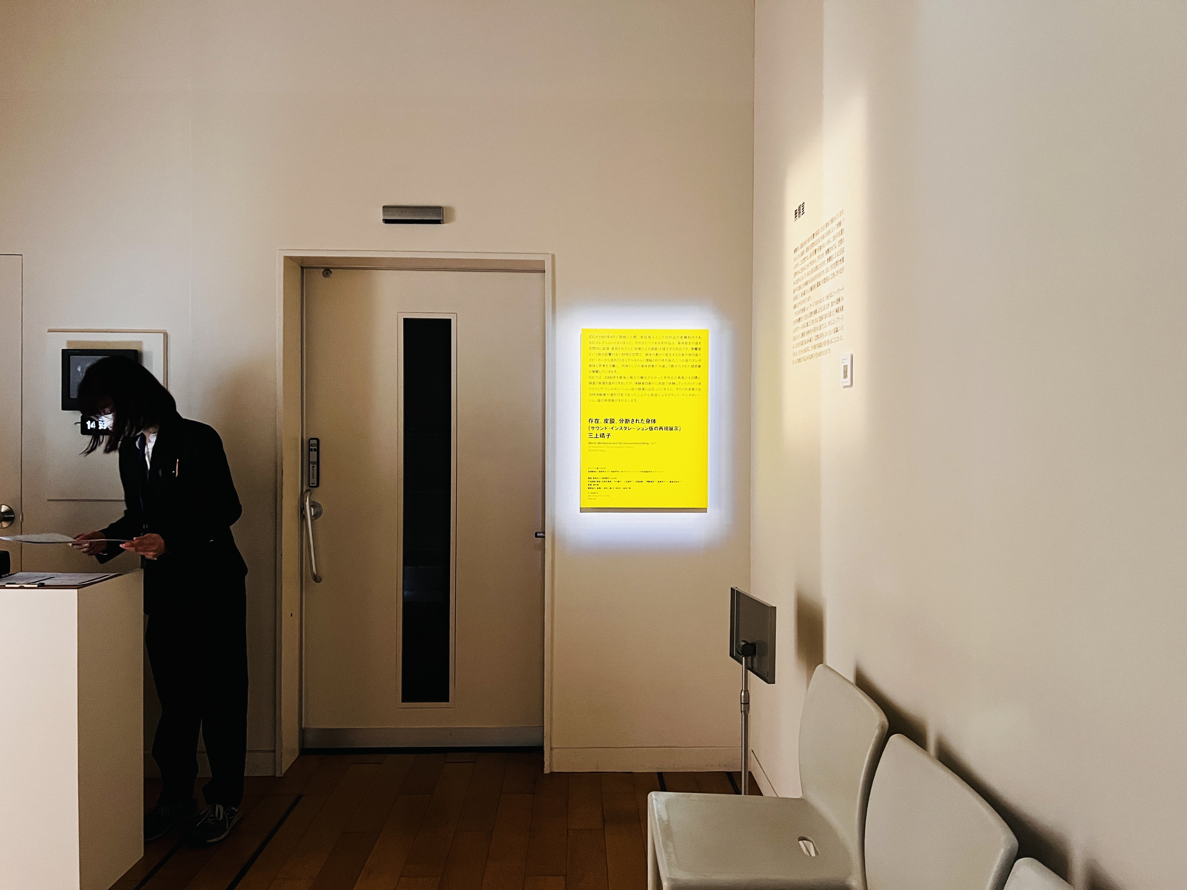 なお、ICCの象徴的な空間として親しまれている無響室だが、もともとこの三上の《存在,皮膜,分断された身体》のために設置されたという経緯がある。本展はICCが1997年4月に開館した際に、常設展示としてアーティストらに委嘱制作された10作品のうちのひとつだ。