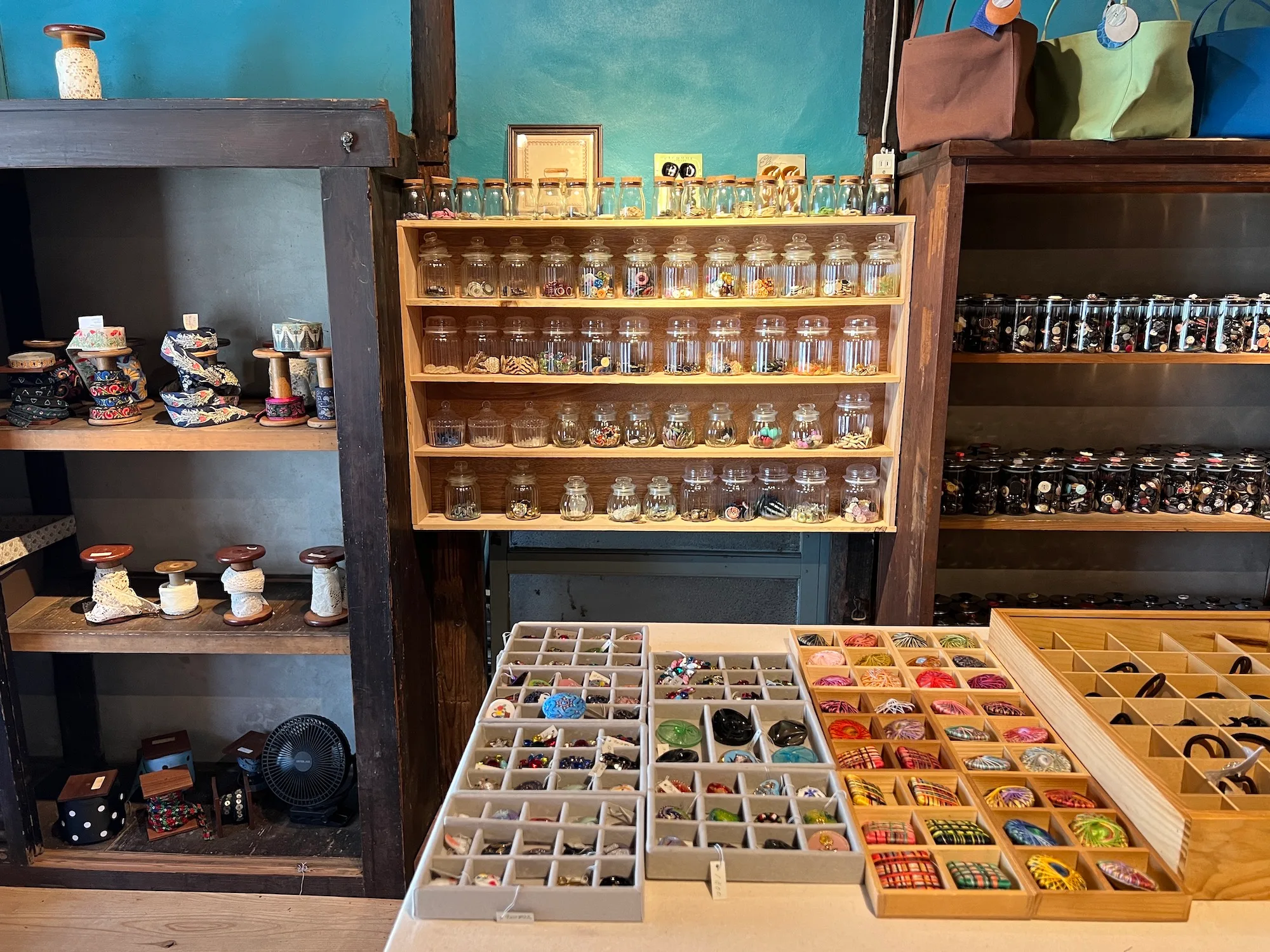 隣の部屋では高松市にある手芸店、ボタンのアカネヤの協力のもと、美しくかわいいボタンやアクセサリーも販売している。