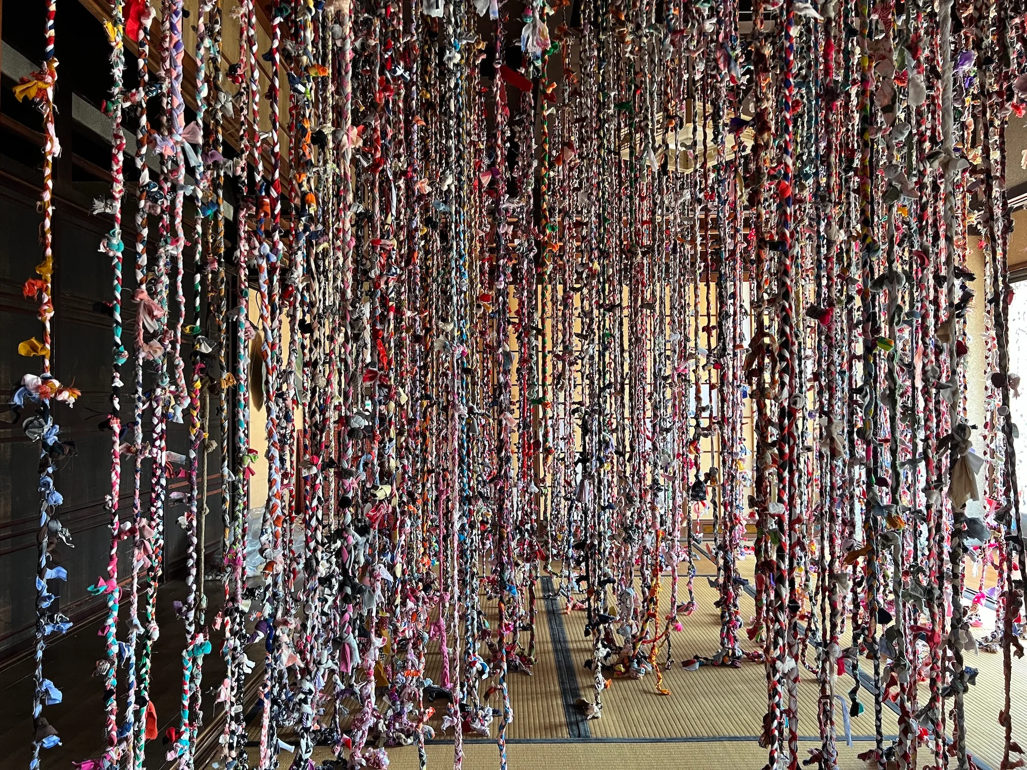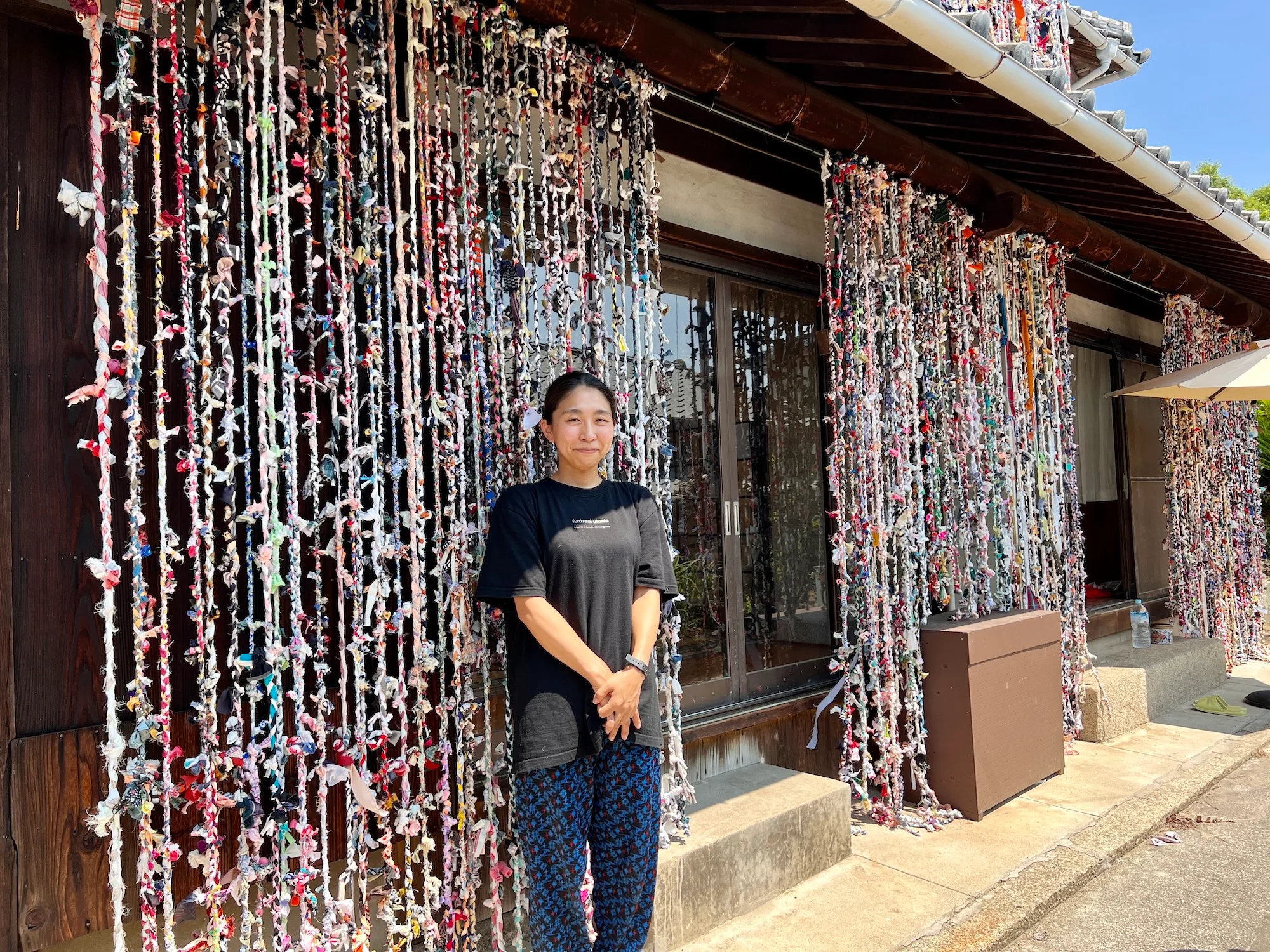 大川友希《結ぶ家》(2022)も春会期から公開された作品。地元の人たちや来場者が持ち寄る古着を短冊状にし、それを作家やワークショップ参加者がつなぎ合わせたもので、空き家を覆ったインスタレーション。身に見えない記憶がテーマで、「私の記憶、古い家の記憶、この地域の記憶をつなげていくような作品」(大川友希)。