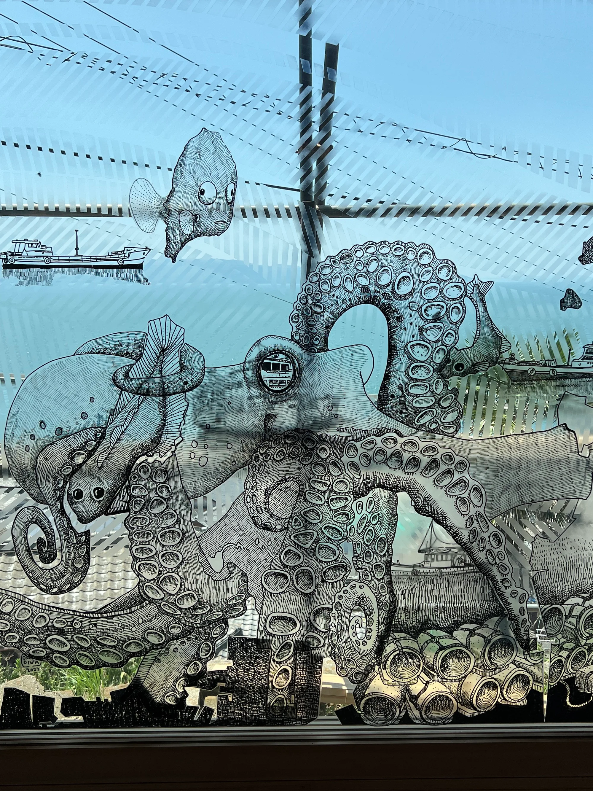 海を一望できる高台に建てられる「男木島パビリオン」(2022)は、坂茂による建築設計。その壁とガラス窓に、大岩オスカールが瀬戸内のイメージを描く。それぞれ絵が描かれた3枚のガラスをスライドして重ね合わせると、ひとつのイメージが現れると言う楽しい仕掛けも。