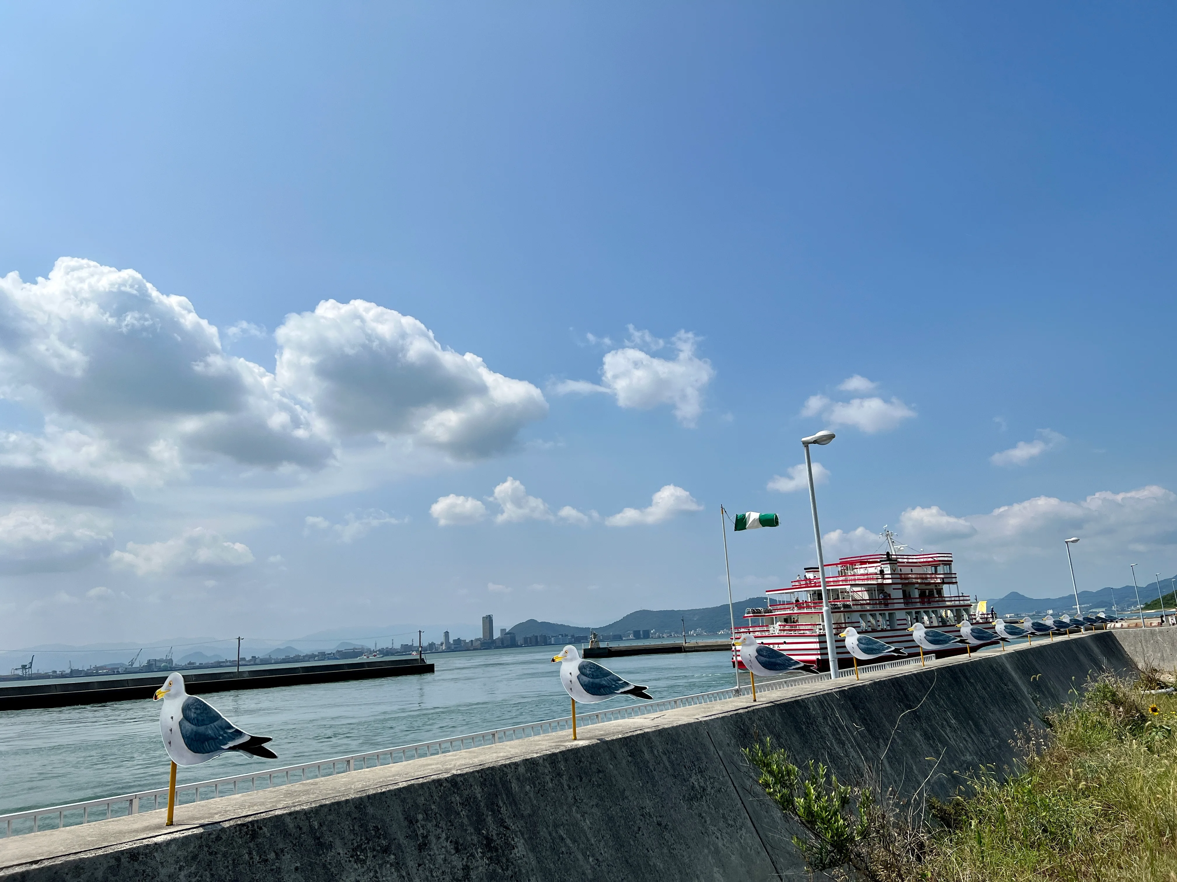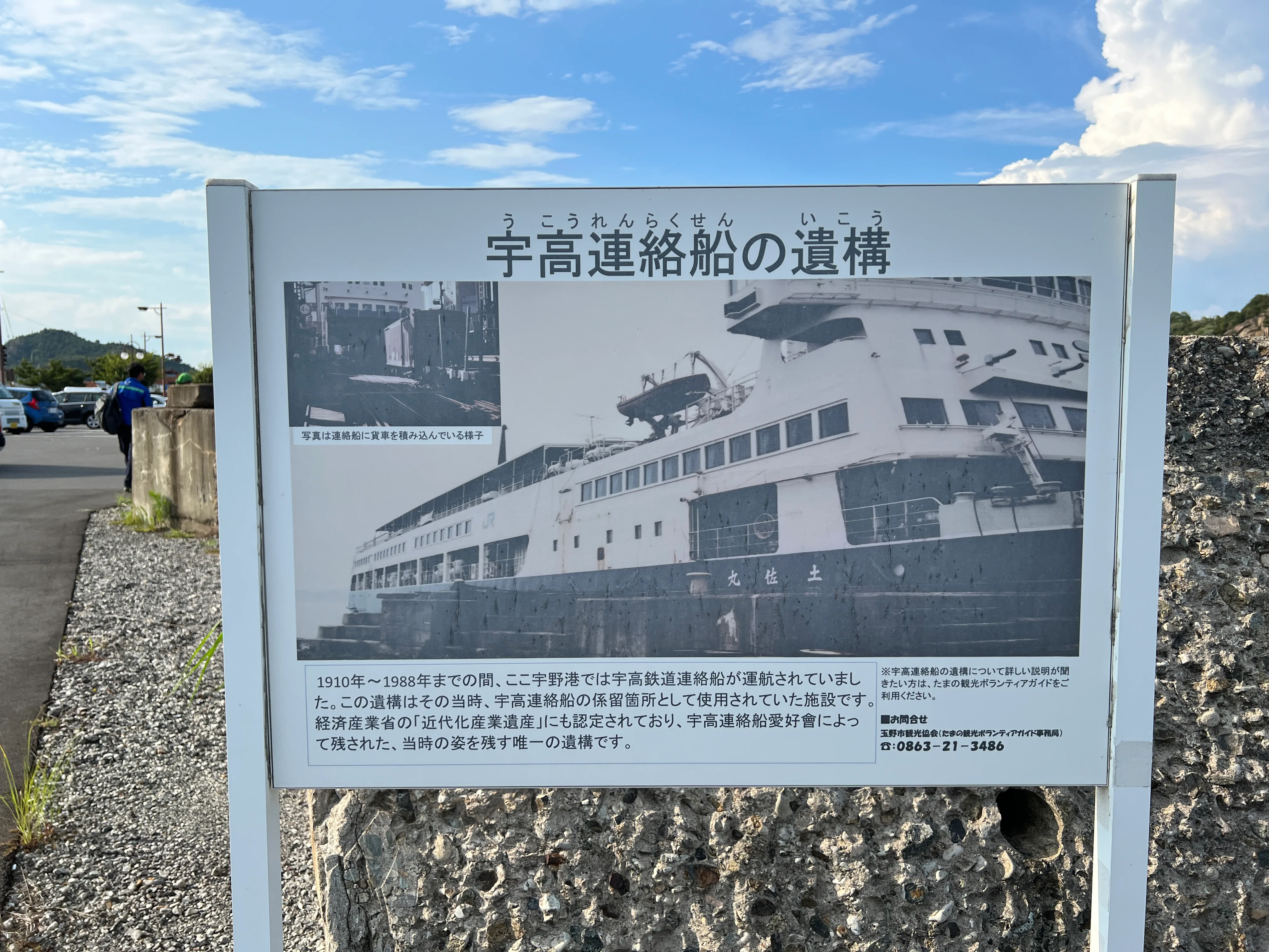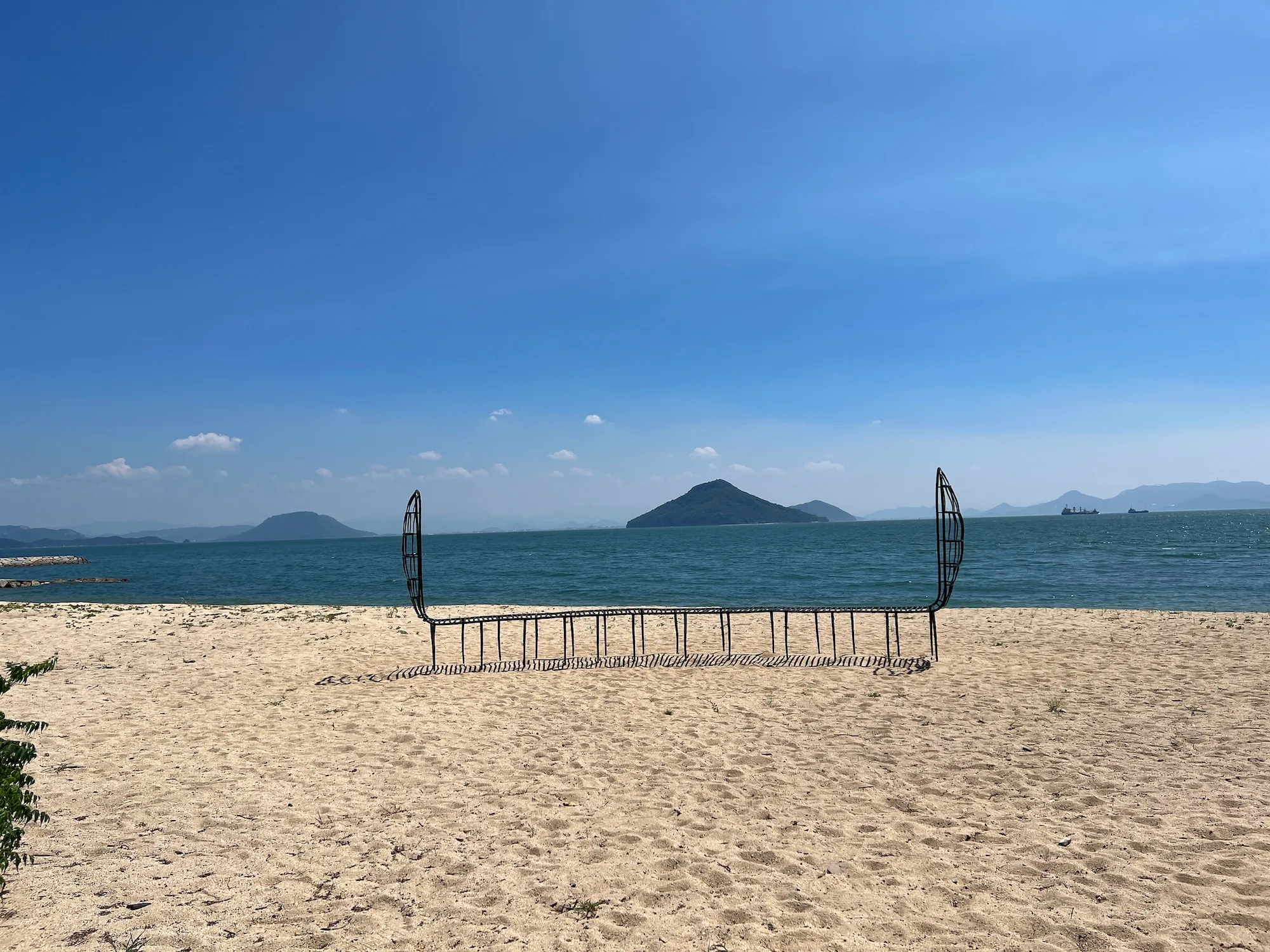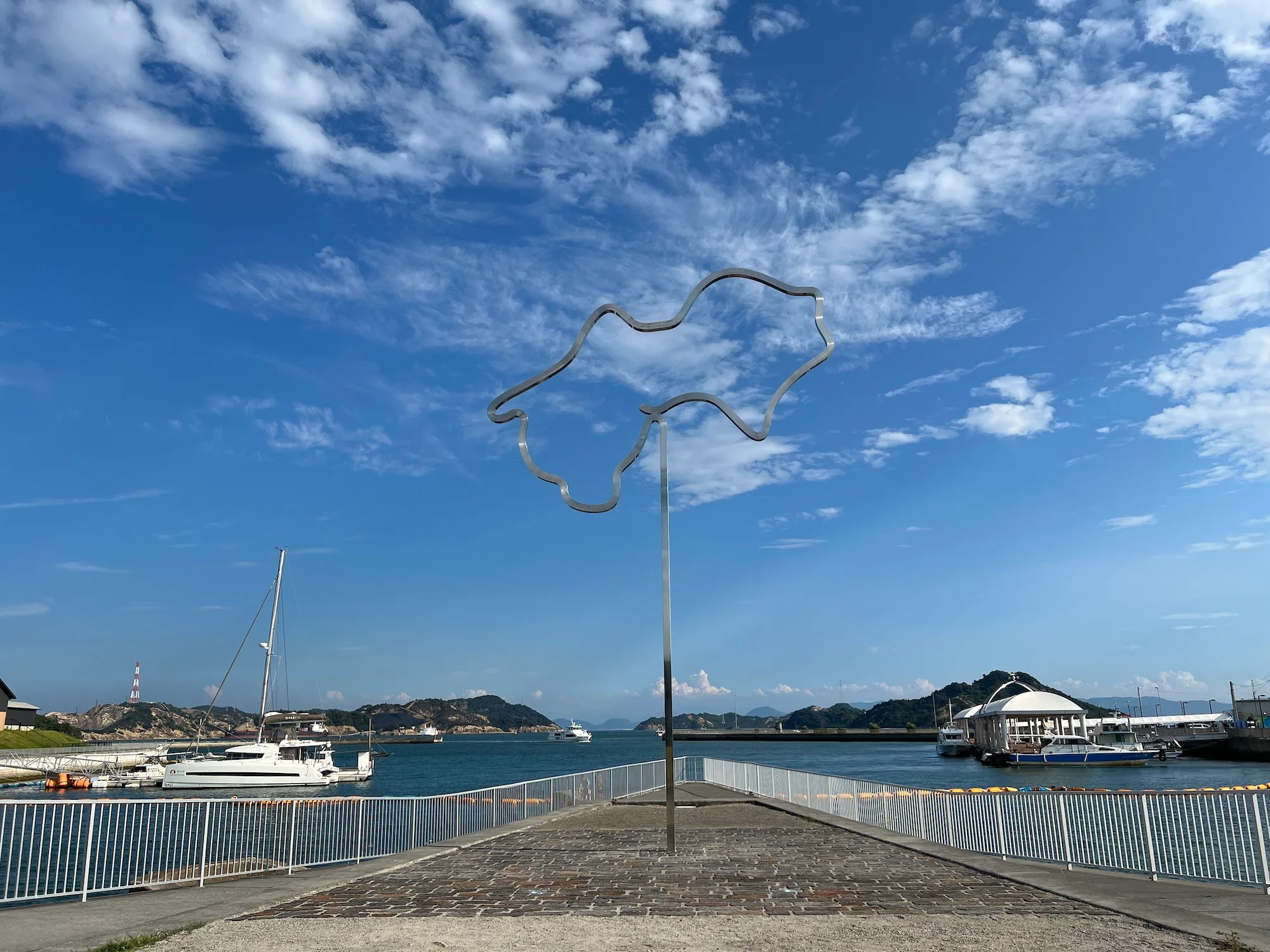 直島の宮浦港を出て船で20分ほど。この日最後の目的地である、岡山県の宇野港へ到着した。ここには夏会期から、アイシャ・エルクメンによるモニュメント作品《本州から見た四国》が設置された。高さ8m、横幅5mほどの本作が立つここ宇野港では、かつて宇高連絡船が運行されていた。岡山県玉野市の宇野駅と香川県高松市の高松駅との間を結んでいたが、1988年に瀬戸大橋が開通したことでその役目を終えたと言う。本作はかつて宇高連絡船が発着した宇野港の向かいにある四国のかたちを、金属製のパイプを使って1本の線で描いたものだ。作品の近くには宇高連絡船の遺構も残されている。