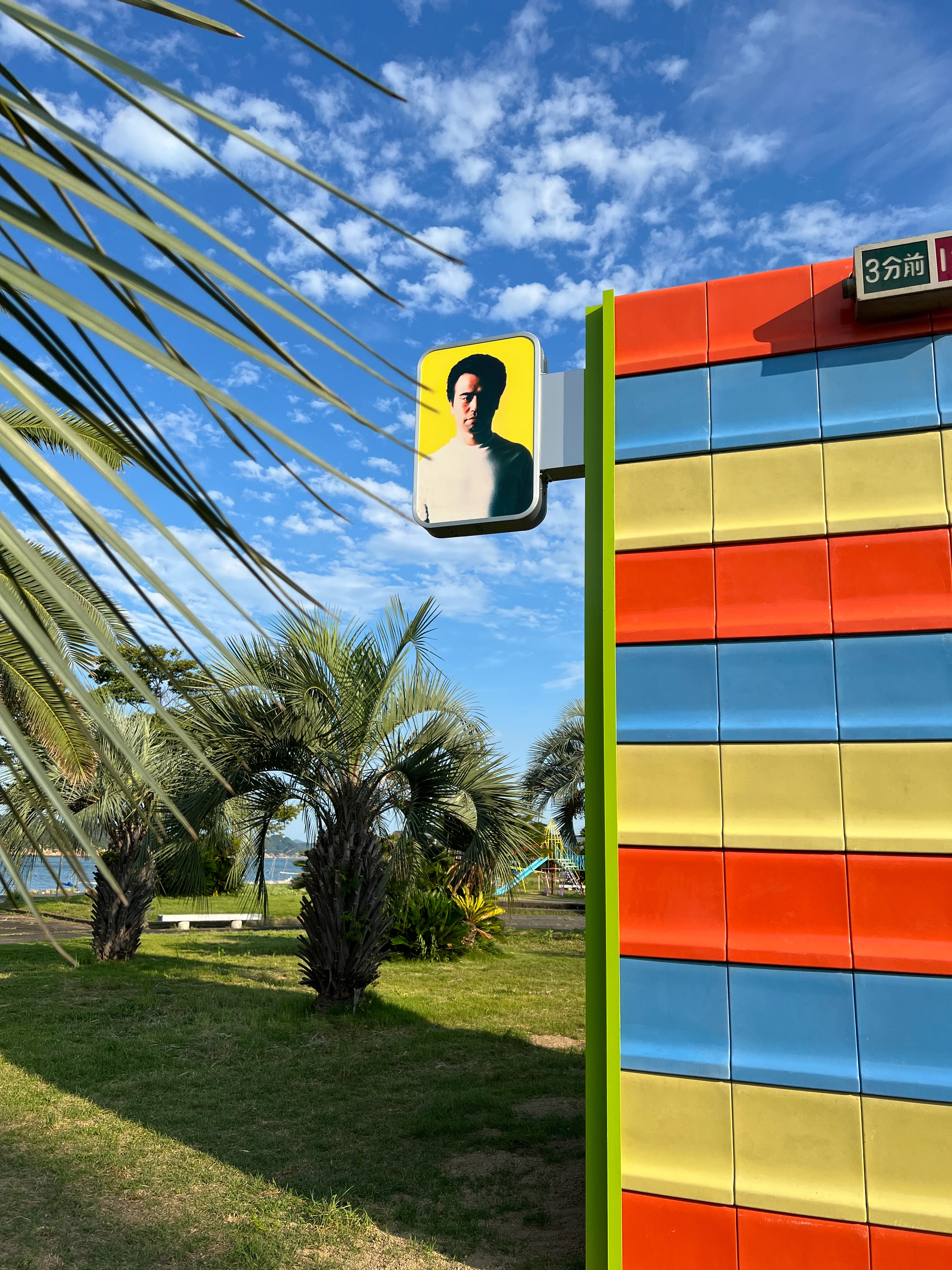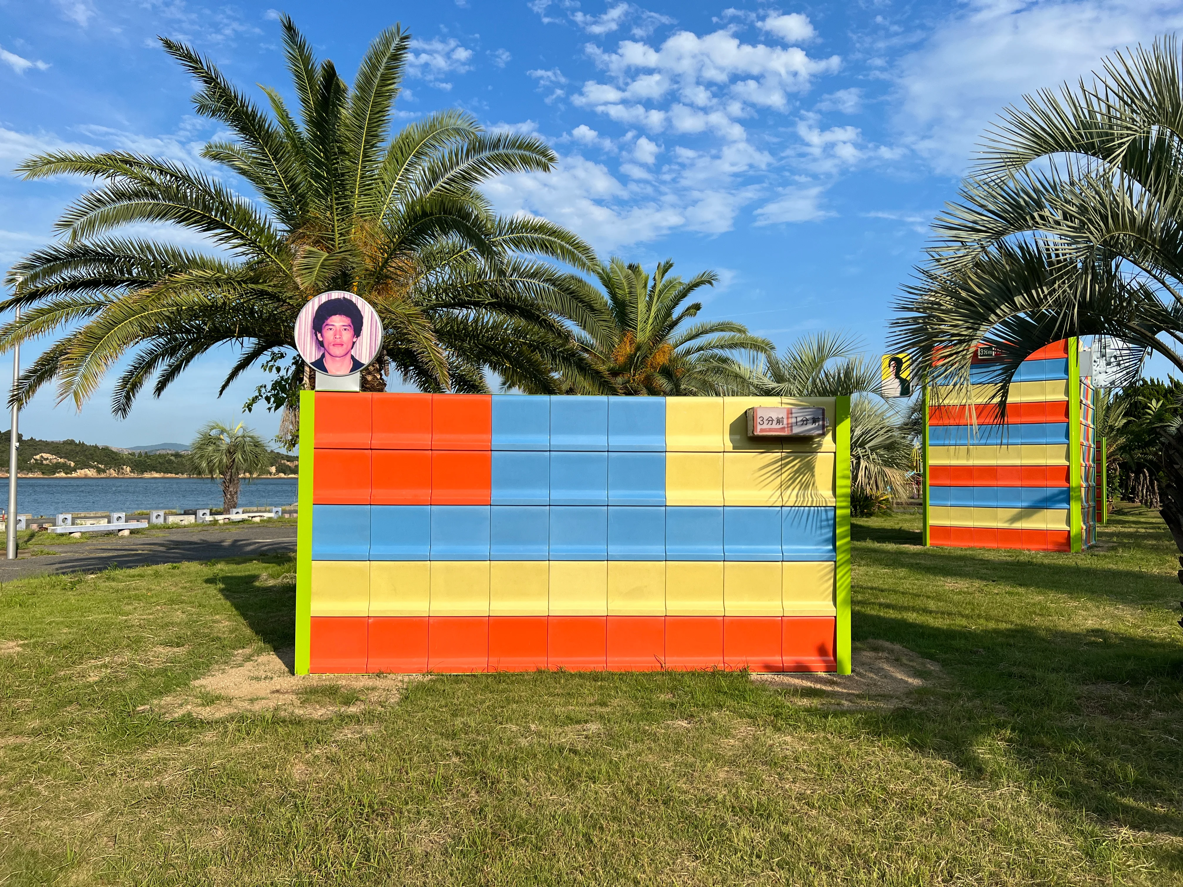 玉野競輪場が改修工事を行った際に出てきたスタンドの椅子や看板など、競輪施設で使われていた素材を使って彫刻作品を制作した。彫刻の大部分を占めるオレンジ・青・黄色のカラフルな部分がスタンドの椅子。そしてその唐突さに目を奪われる男性の顔は、ここで活躍した競輪選手の写真だという。その裏には、新潟で開催される「大地の芸術祭」に作家が参加した際に撮影した雪景色の写真がはめ込まれており、ヤシの木が並ぶ海沿いの公園で異質な雰囲気を醸している。まったく異なる場所が不意につながるような、ちょっと不思議な空間で夕焼けを浴びながら、トリップ感のなかでツアーは終了した。