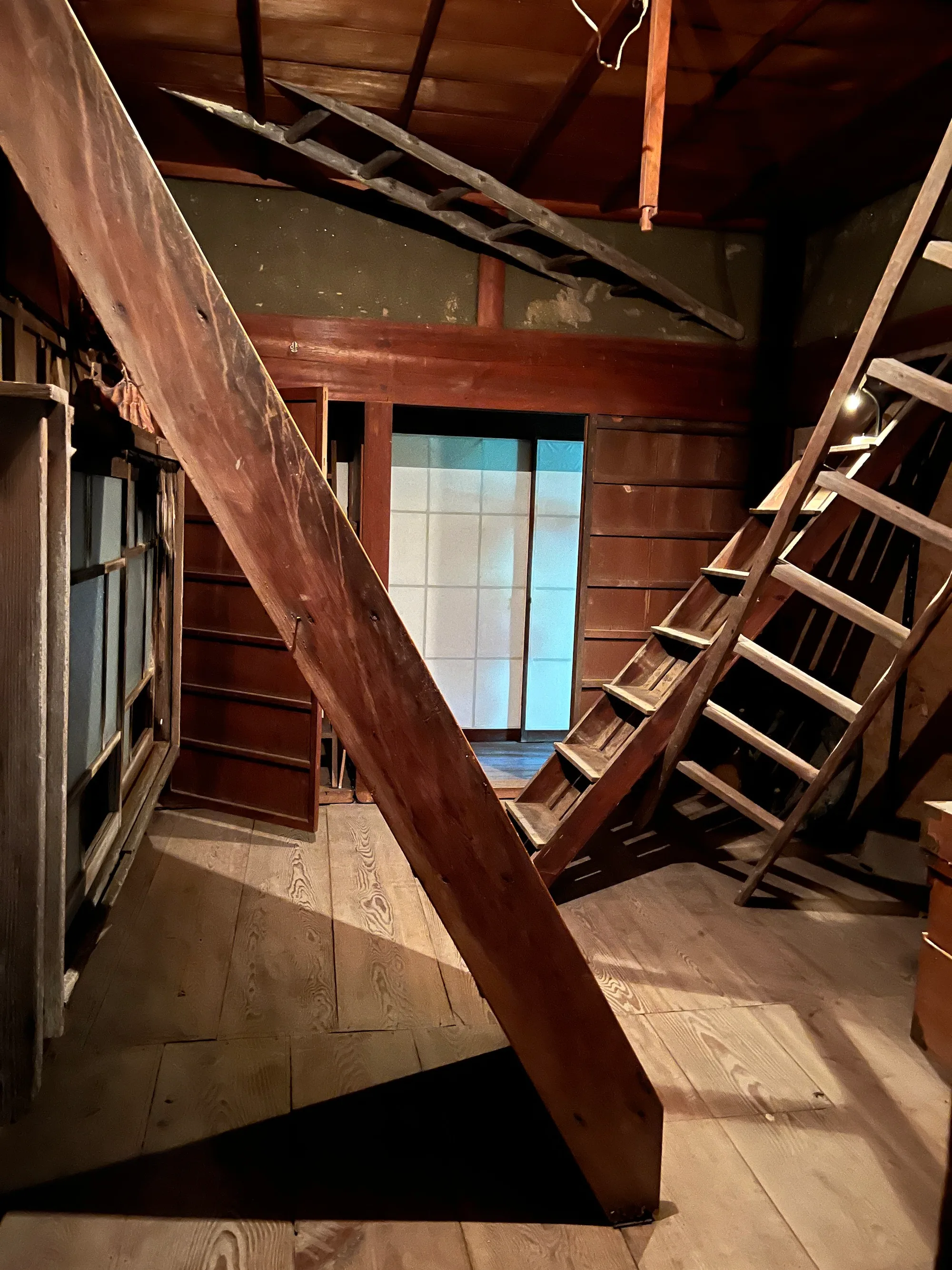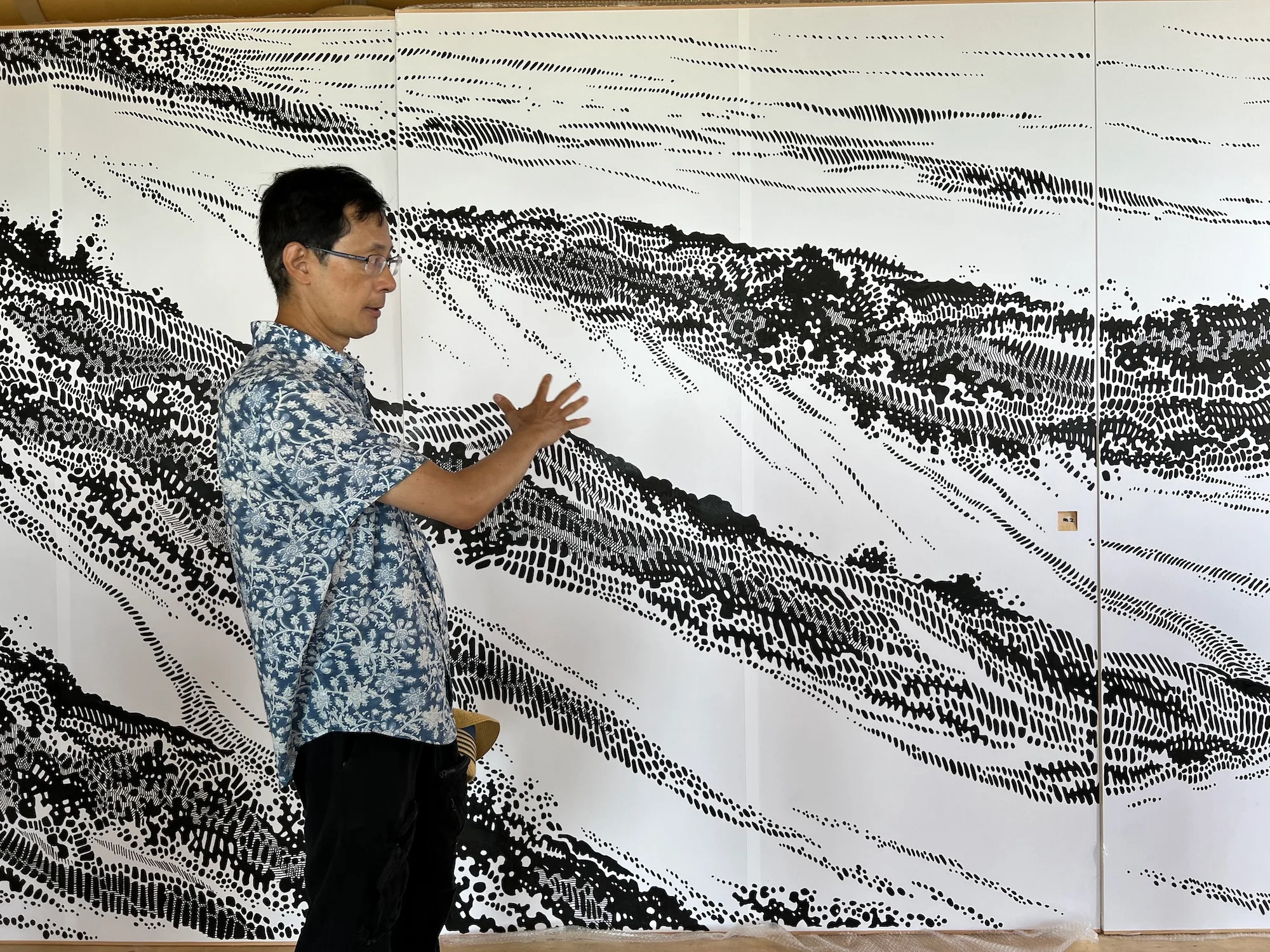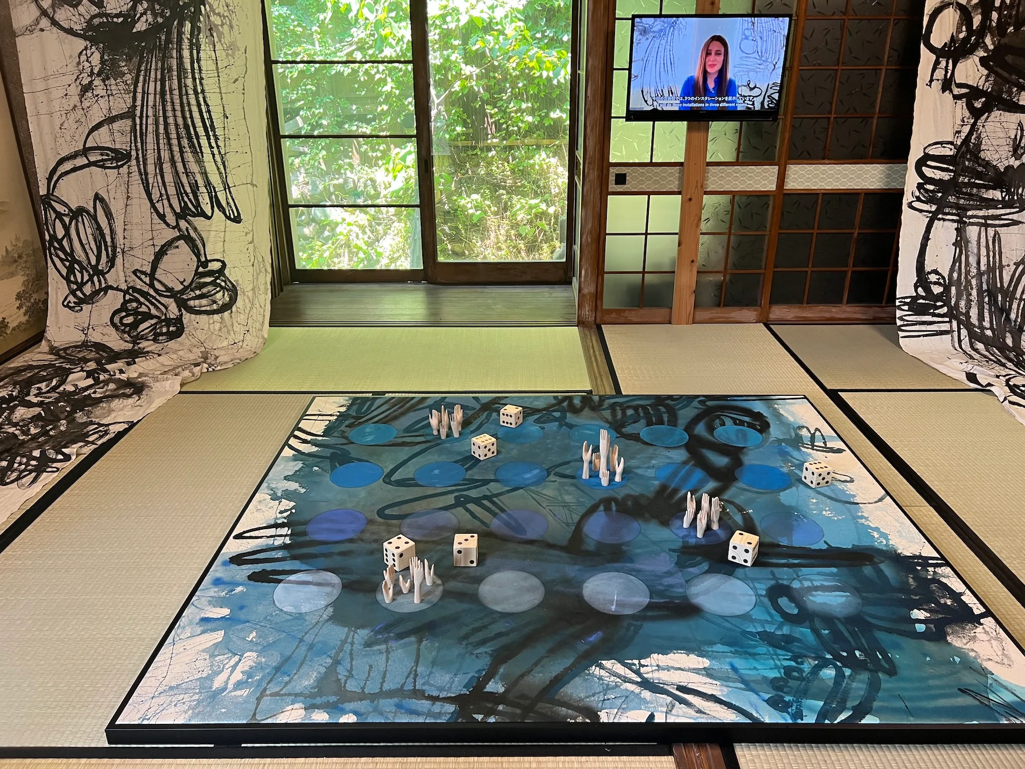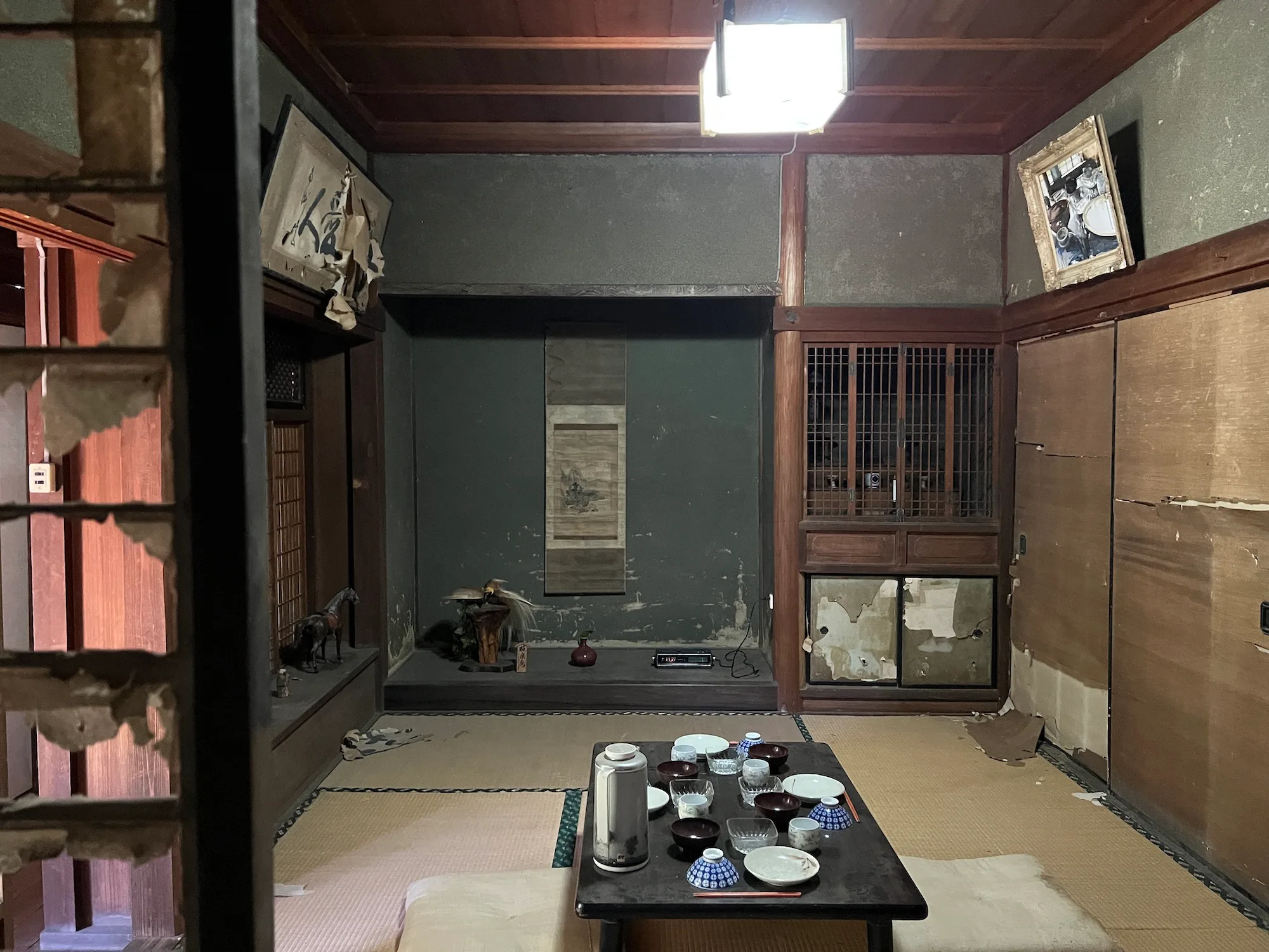 今回プレスツアーが訪れたのは、島の南側にある甲生エリアに登場した、冨安由真の新作《かげたちのみる夢(Remains of Shadowings)》(2022)だ。本作は、築100年あまりの朽ちかけた古民家をまるまる使った没入型作品。舞台となる特定の場所と、そこを描いた絵画が入れ子状態になるような幻想的なインスタレーションを発表し、近年大きな注目を集める冨安だが、今回は小泉八雲『和解(The Reconciliation)』に着想を得たと言う。「記憶」をテーマに、ここで暮らしてきた人々の記憶の残像が漂う、現実と非現実のはざまのような空間を作り上げた。展示の最後まで驚きがあるので、注意深く歩を進めてほしい。