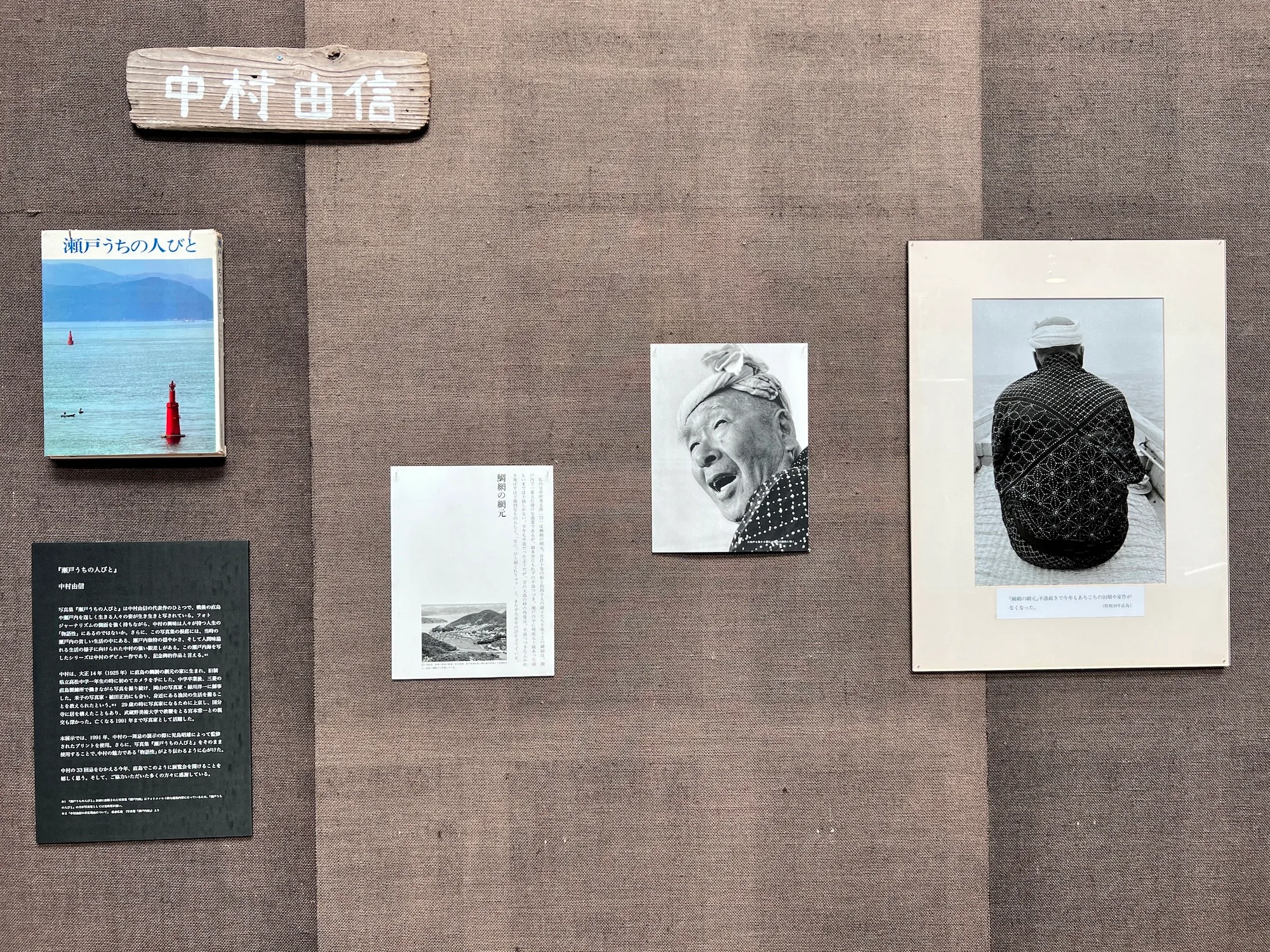 そしてこの夏〜秋会期に開催されるのが、瀬戸内「中村由信と直島どんぐりクラブ」資料館だ。中村由信(なかむら・よしのぶ、1925~1990)は直島出身の写真家。そして中村が属していた直島の写真団体が「直島どんぐりクラブ」だ。中村はこの資料館の最初の展示で焦点が当てられた写真家・緑川洋一に師事し、1955年に上京して写真家として活躍。『忘れられた日本人』などで知られる民俗学者・宮本常一とも親交を結んだ。下道は中村について「貧しいなかで暮らした瀬戸内の人々を泥臭く撮影した。(戦後復興の時代のなかで)自身の親たちの世代にあたる、忘れられていく人々の姿を職業ごとに残した」「フォトジャーナリズムの手法を感じさせながら、その写真には『物語性』がある」と説明。本展では写真集『瀬戸うちの人びと』から、中村の父親である鯛網の網元をはじめ、産婆さん、郵便屋さん、世話焼き婆さん、医師、といった人々を写した写真が展示された。