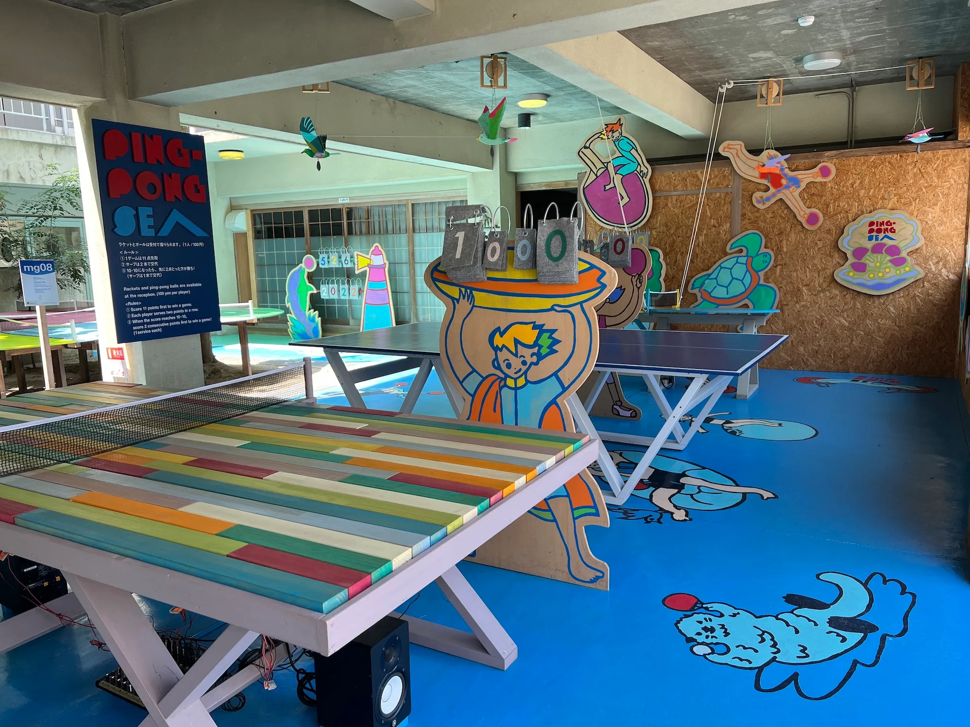 「寿荘」は、女木島名商店街の心臓部となるインフォメーション&総合レジカウンター。かつて民宿だったこの建物のピロティは、いわば海の家のテーマパーク的な場所。原倫太郎+原游《ピンポン・シー》やレアンドロ・エルリッヒ《ランドリー》など2019年に制作された人気作に加え、今年からの新作も公開されている。
