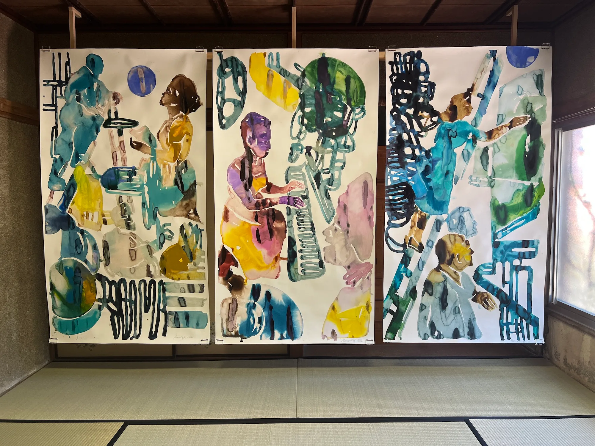 ロシア出身のアーティスト、エカテリーナ・ムロムツェワは古民家を舞台に3作品を発表。《学校の先生》(2022)は、作家が様々な人たちから聞き取った「学校の先生」のエピソードに基づくドローイングだ。また男木島の子供たちと行ったワークショップの成果も見ることができる。これらの作品はすべて「子供時代」に捧げられたものだという。