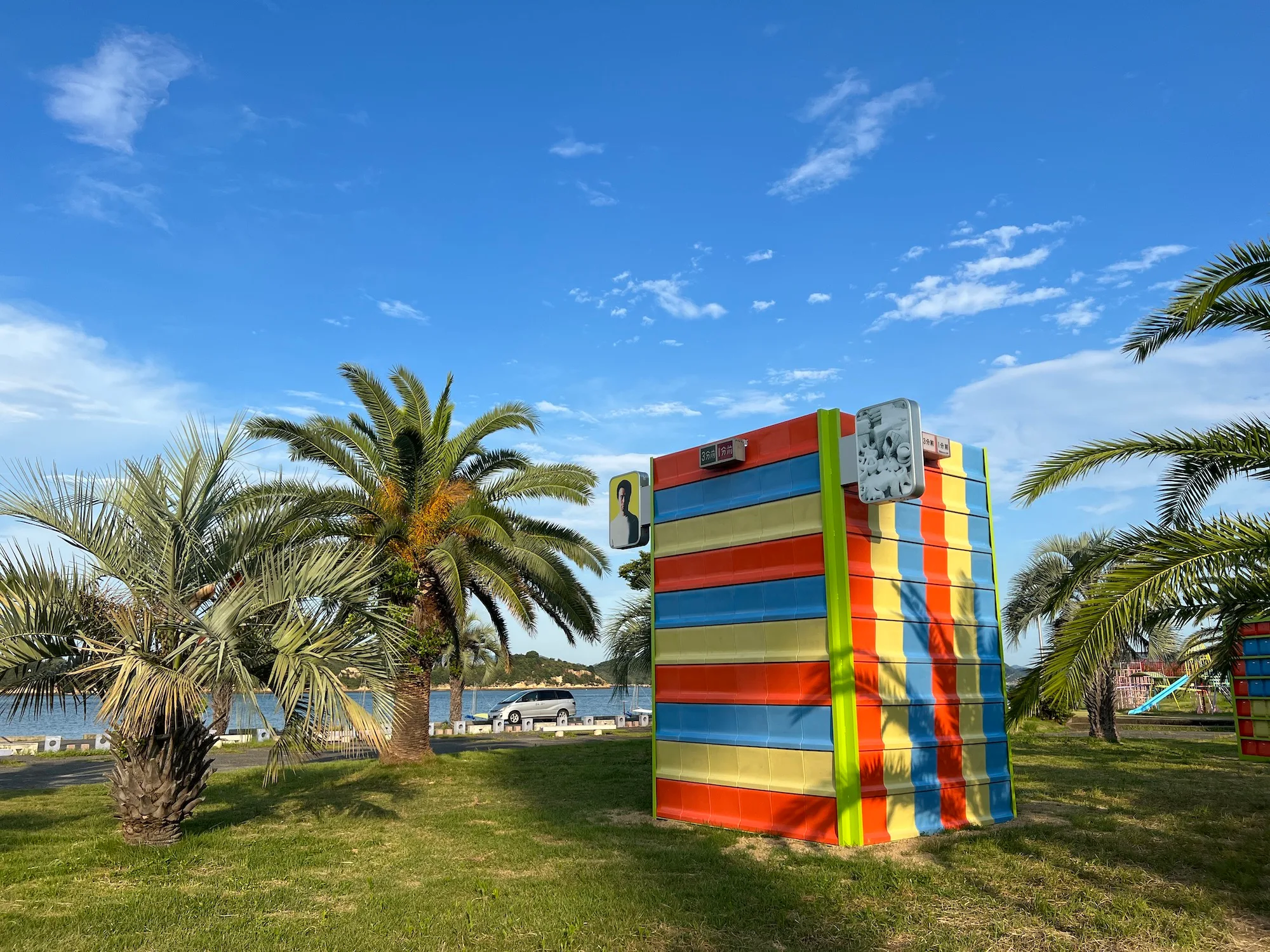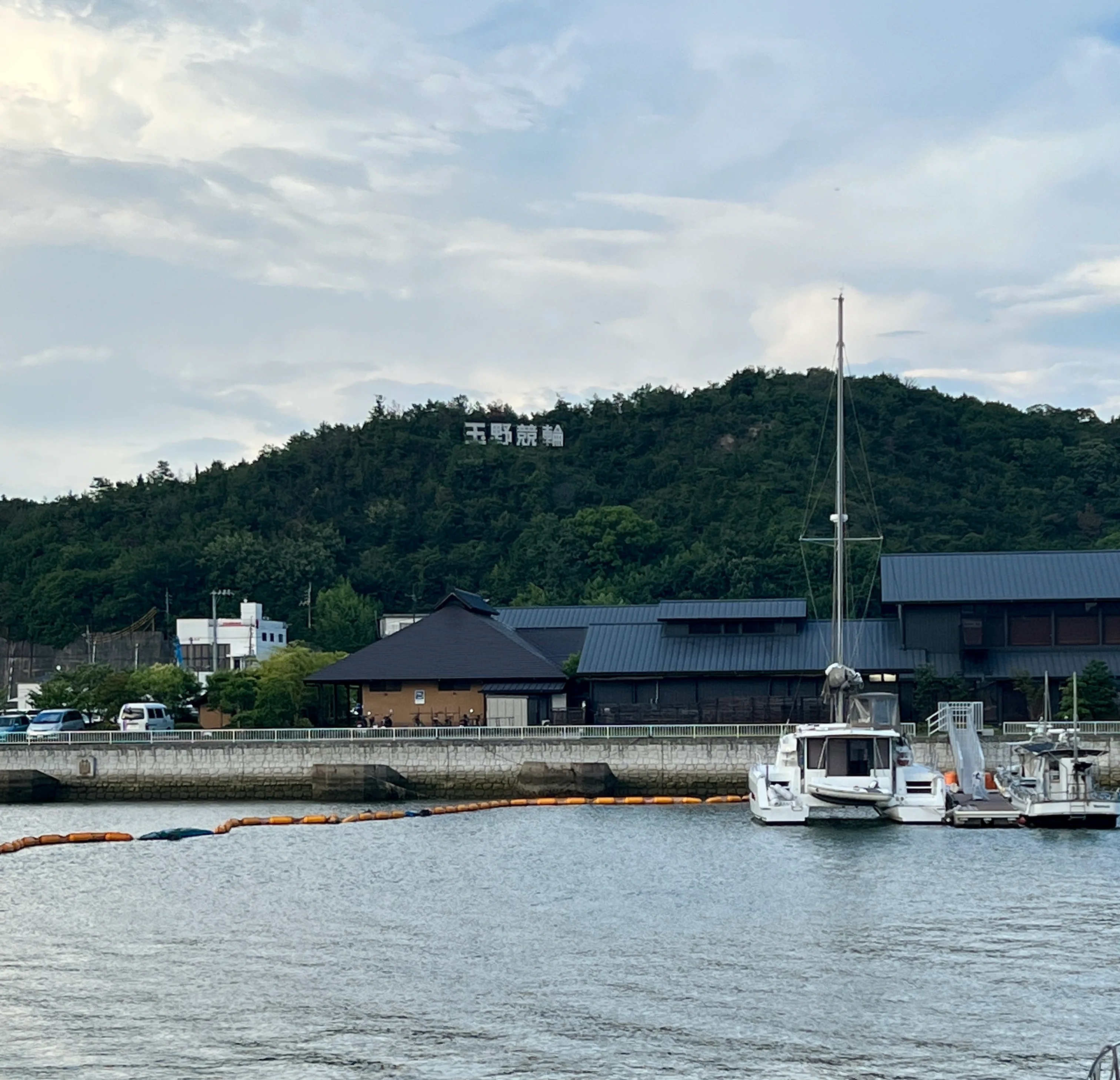 港からふと丘の上を見上げると、そこには「玉野競輪」の文字が。ここ宇野港に1950年に開設された玉野競輪場の看板だ。観客席から瀬戸内海を見渡せるという素晴らしいロケーションを誇るこの競輪場の隣にある日の出公園では、金氏徹平が作品《S.F. (Seaside Friction) 》(2022)を展示する。