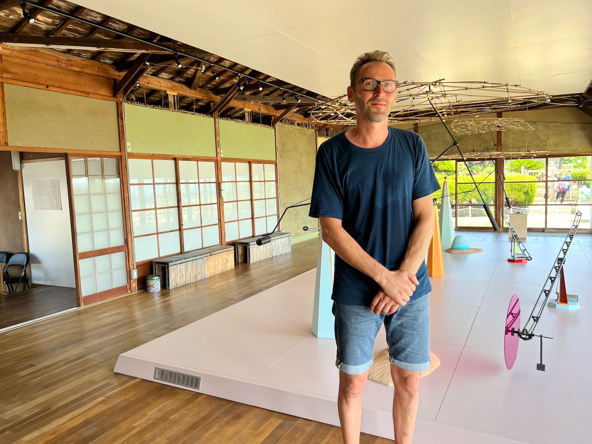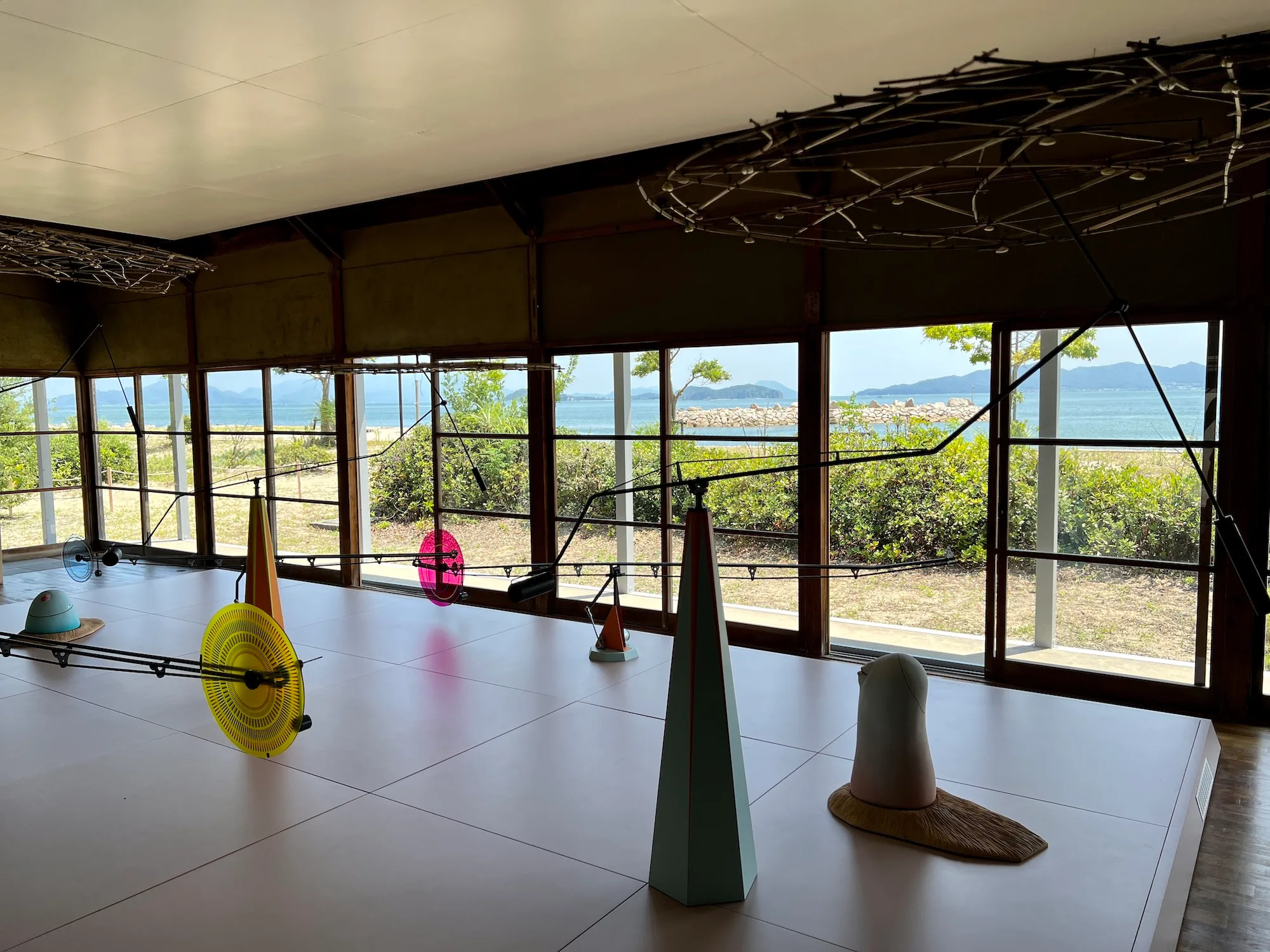 ニコラ・ダロ《ナビゲーションルーム》(2022)も夏会期から公開。海水浴場として知られる女木島のビーチ沿いにある旧海の家が舞台だ。室内に用意されたベンチに腰掛け、キネティックなオブジェとその奥に広がる瀬戸内海の風景を望む。天体の動きから発想された作品で、12か月に対応する曲を奏でるオルゴールの音色が空間に溶け込んでいく。「内と外の風景が融合するというコンセプト」(ニコラ・ダロ)から生まれた本作を眺めながら、しばし心と体を休めたい。