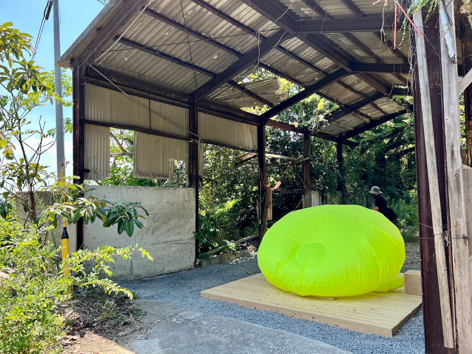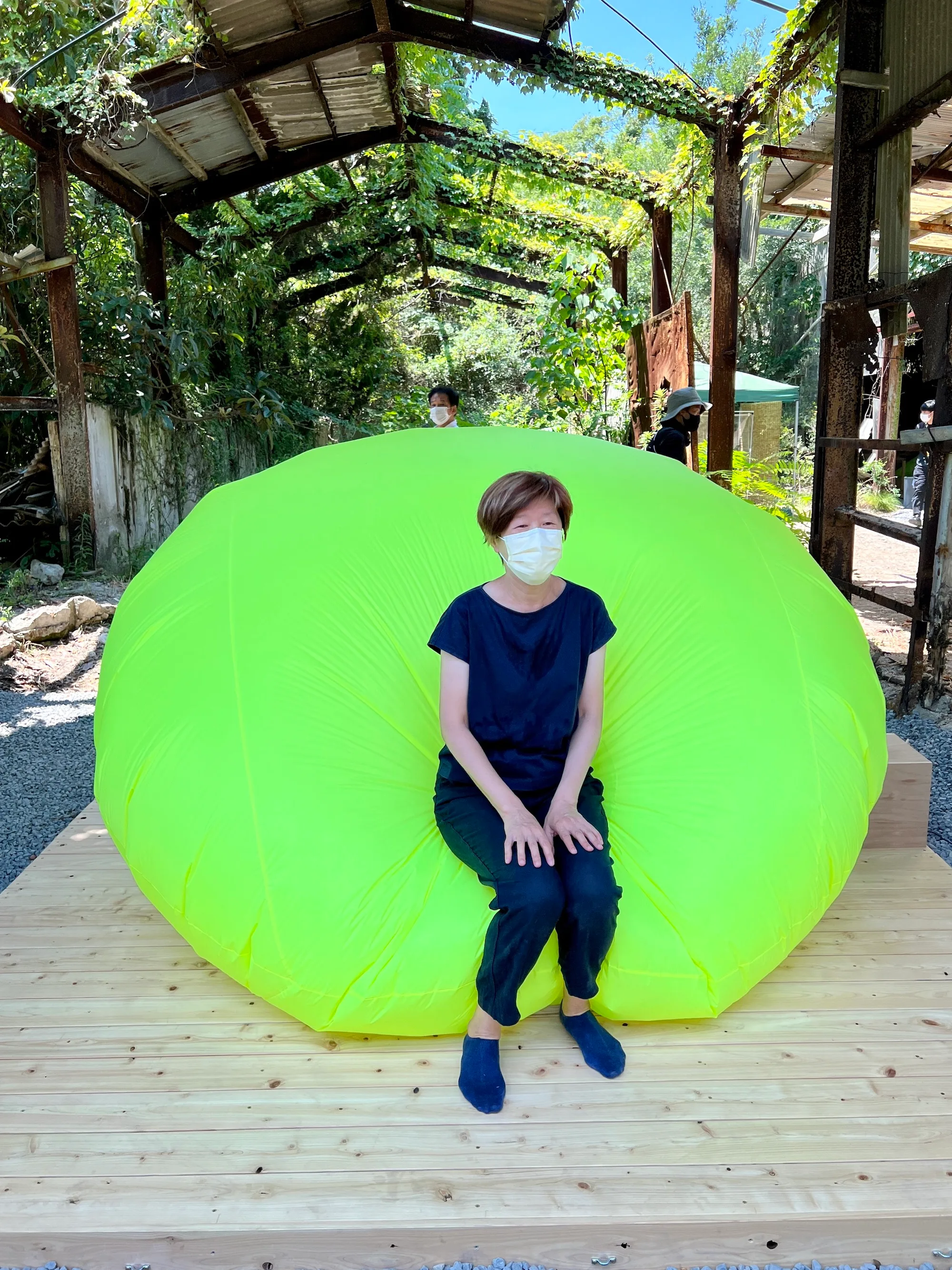 険しい坂道を登ると、鮮やかな黄色の立体物が目に入る。夏会期から公開されるワン・テユ(王德瑜)《No.105》だ。大きな風船状のオブジェの中には椅子が設置されており、鑑賞者は靴を脱いで座ることができる(繊細な作品なので、全体重をかけないようにお気をつけて)。瀬戸内海の名産品であるレモンから着想を得たという黄色が、森の緑、海と空の青といった周囲の景色のなかでよく映える。