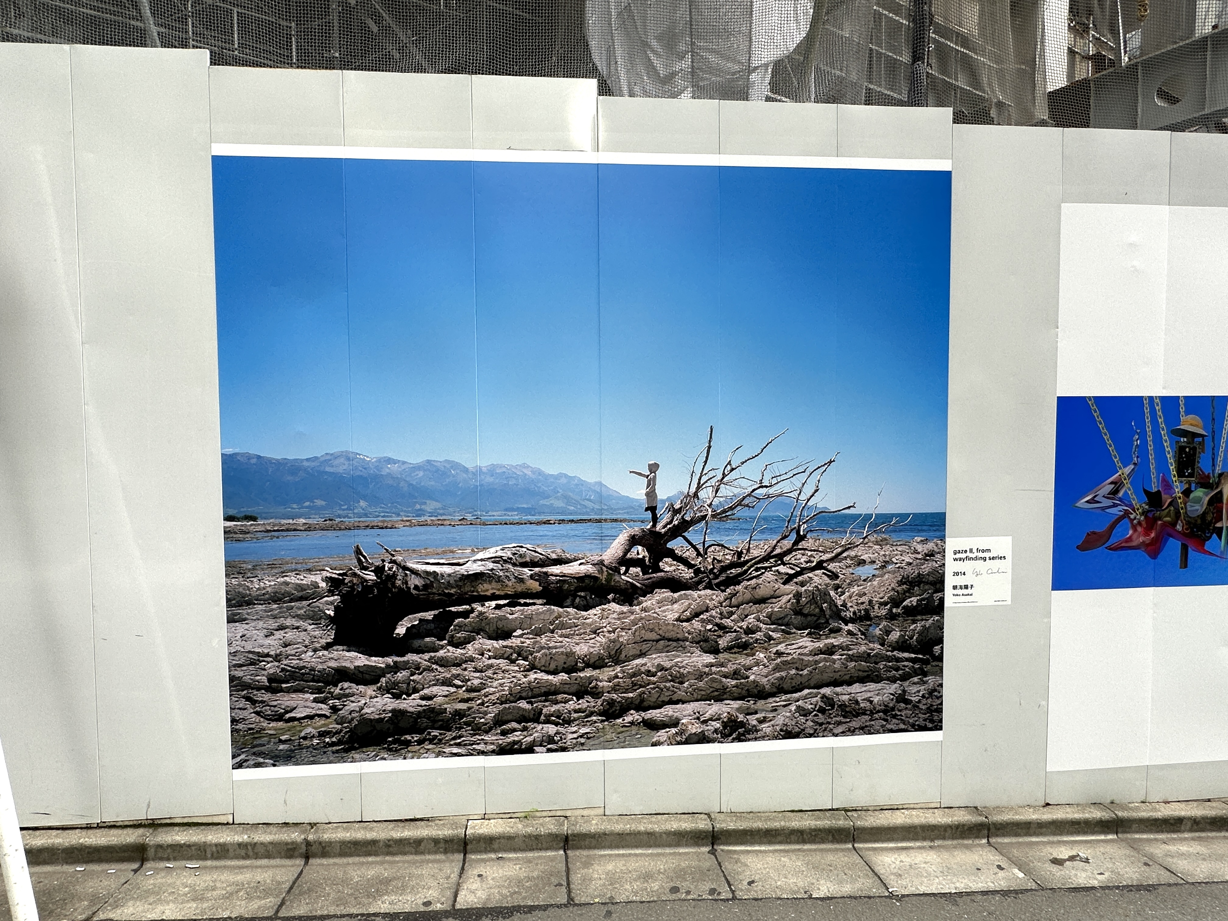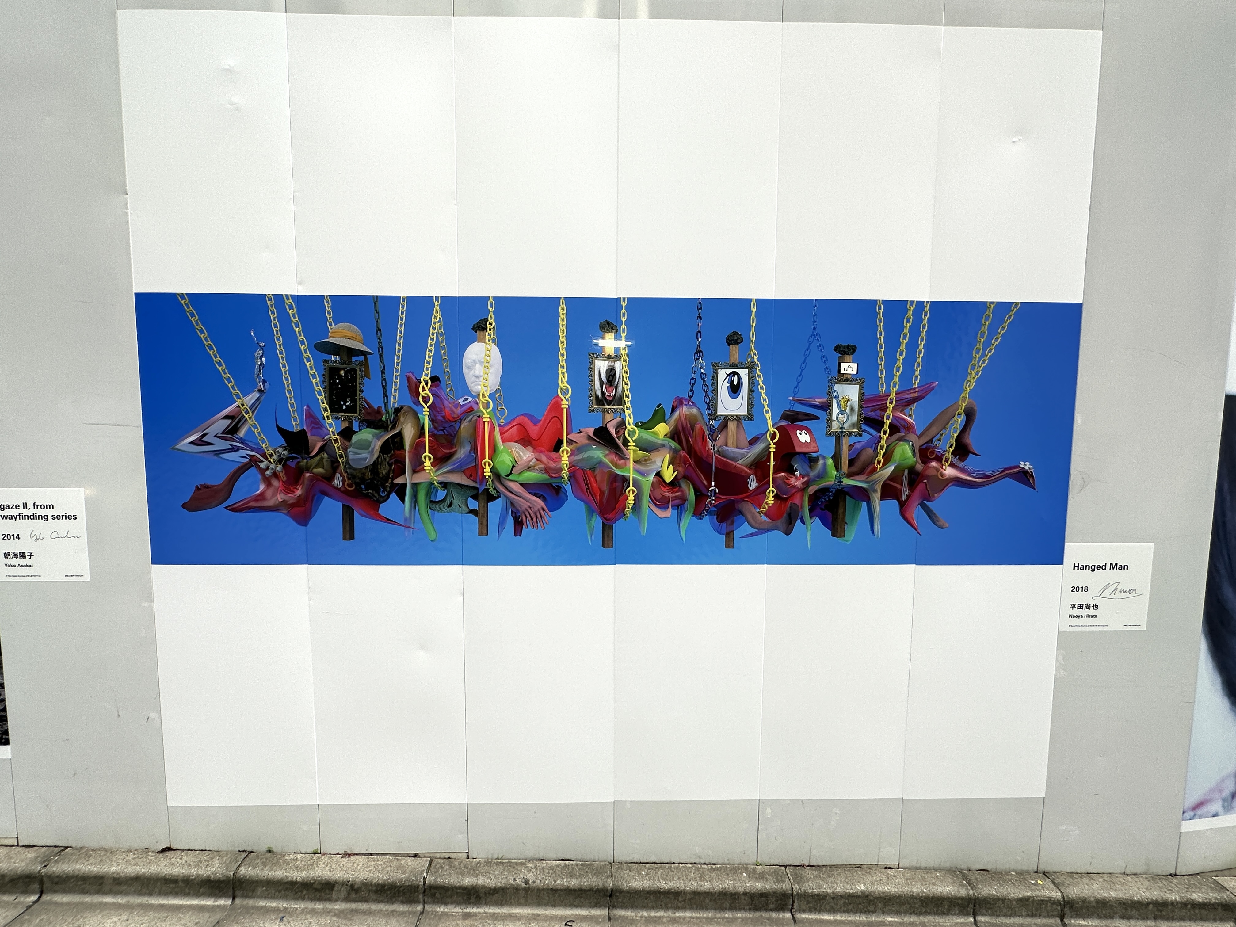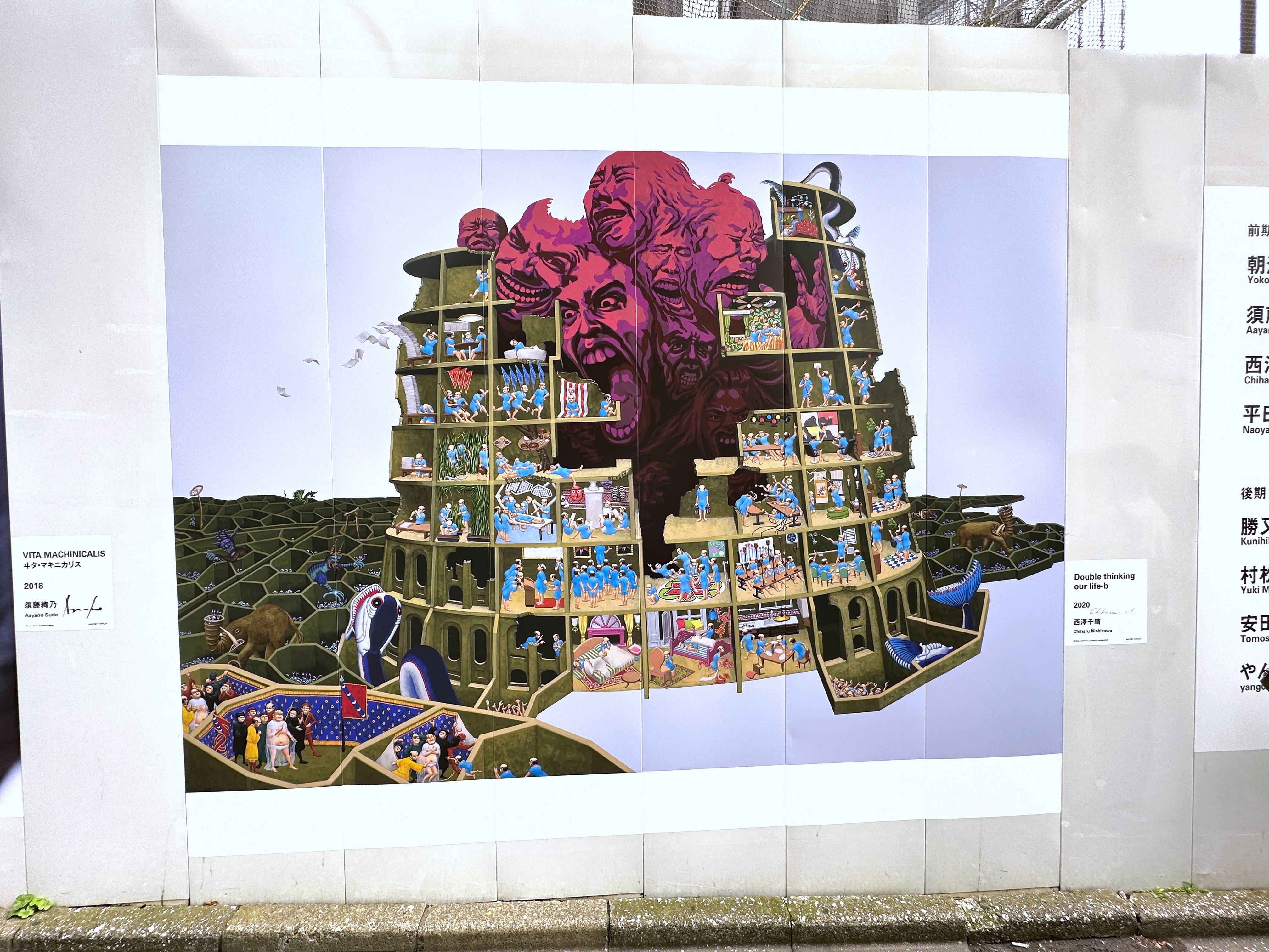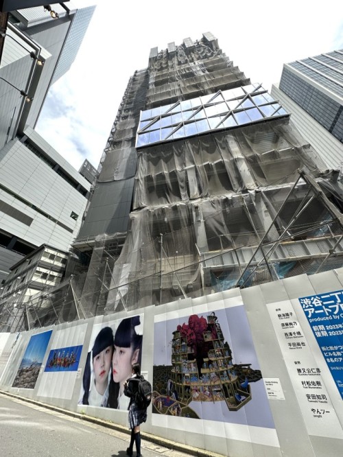 渋谷駅東口エリアにあり、長らく建設工事が行われていた渋谷2丁目17地区。東急が主体となって建てられるこのビルの名称が「渋谷アクシュ(SHIBUYA AXSH)」となることが5月30日発表された。24年度上期の開業までもうしばらく工事が進められる同所の仮囲いで現在、朝海陽子、須藤絢乃、⻄澤千晴、平田尚也の4名が作品を発表している。
