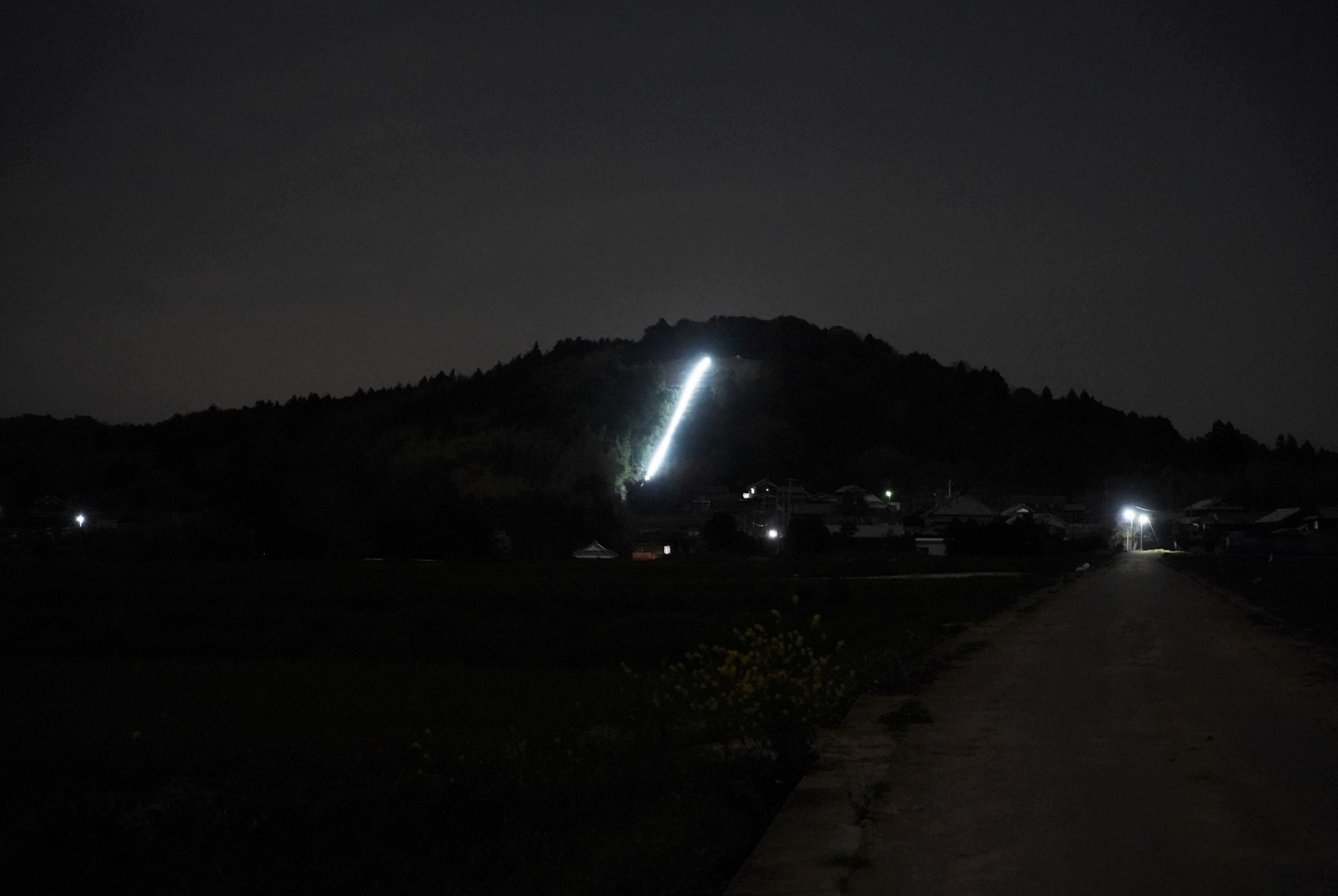 そのかたちから着想を得てつくられたのが、島袋の新作《首飾りー石を持って山に登る》。半島東部にある祇園山の山頂にある同作を見るには、やはり彼の新作である《光る道ー階段のない参道》を登る必要がある。祇園山の頂上には八坂神社跡があり、ここ旭日地区の人たちに現在も親しまれている。晴れた日には伊予灘の向こうに四国・愛媛を臨める土地は、たしかに「あさひ(旭日)」と呼ぶにぴったりだ。お正月や東からまっすぐ日が登る11月10日、住民たちは声かけあって山を登り、美しいご来光を眺めるのだという。かれらの登山の助けとして手すりをつけ、夜になるとそれが一本の光の線として輝くことから、島袋は本作を「光る道」と名づけた。